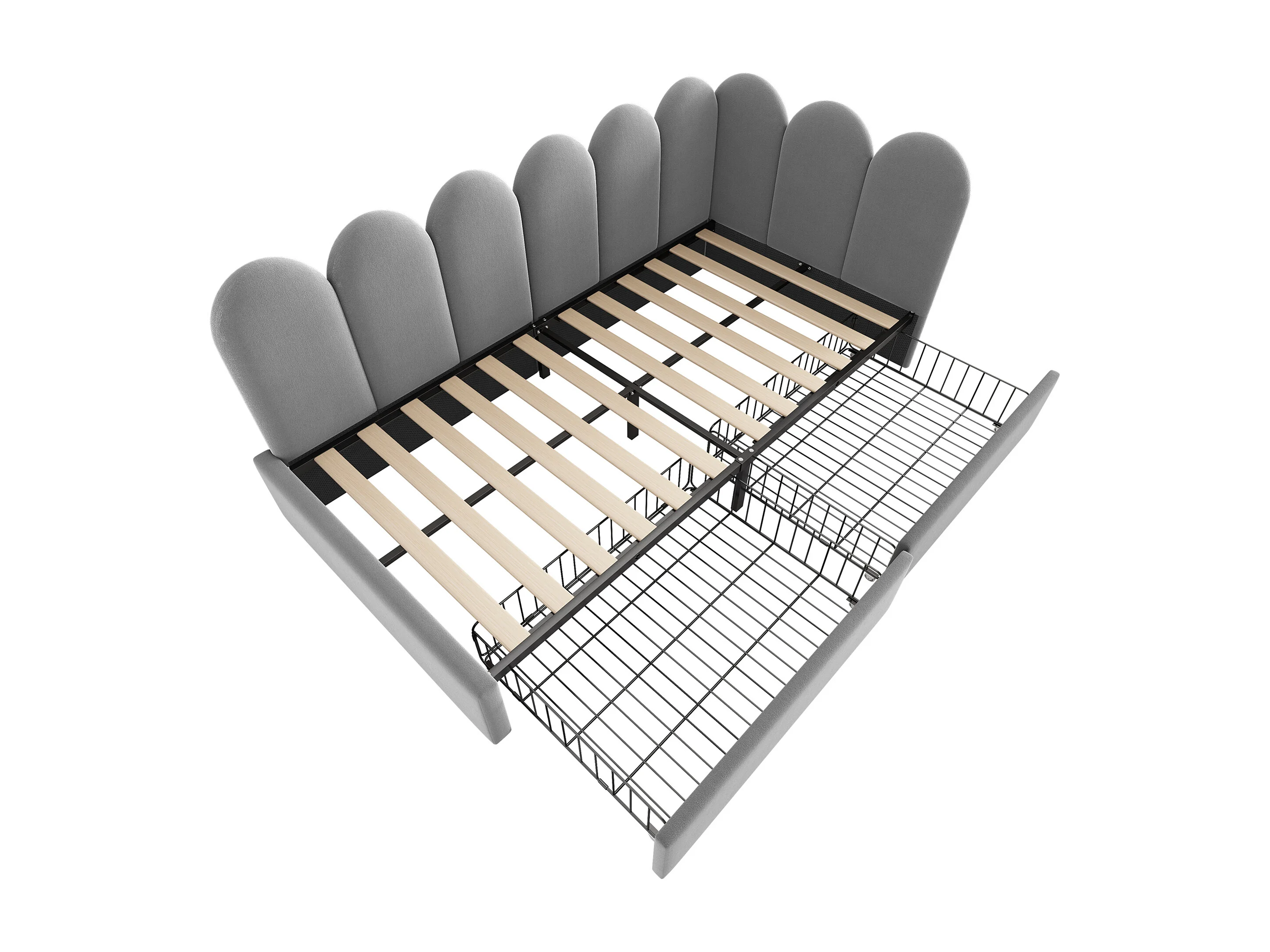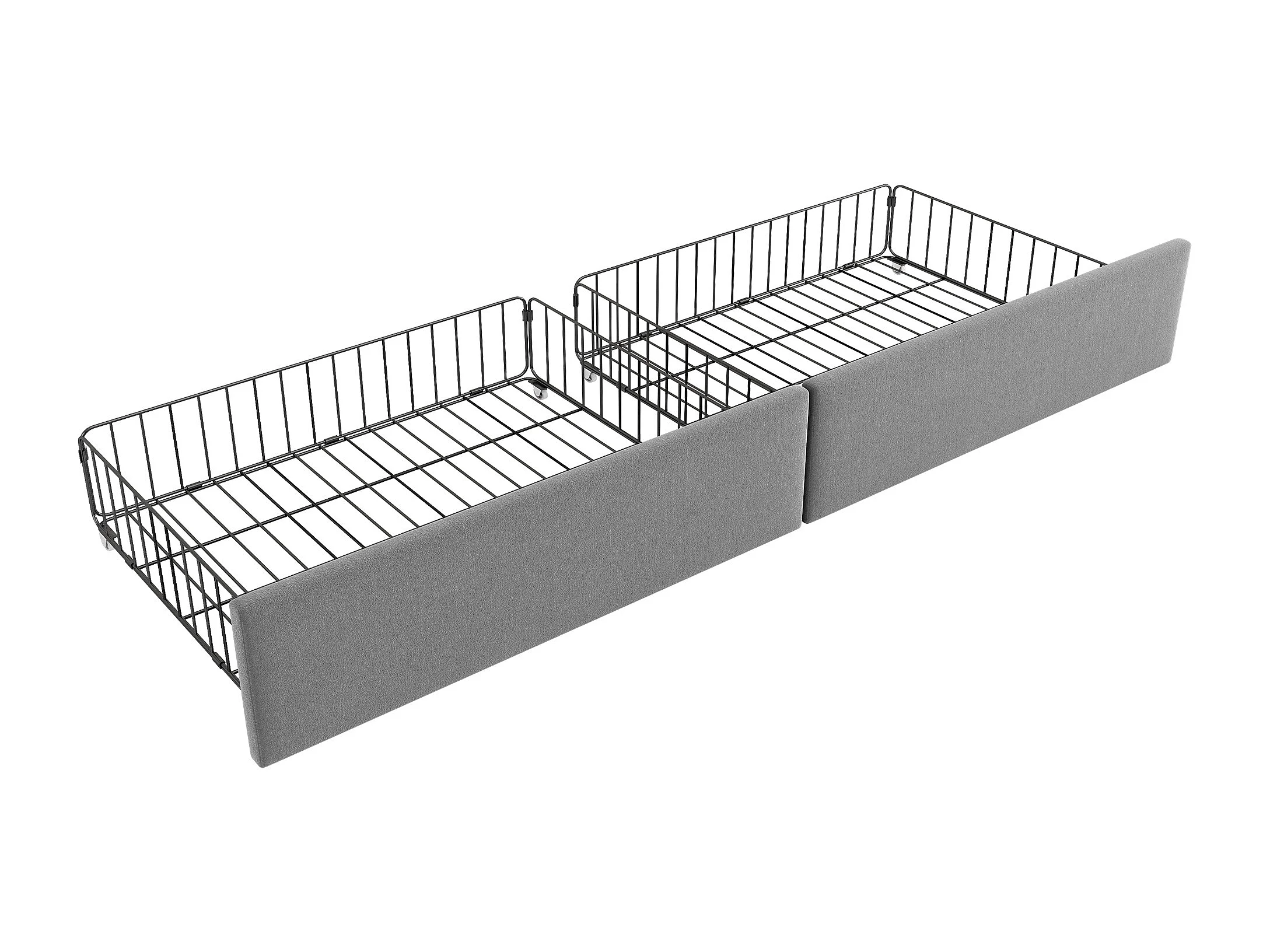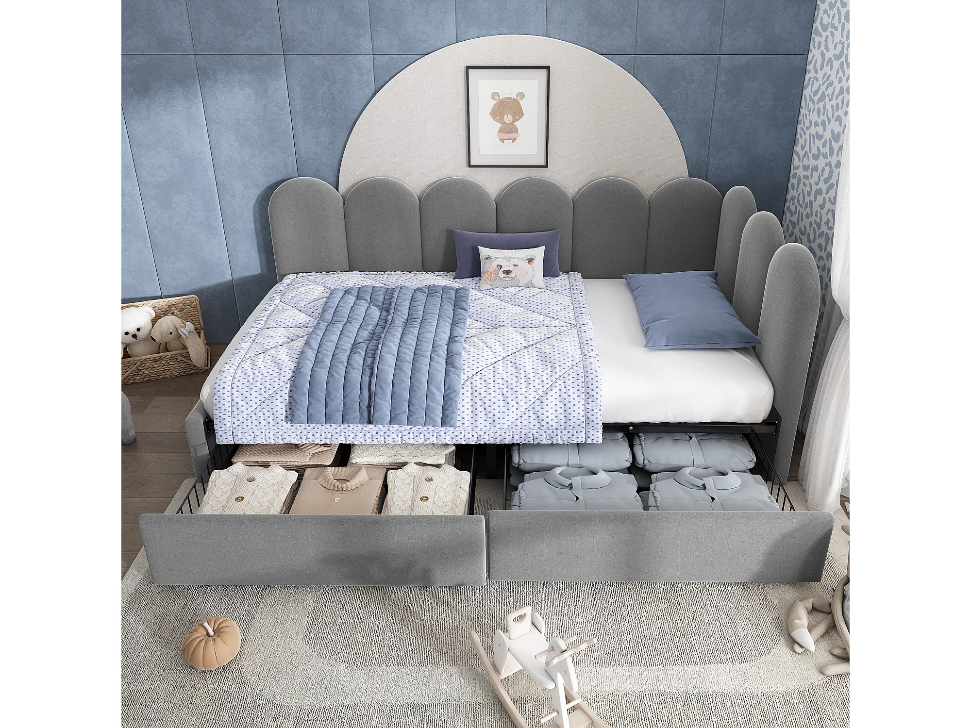 Sofá-cama infantil de 90x190 cm em veludo cinzento com 2 gavetas.