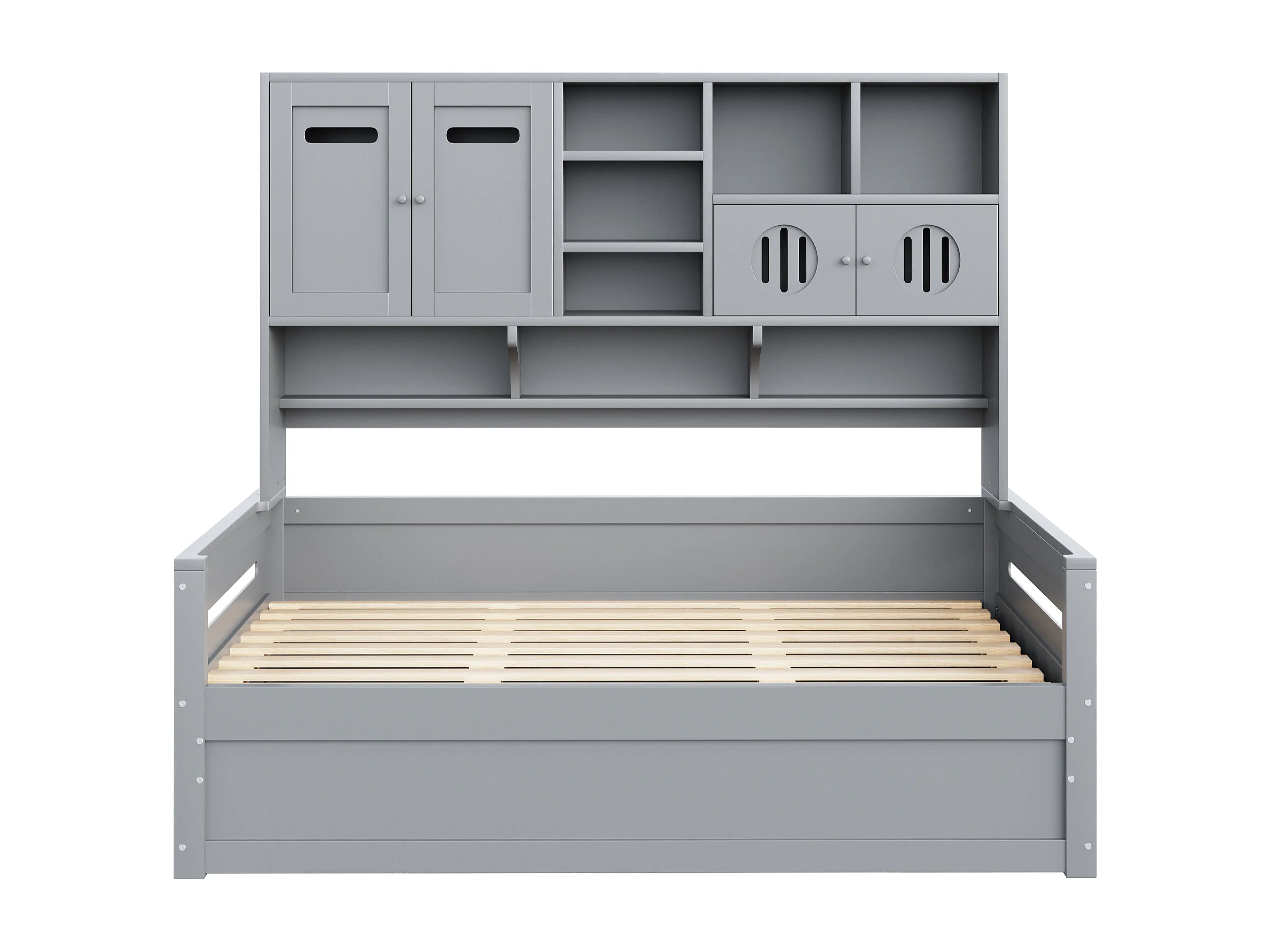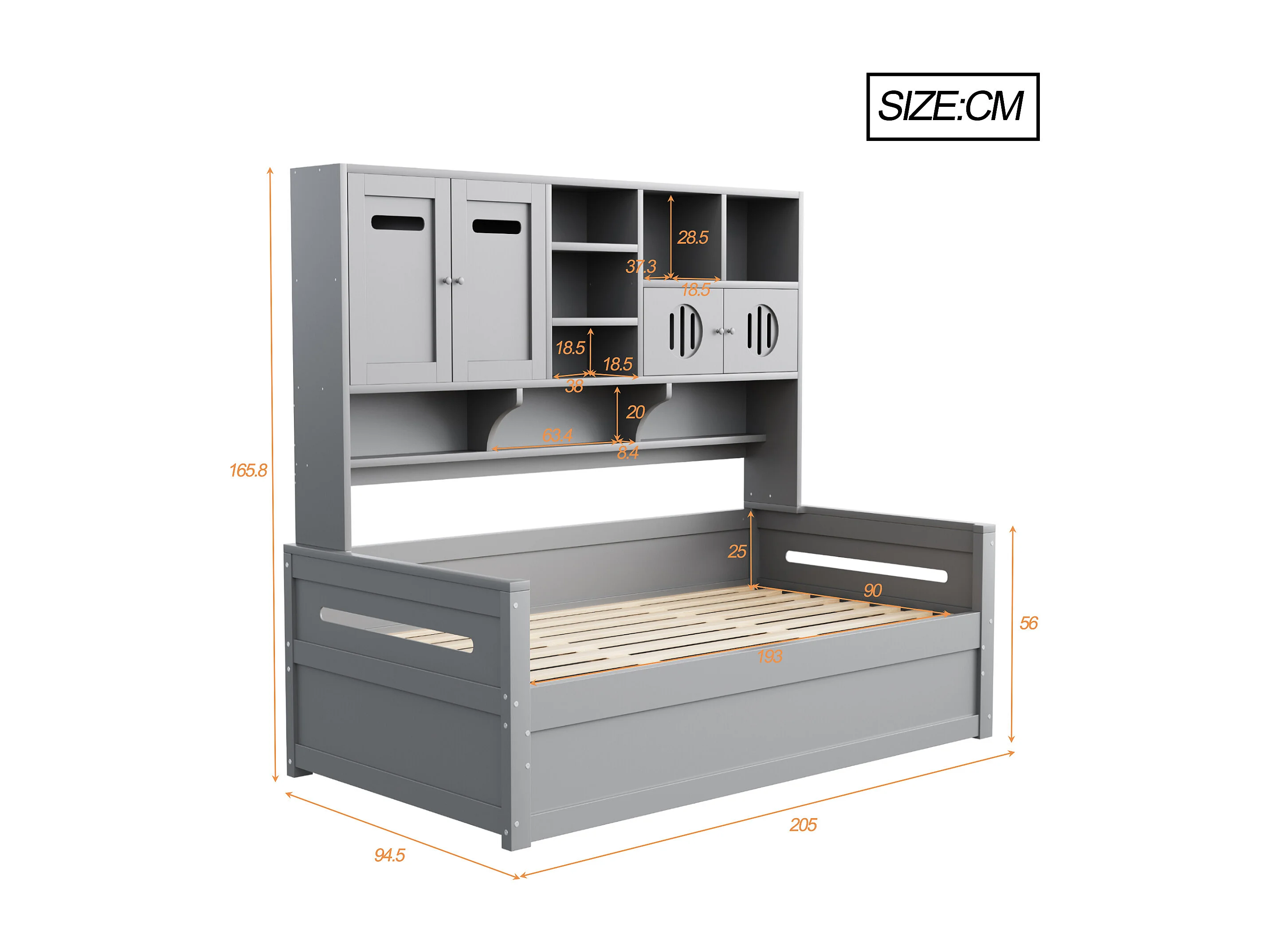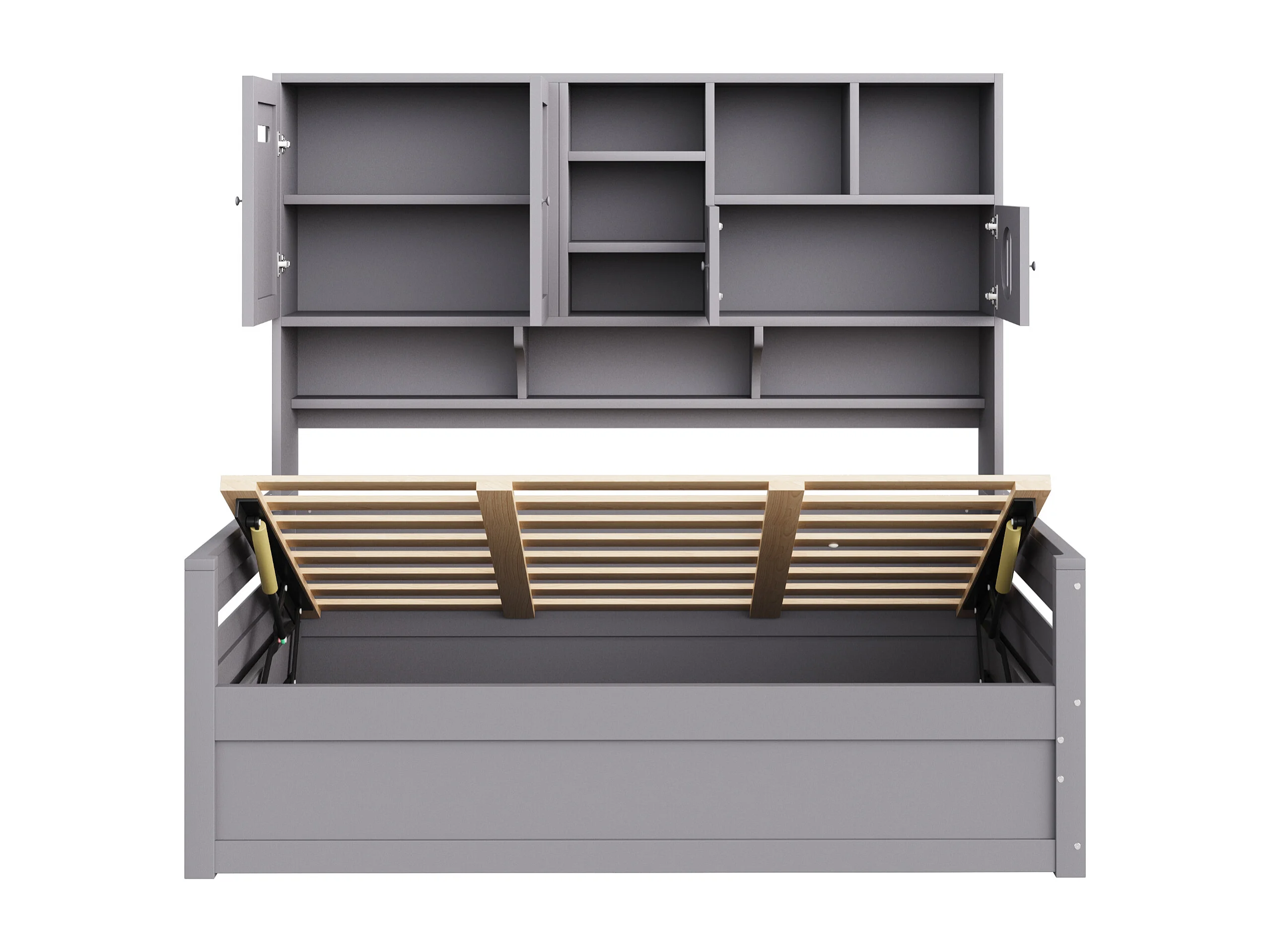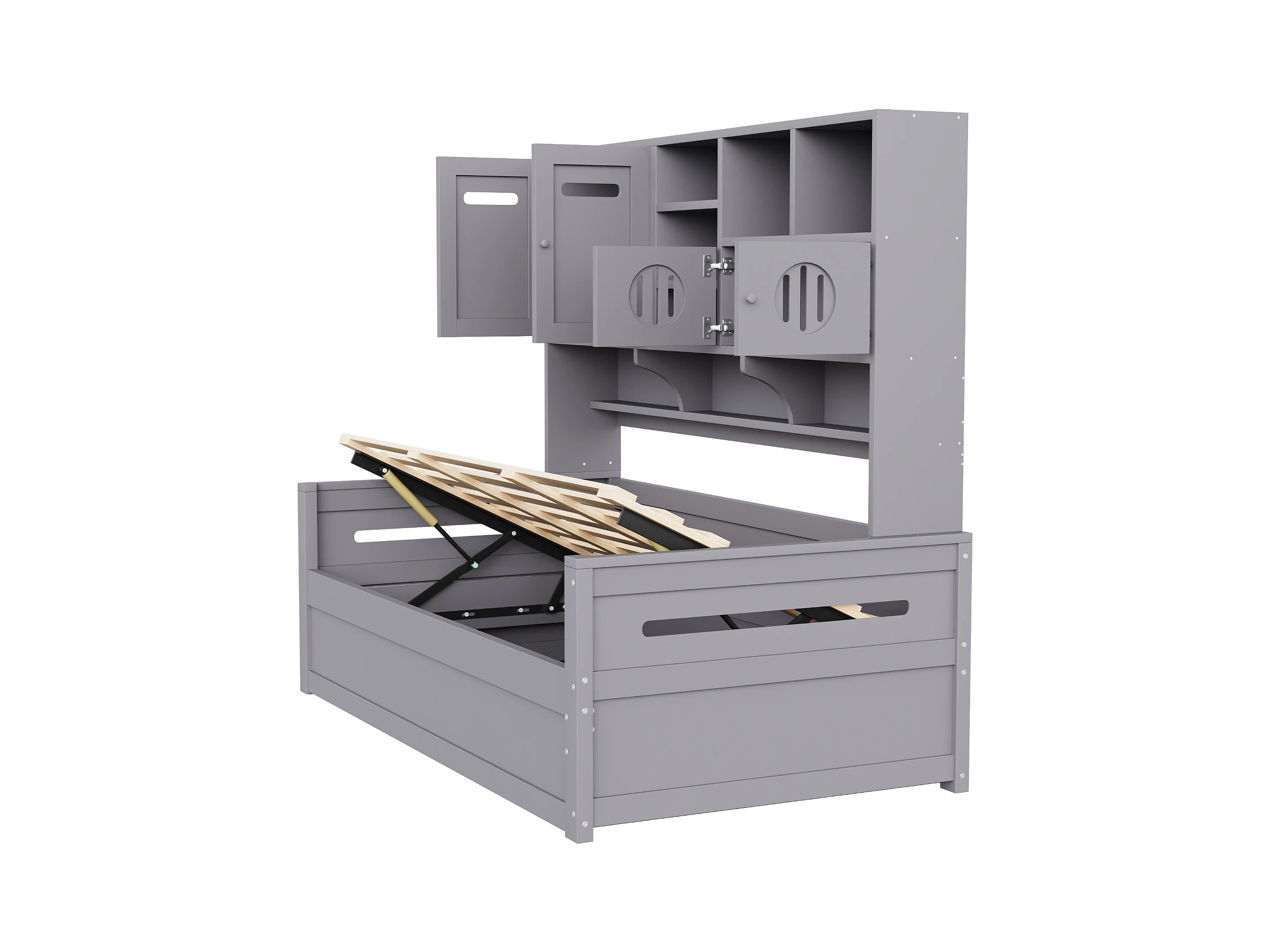 Sofá-cama infantil de madeira - 90 x 200 cm - com prateleira + compartimento hidráulico - madeira - cinza