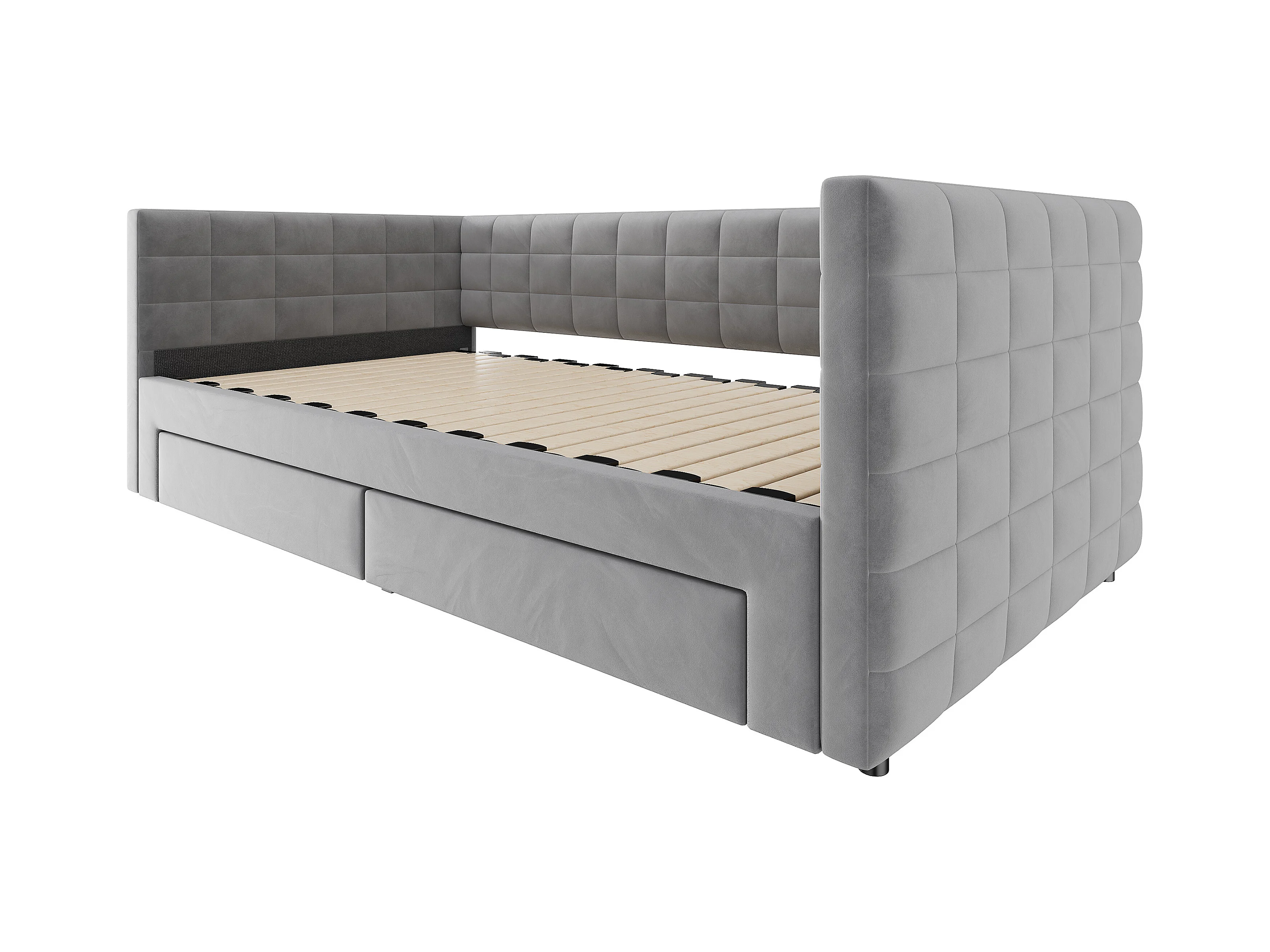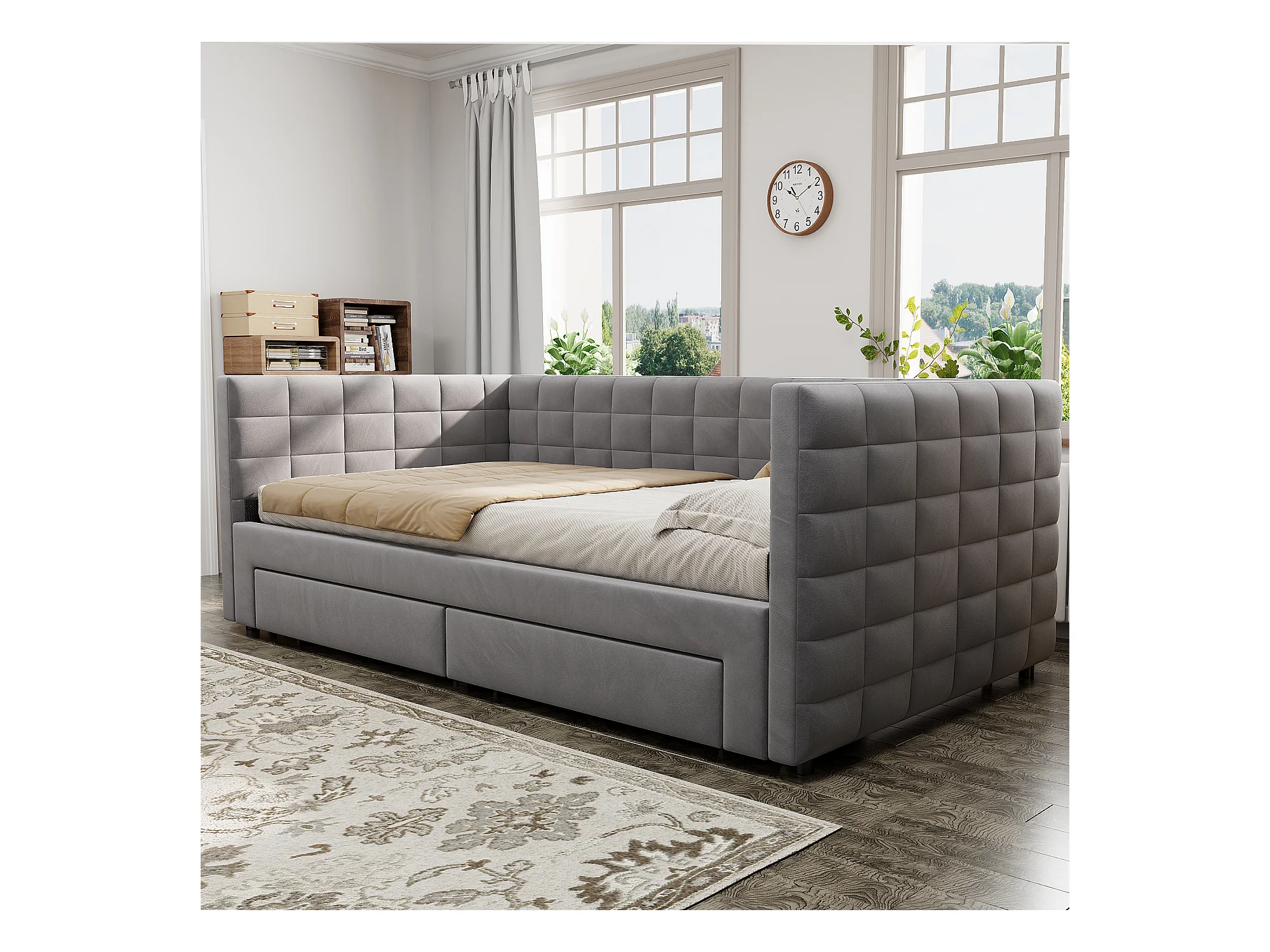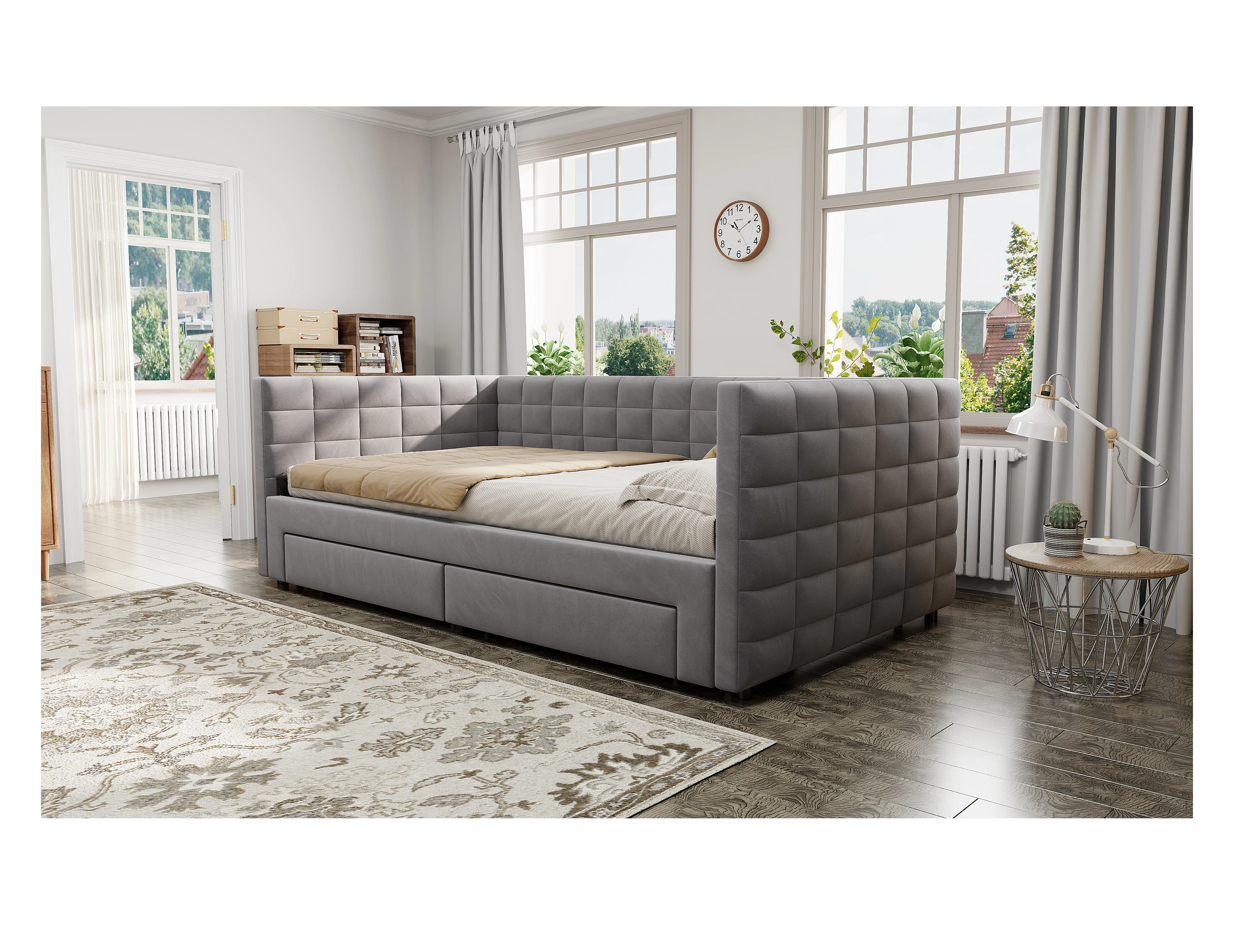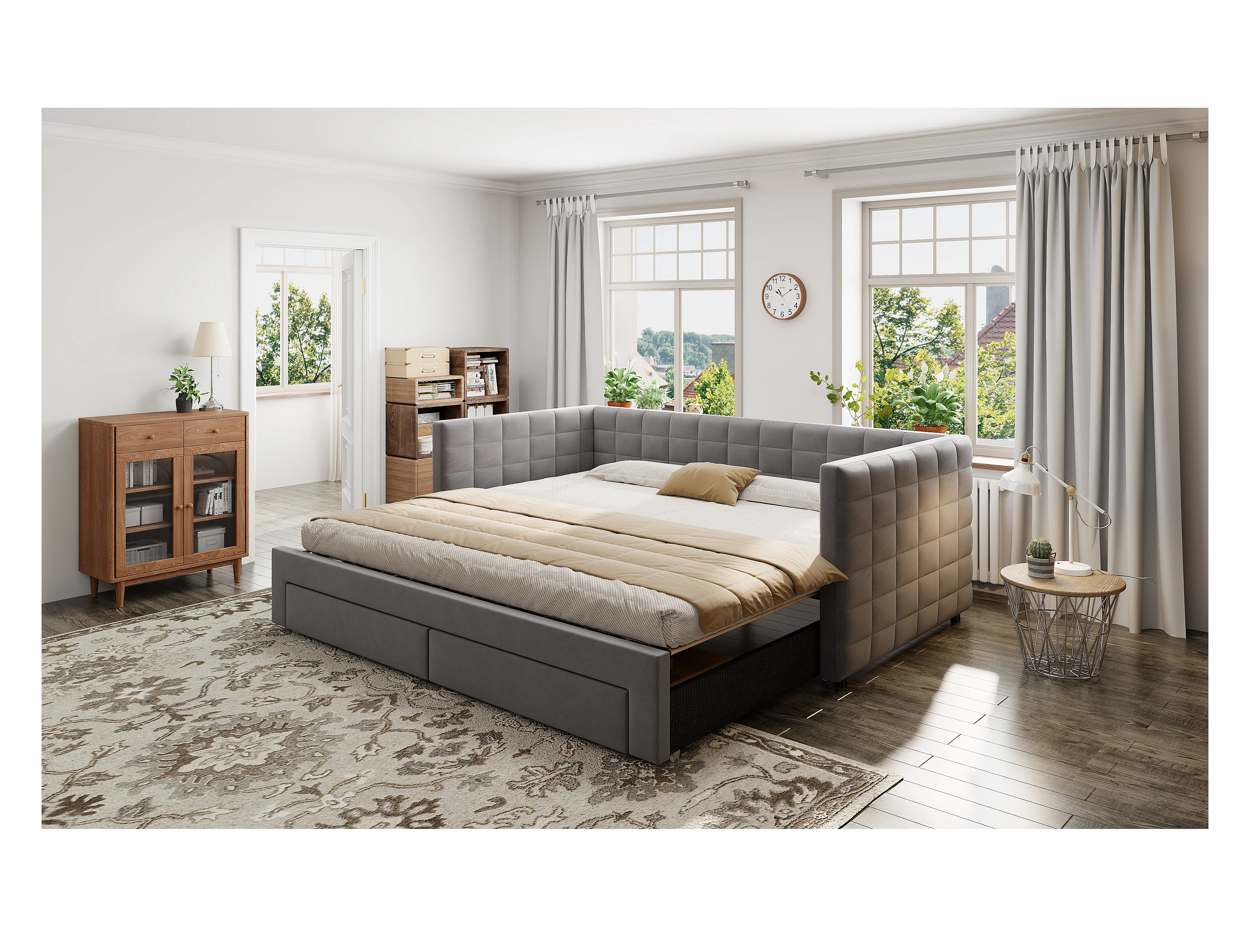 Sofá-cama retrátil - 90/180 x 190 cm - com 2 gavetas + base de ripas - veludo - cinza