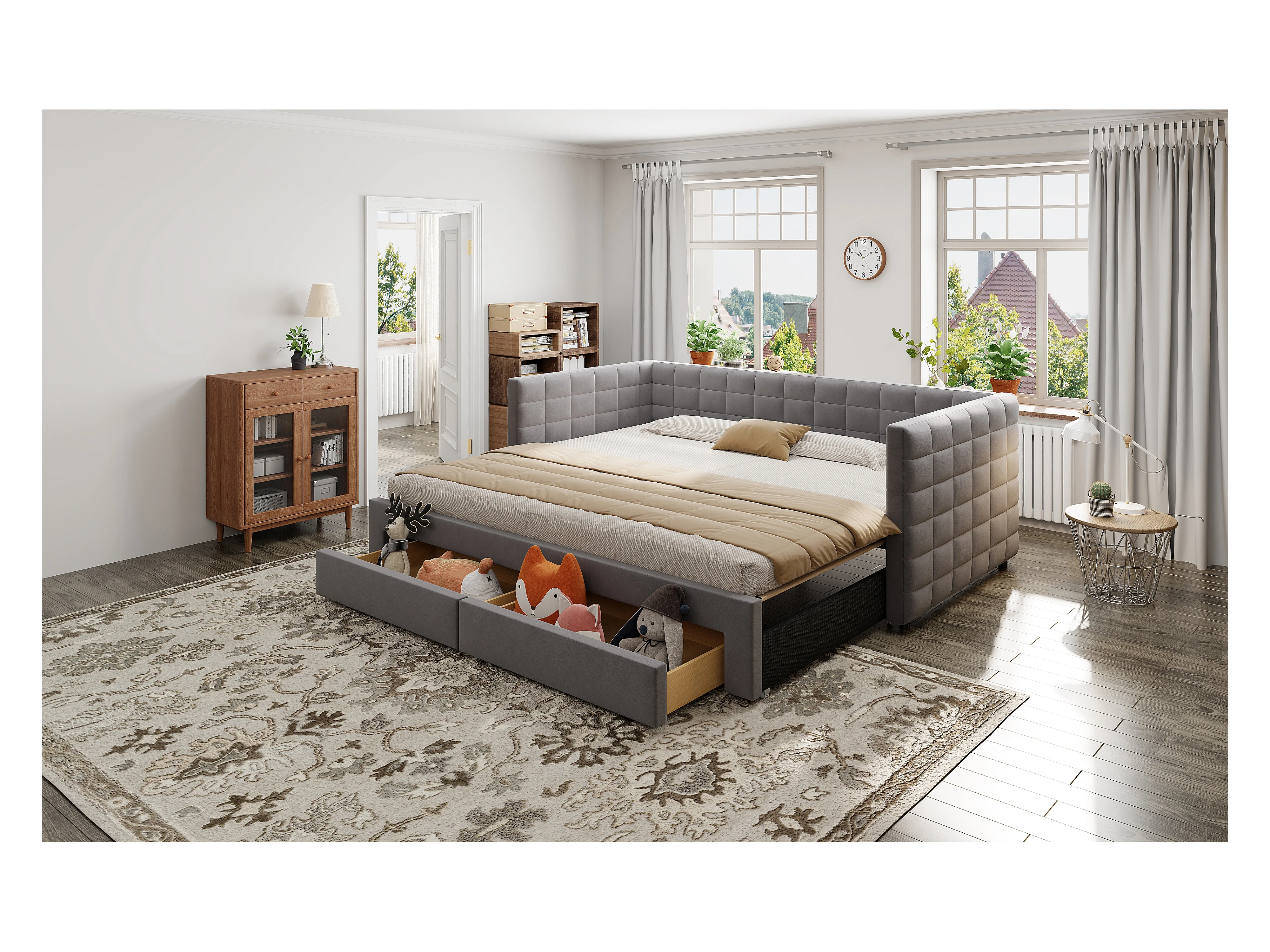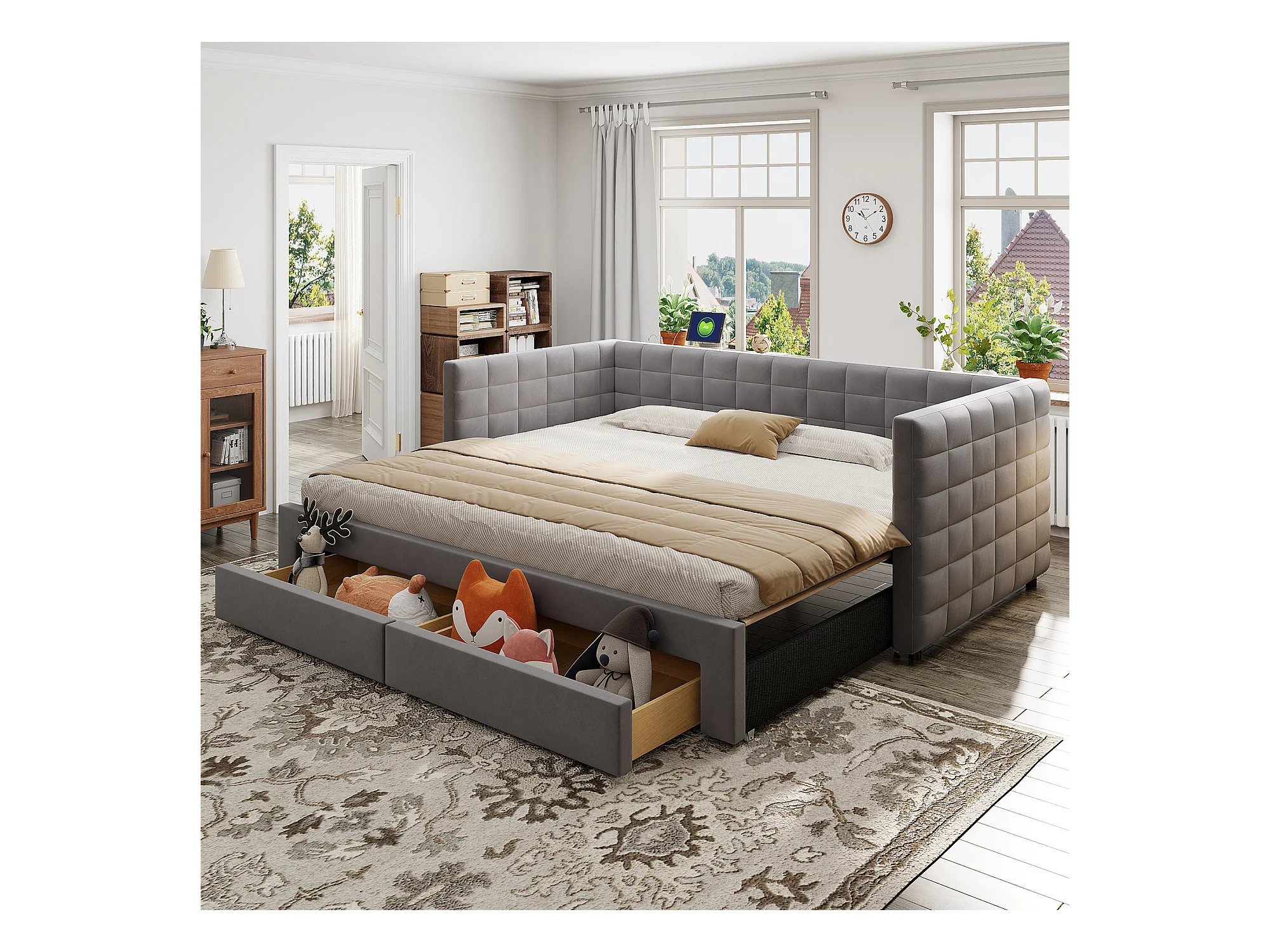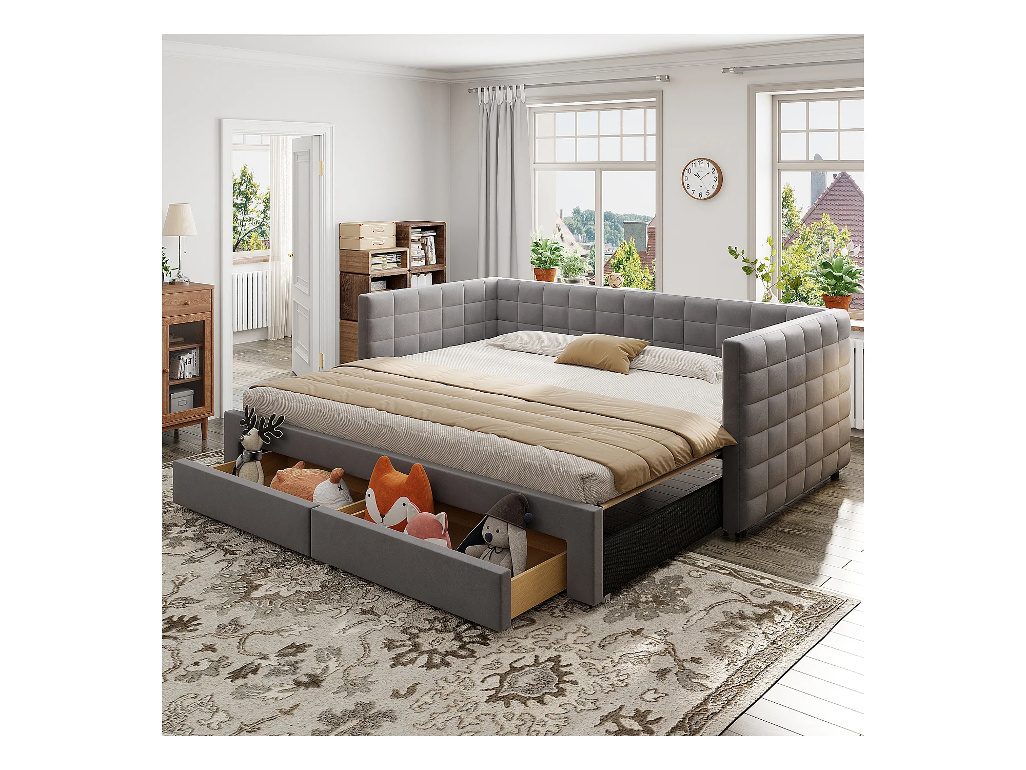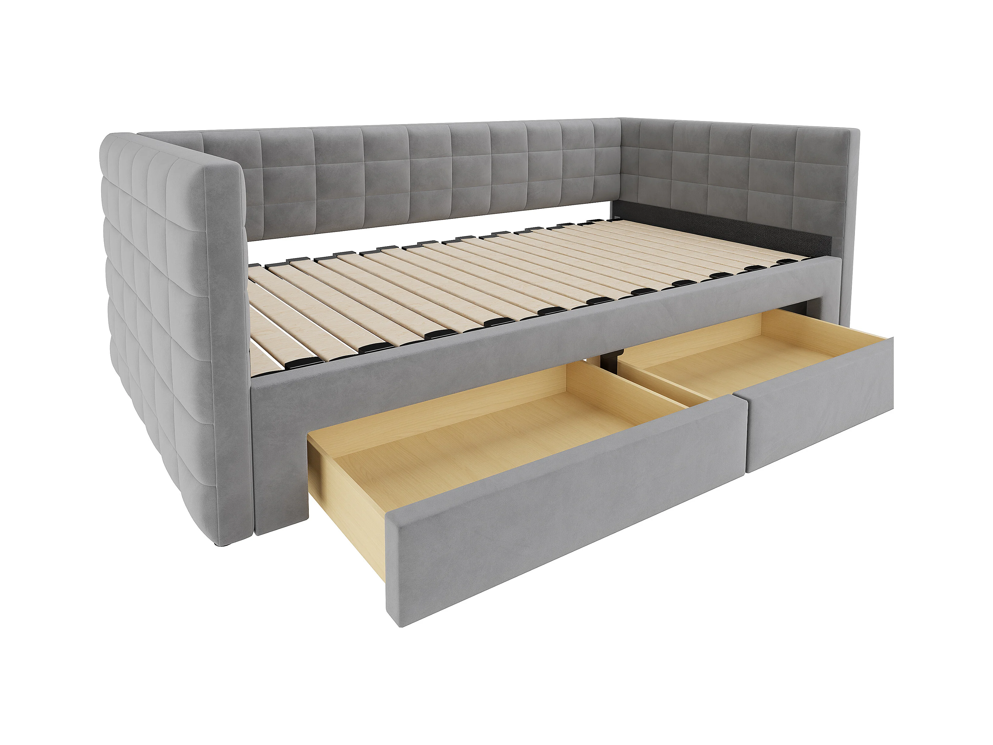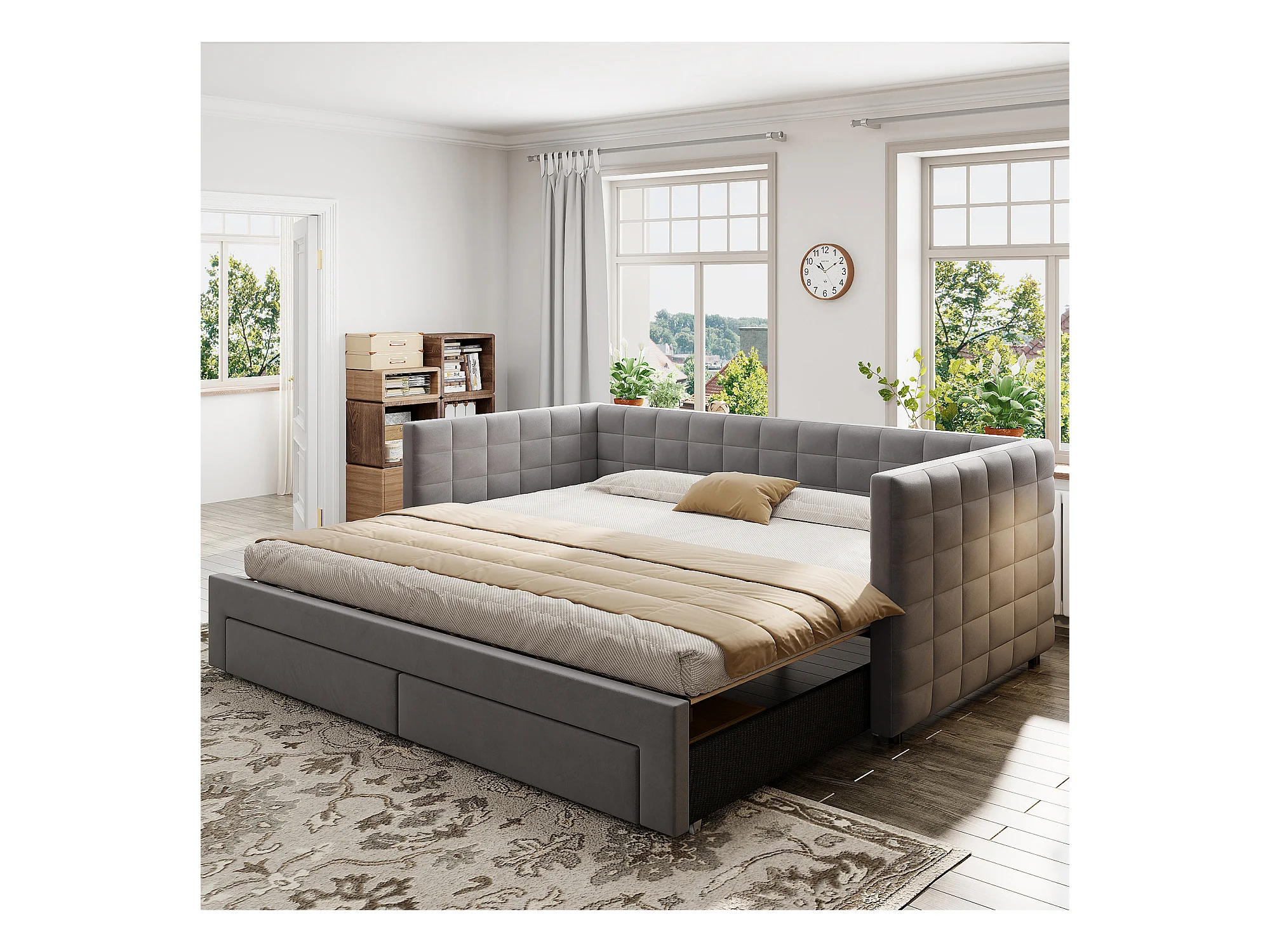 Sofá-cama retrátil - 90/180 x 190 cm - com 2 gavetas + base de ripas - veludo - cinza