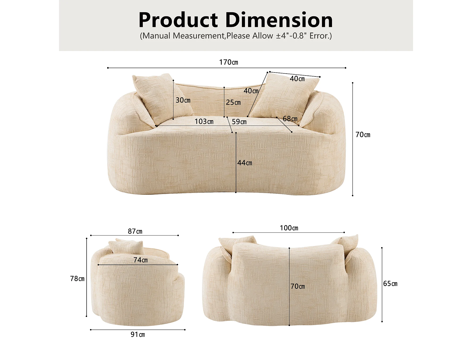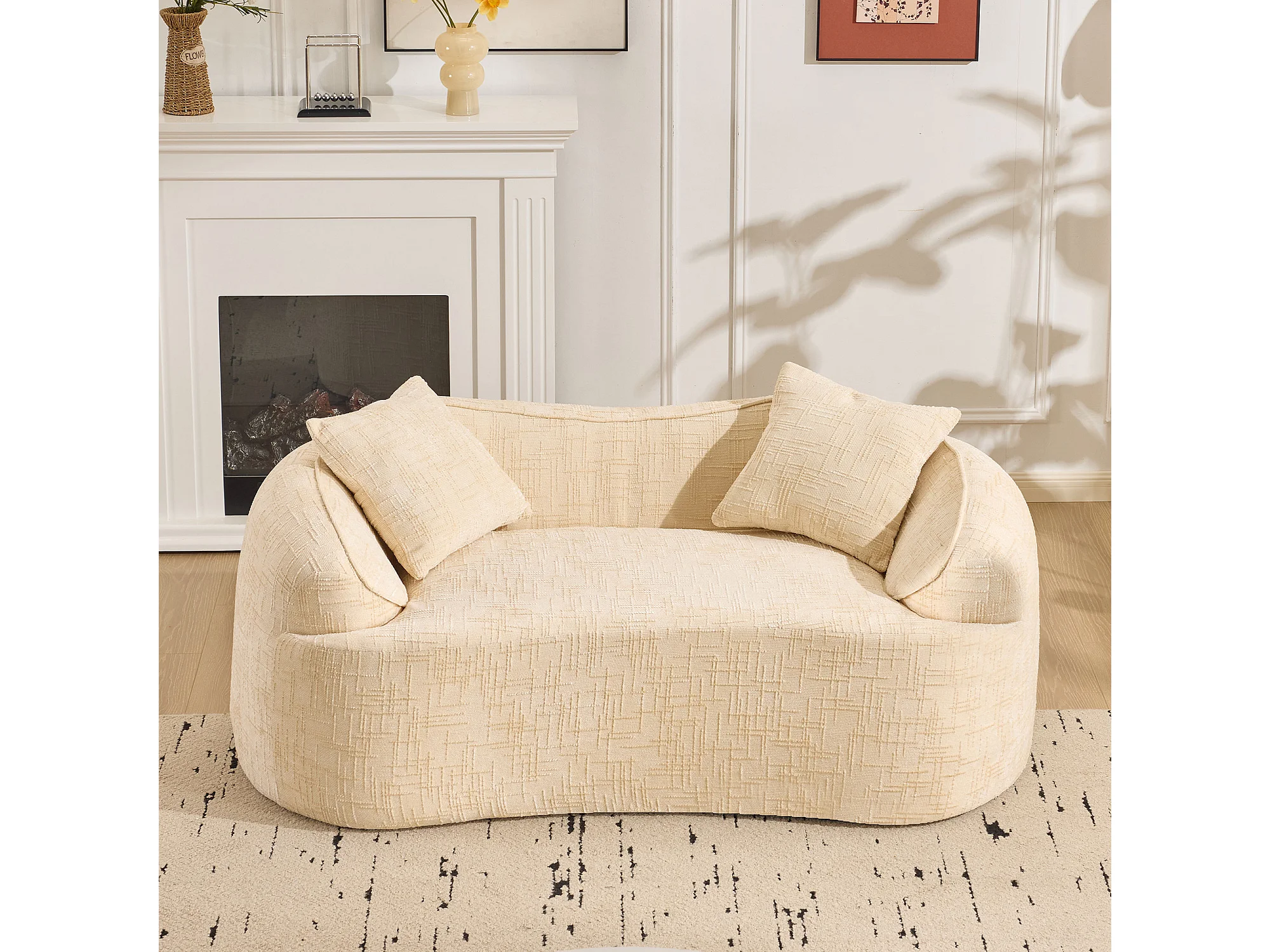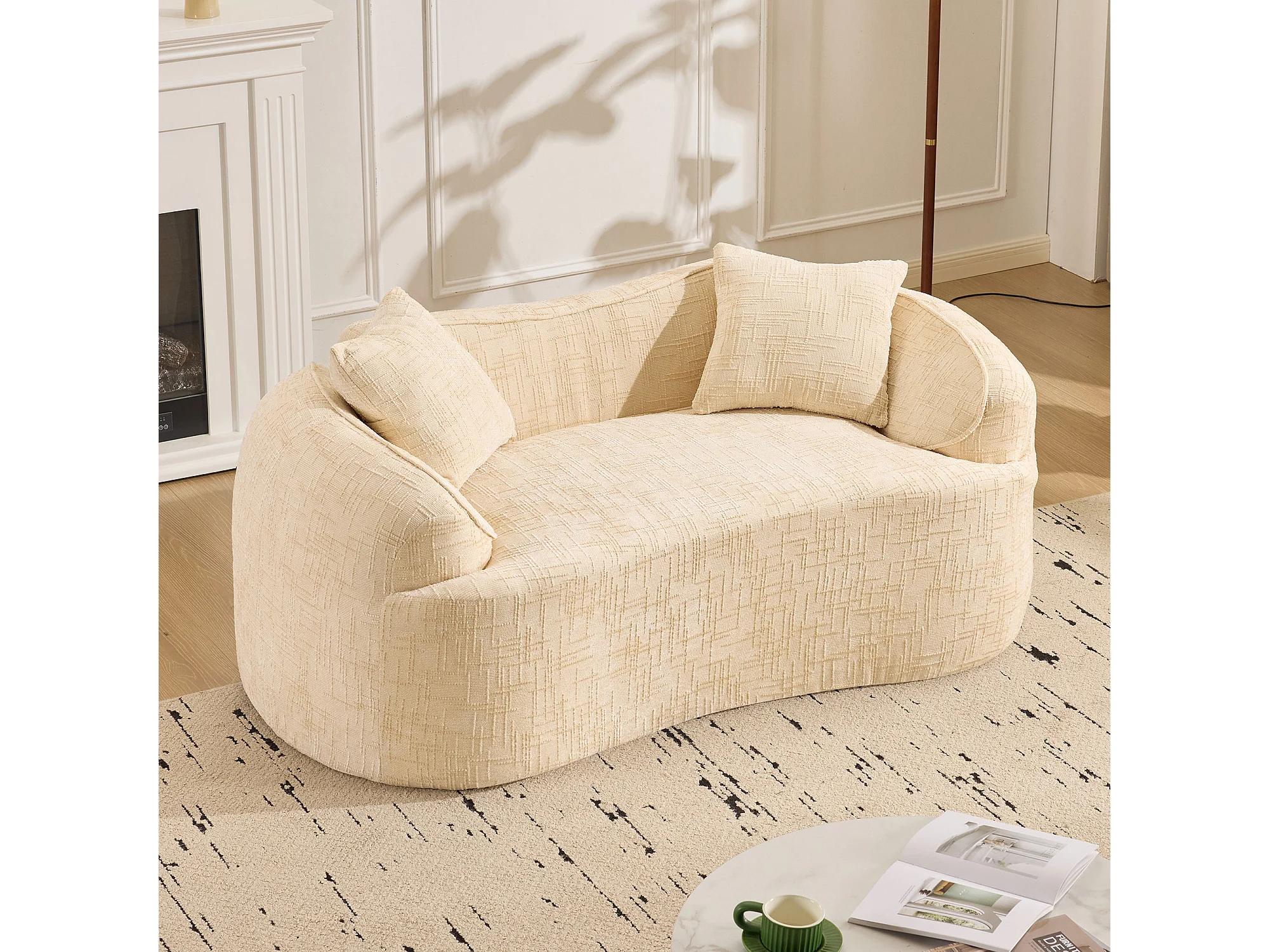 Sofá compacto de 2 lugares com apoios de braço e almofadas bege.