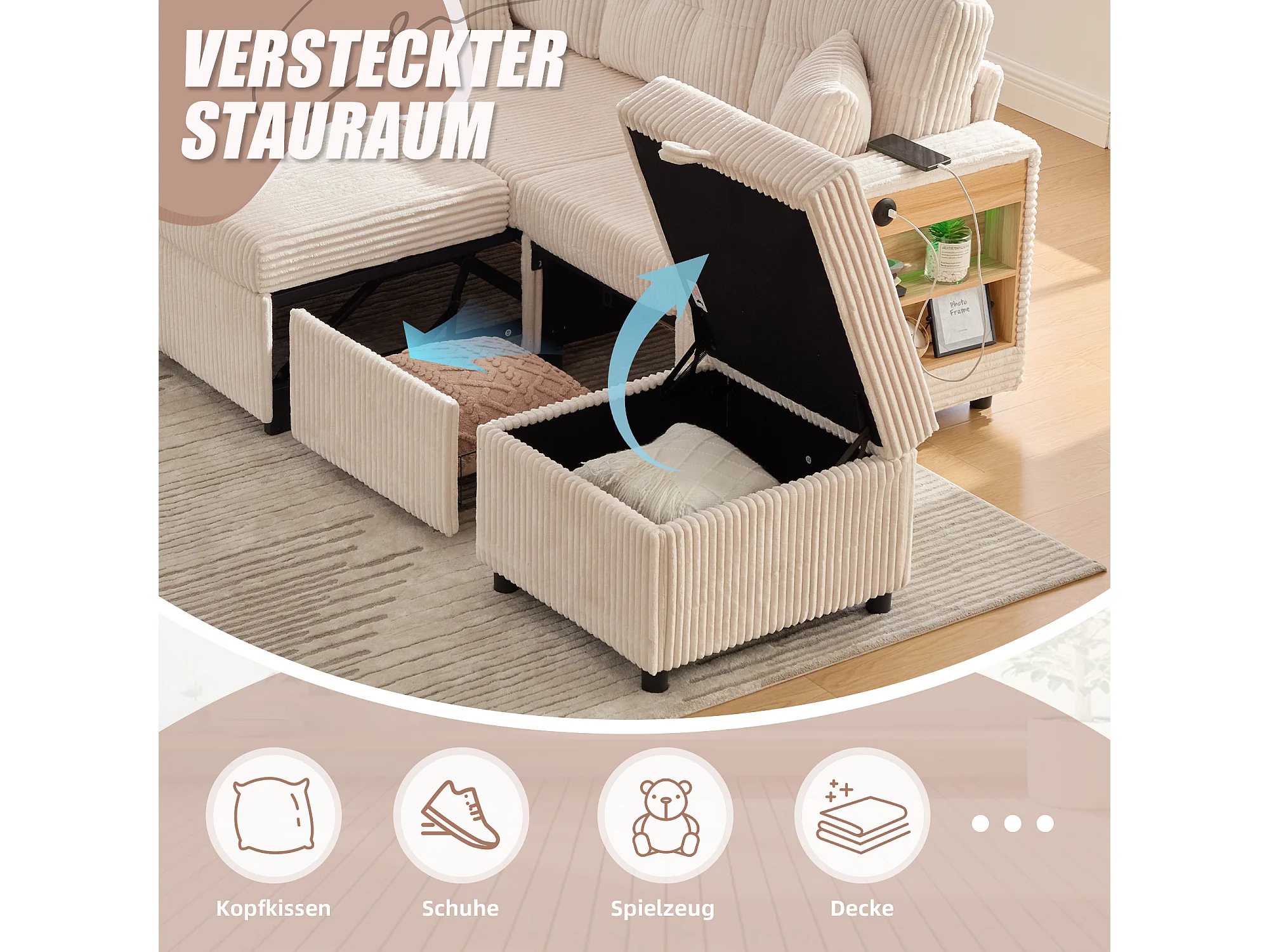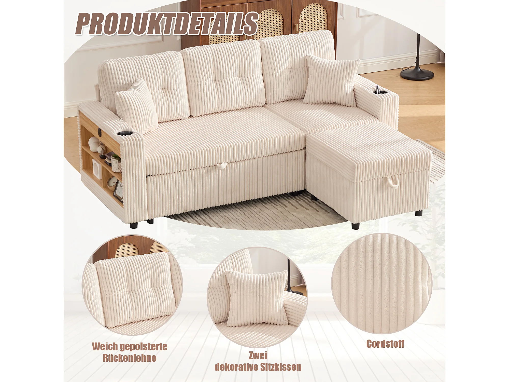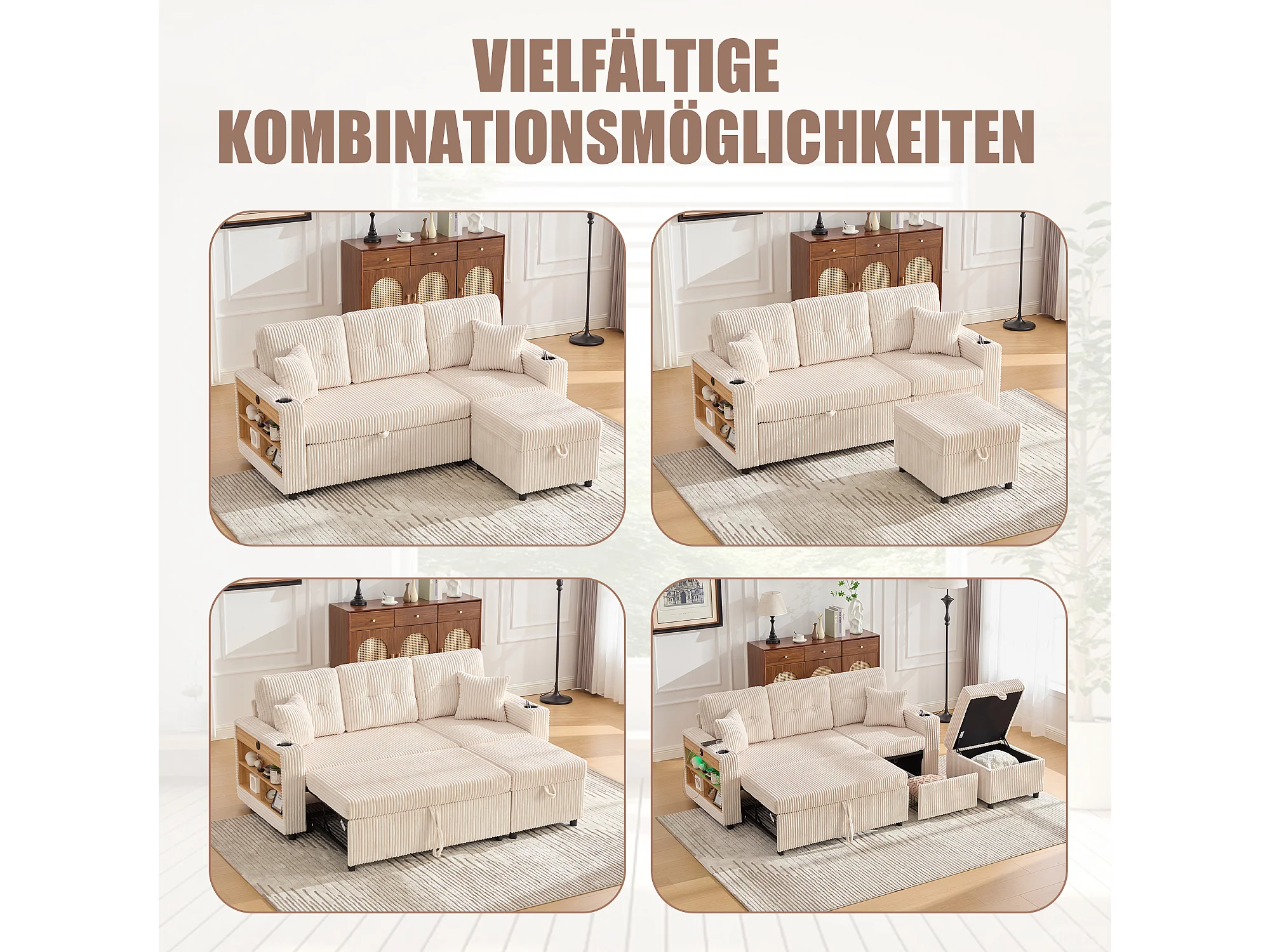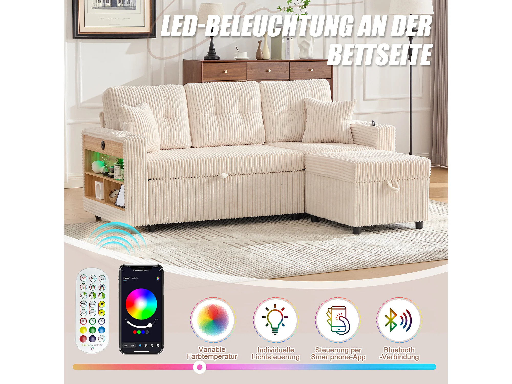 Sofá conversível de 3 lugares - com espaço de armazenamento e cama retrátil + USB + LEDs + porta-copos - veludo - bege