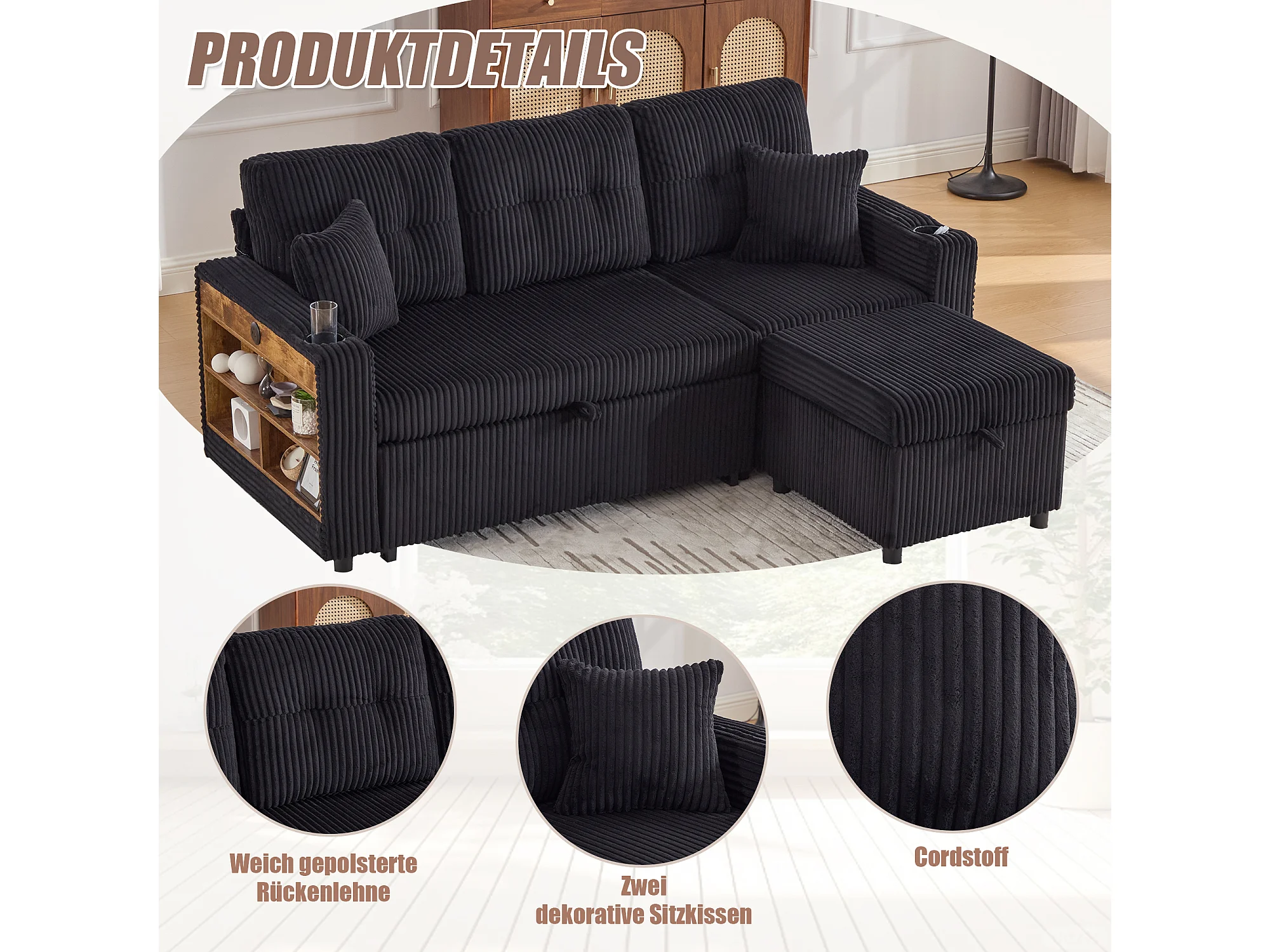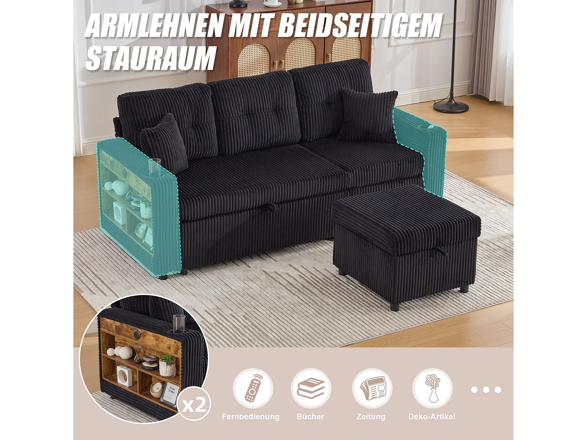 Sofá conversível de 3 lugares - com espaço de armazenamento e cama retrátil + USB + LEDs + porta-copos - veludo - preto
