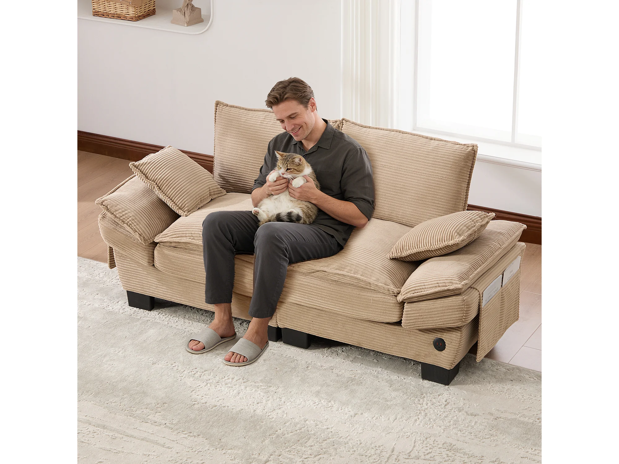 Sofá de 2 lugares em veludo cotelê - 190 x 73 x 84 cm - com porta USB e bolsos - estofamento em espuma - cor cáqui
