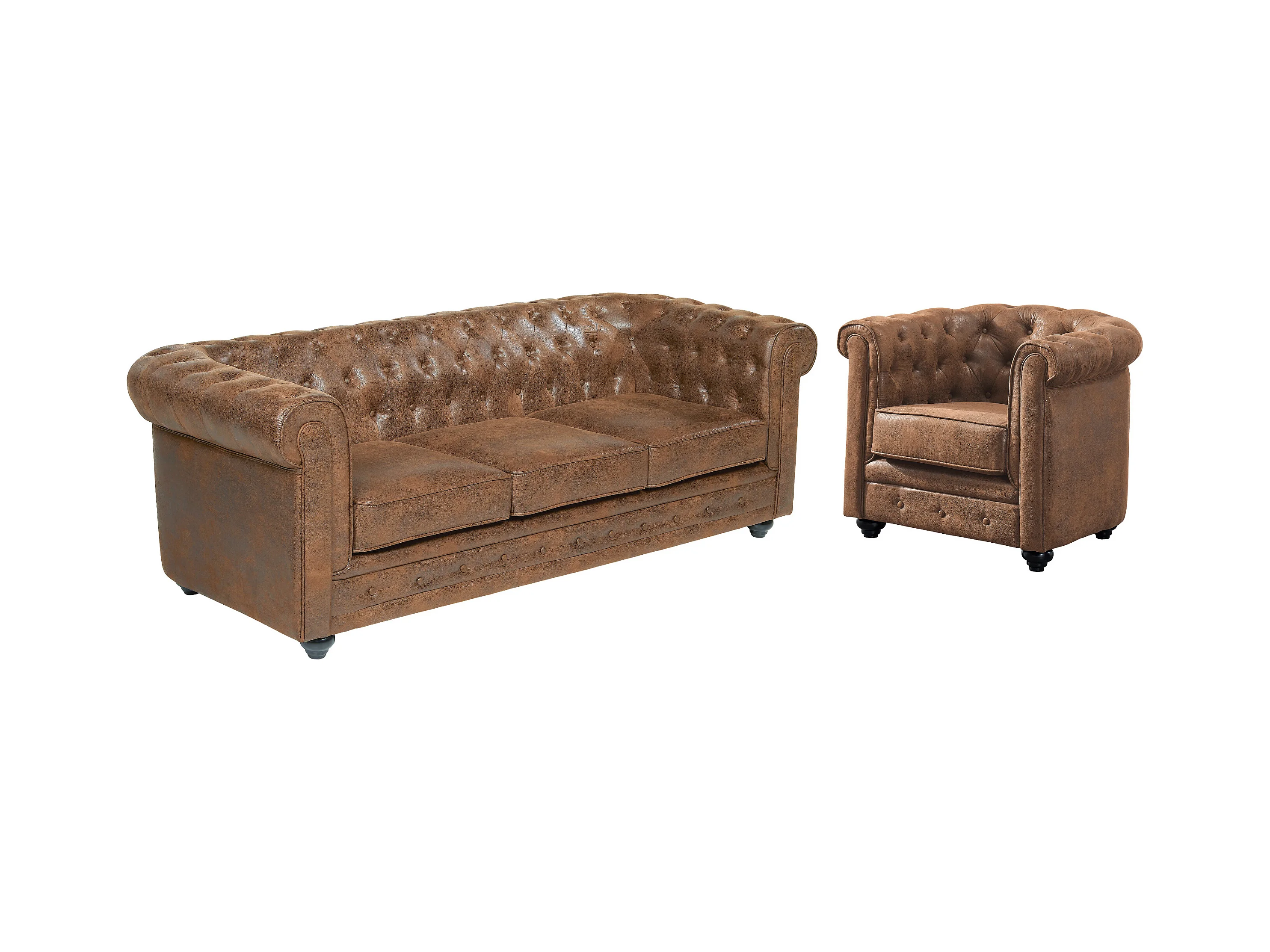 Sofá de 3 lugares e cadeirão CHESTERFIELD em microfibra com aspeto de pele envelhecida