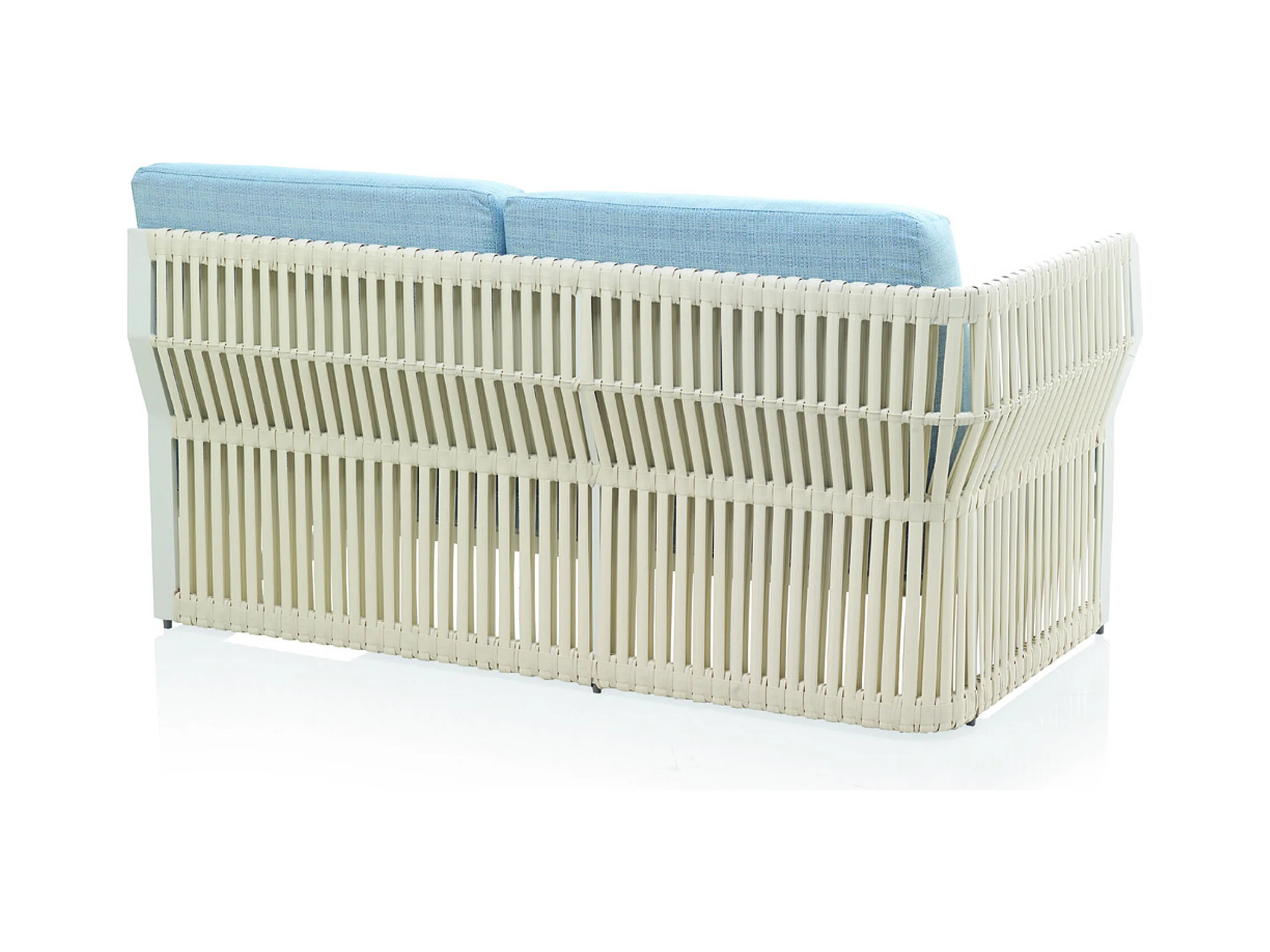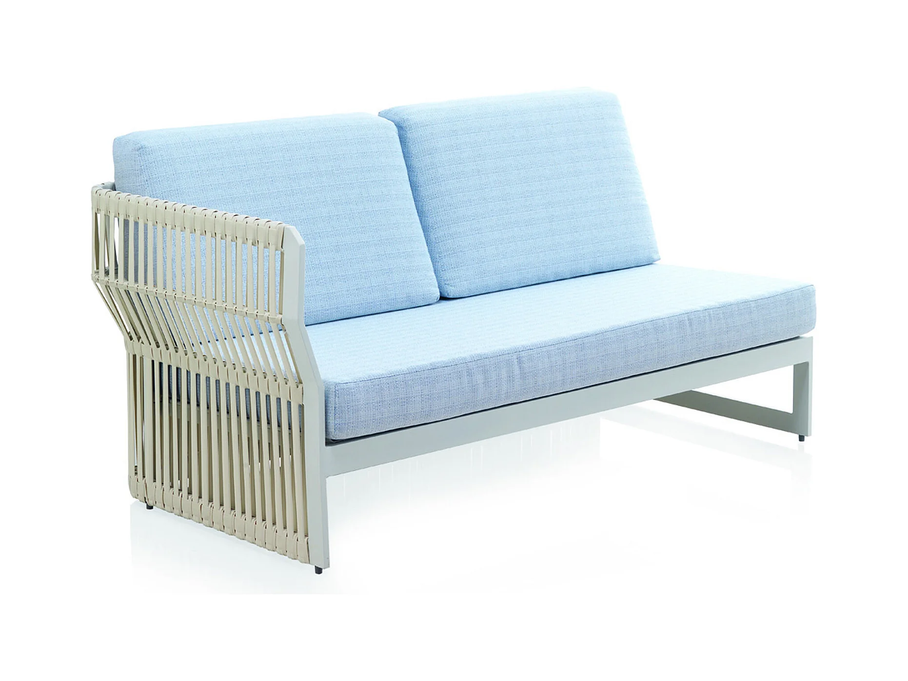Sofá com braço esquerdo em alumínio branco e fibra branca com almofadas azuis