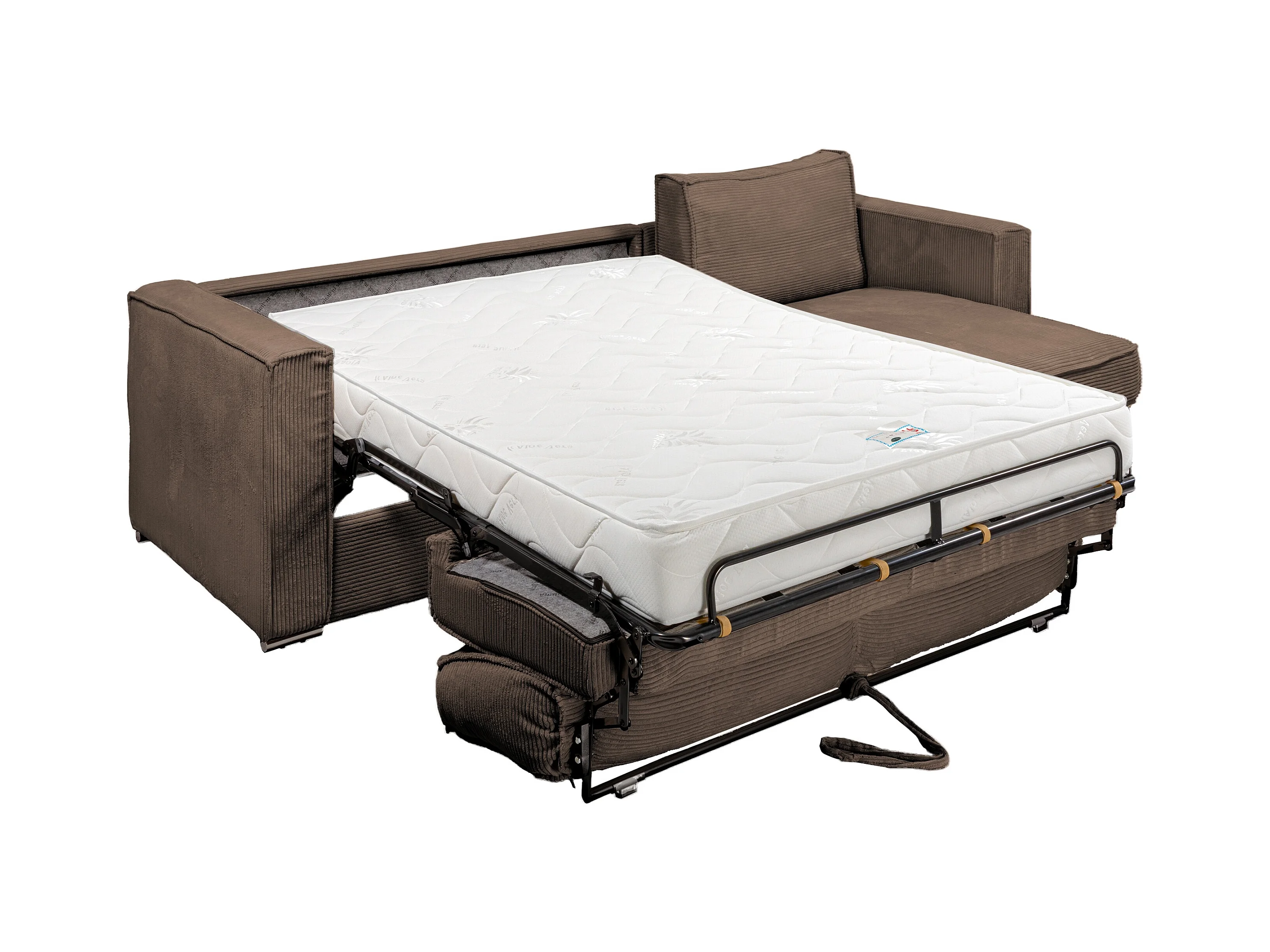 Sofá de canto convertível abertura rápida e reversível veludo canelado castanho, cama 140 cm e colchão 18 cm - LORETO