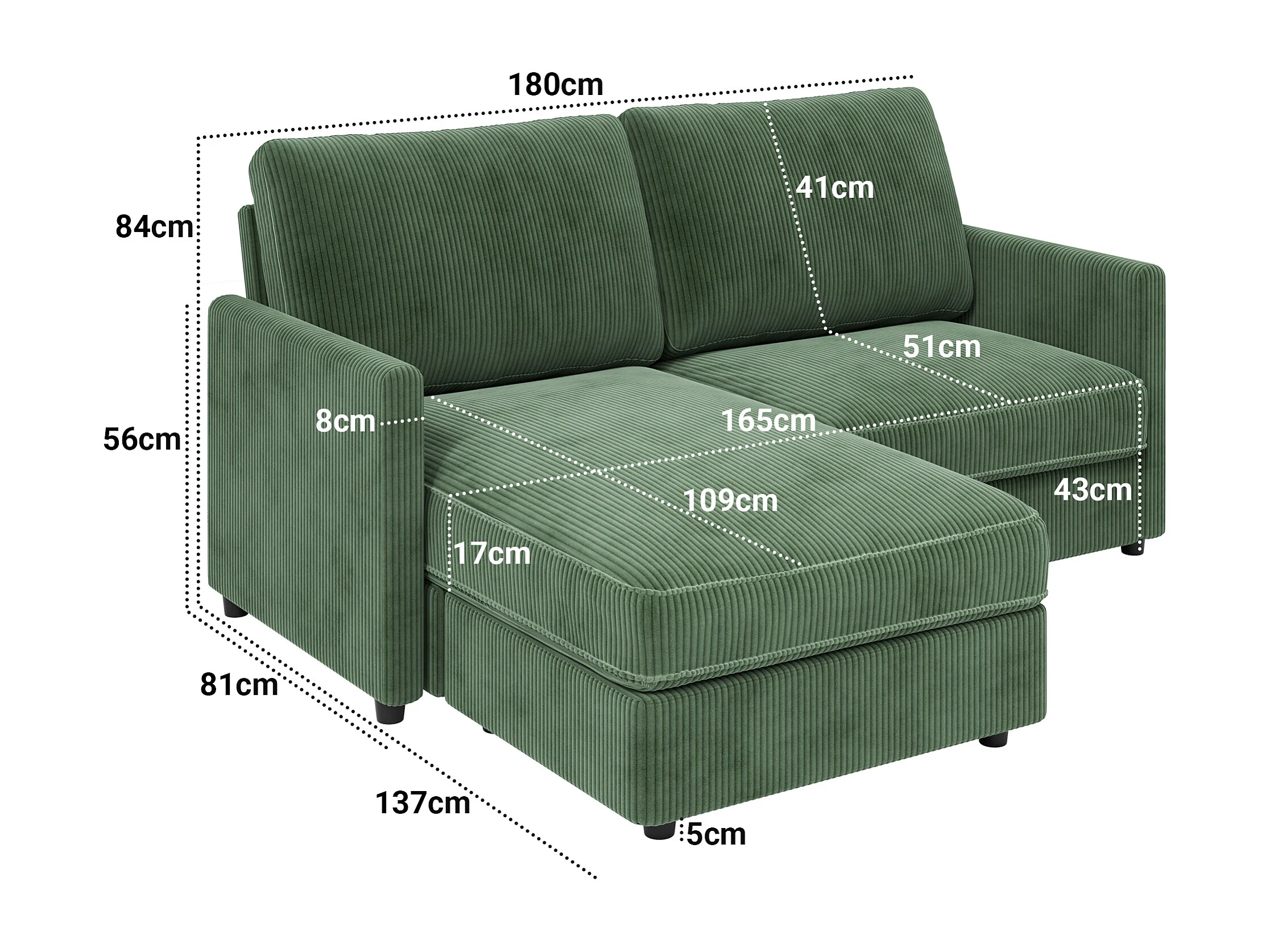 Sofá de canto de 2 -Sater - ângulo reversível para a direita / esquerda - 180x140x86cm - em tecido de veludo com nervuras - carga máxima de 300 kg - verde