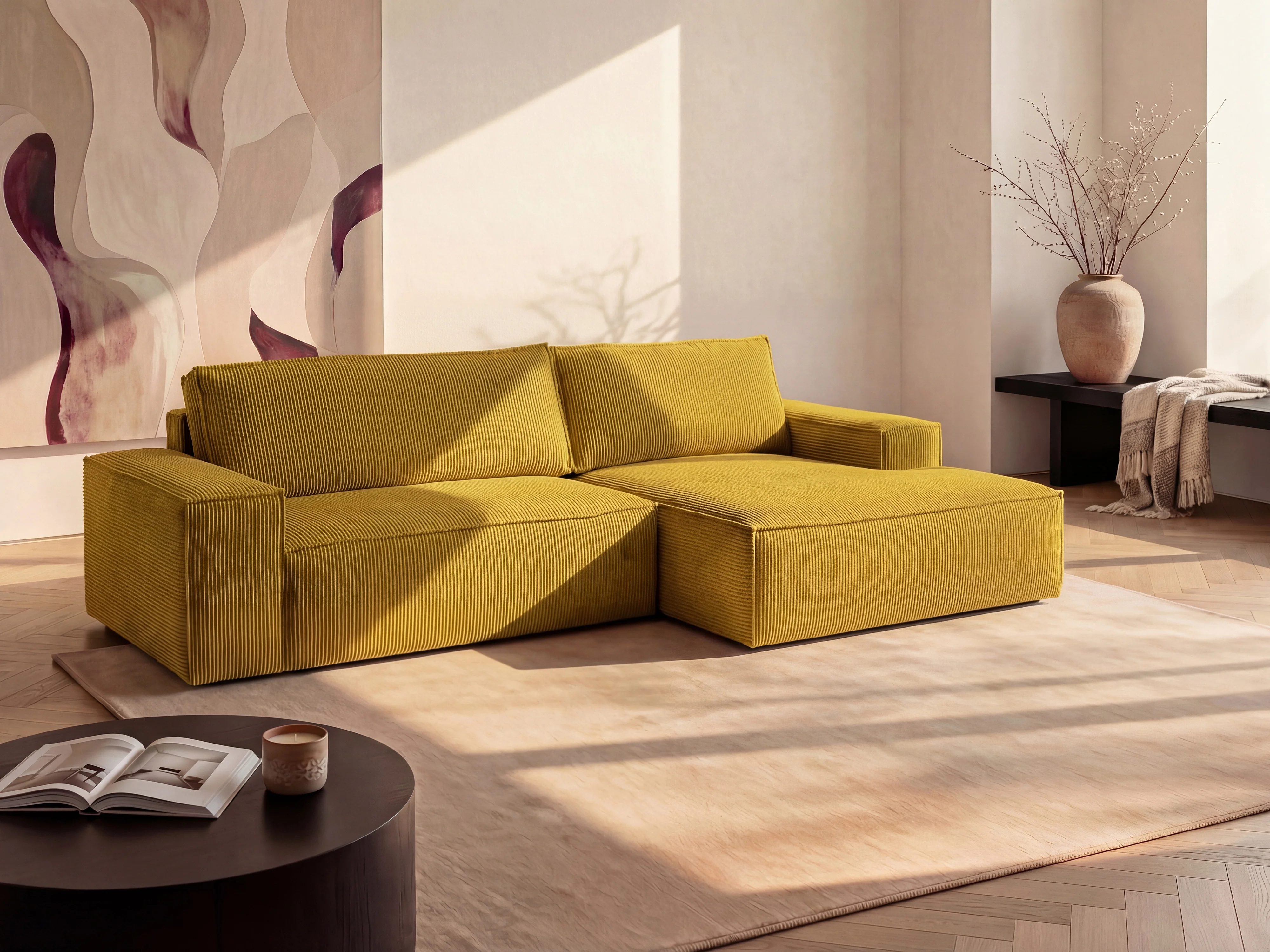 Sofá de canto direito convertível em veludo canelado amarelo - AMELIA
