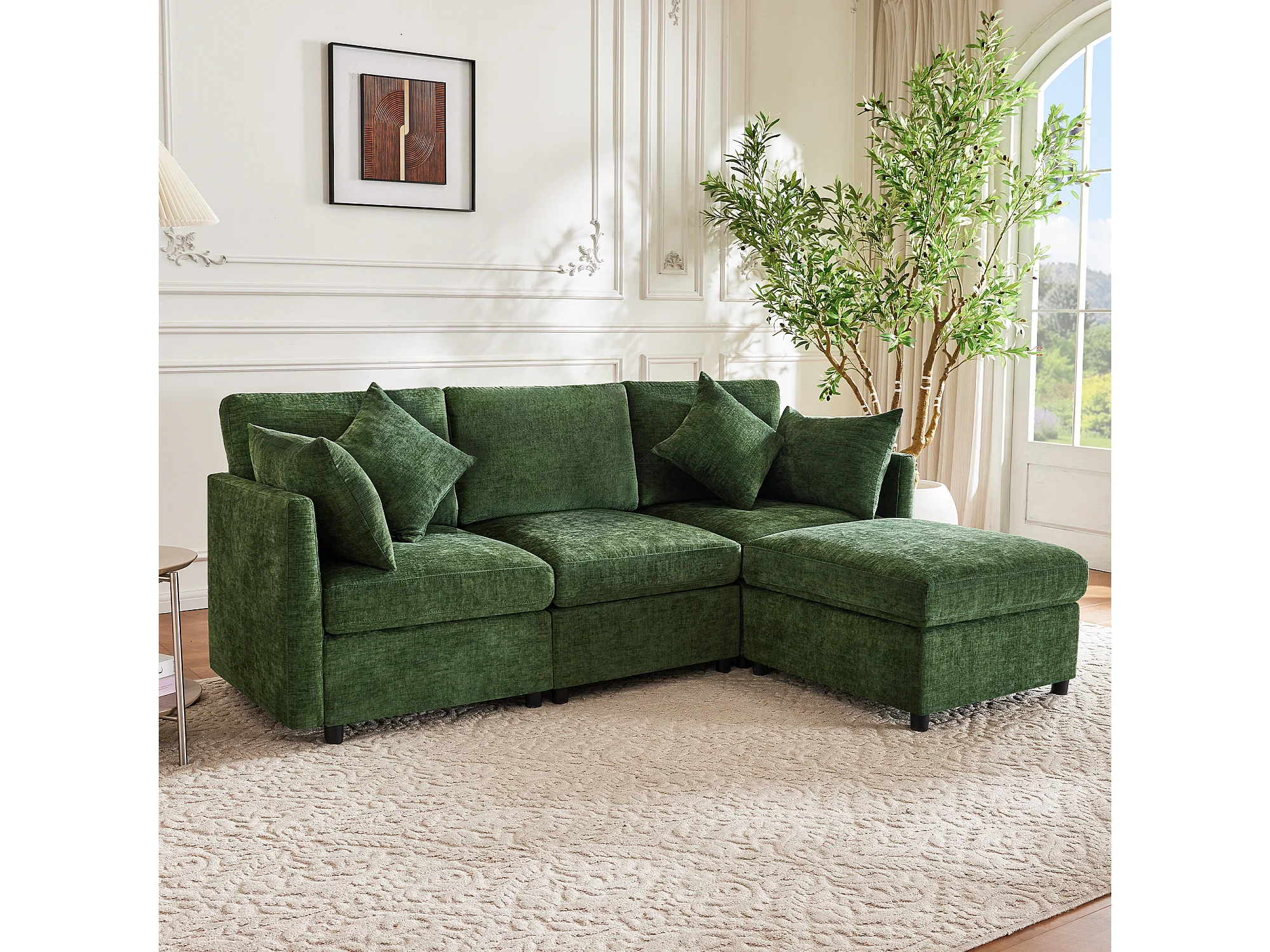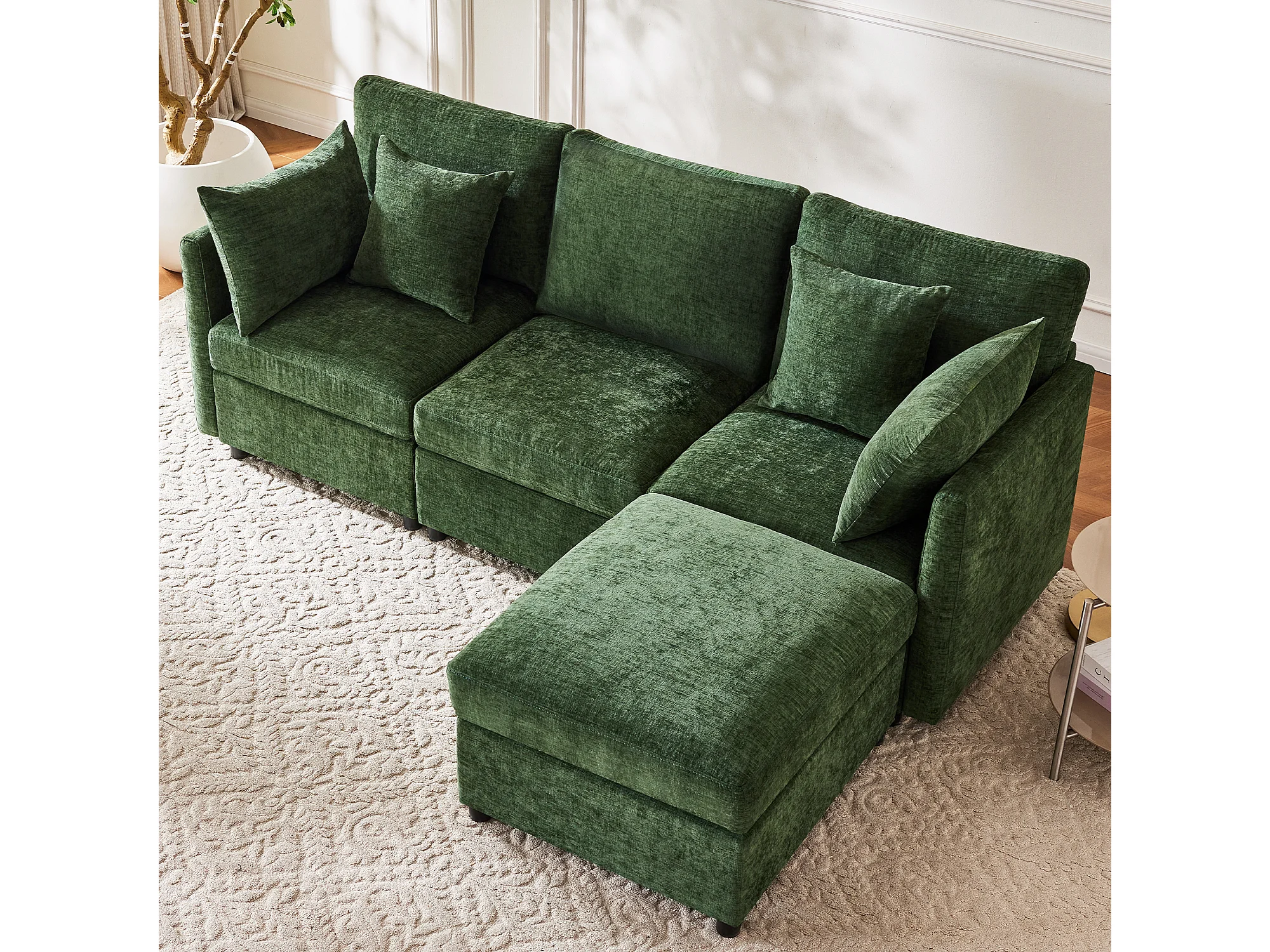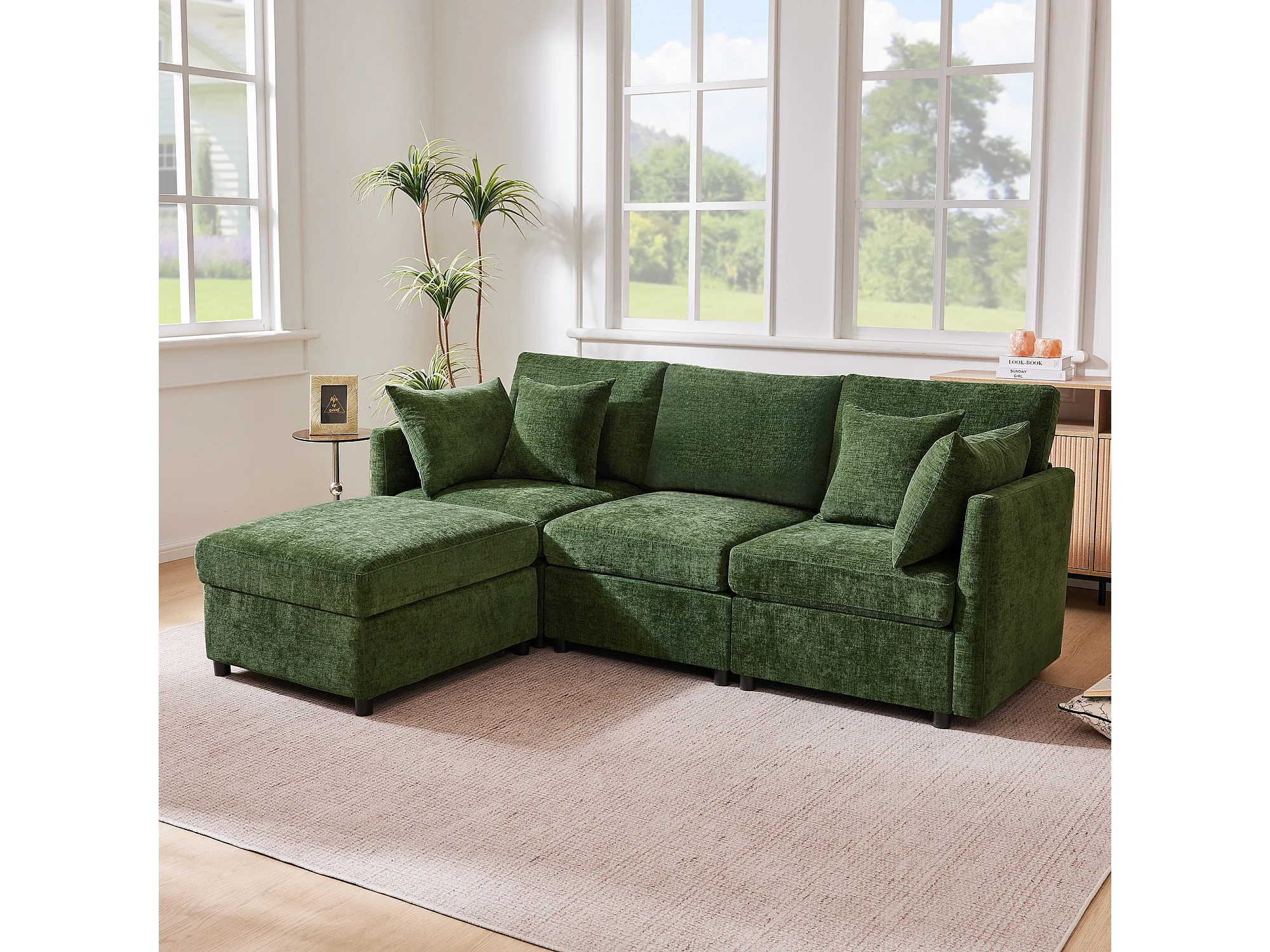 Sofá de canto em L de 3 lugares - 216 x 161 x 81 cm - com 4 almofadas + pufe - veludo - verde