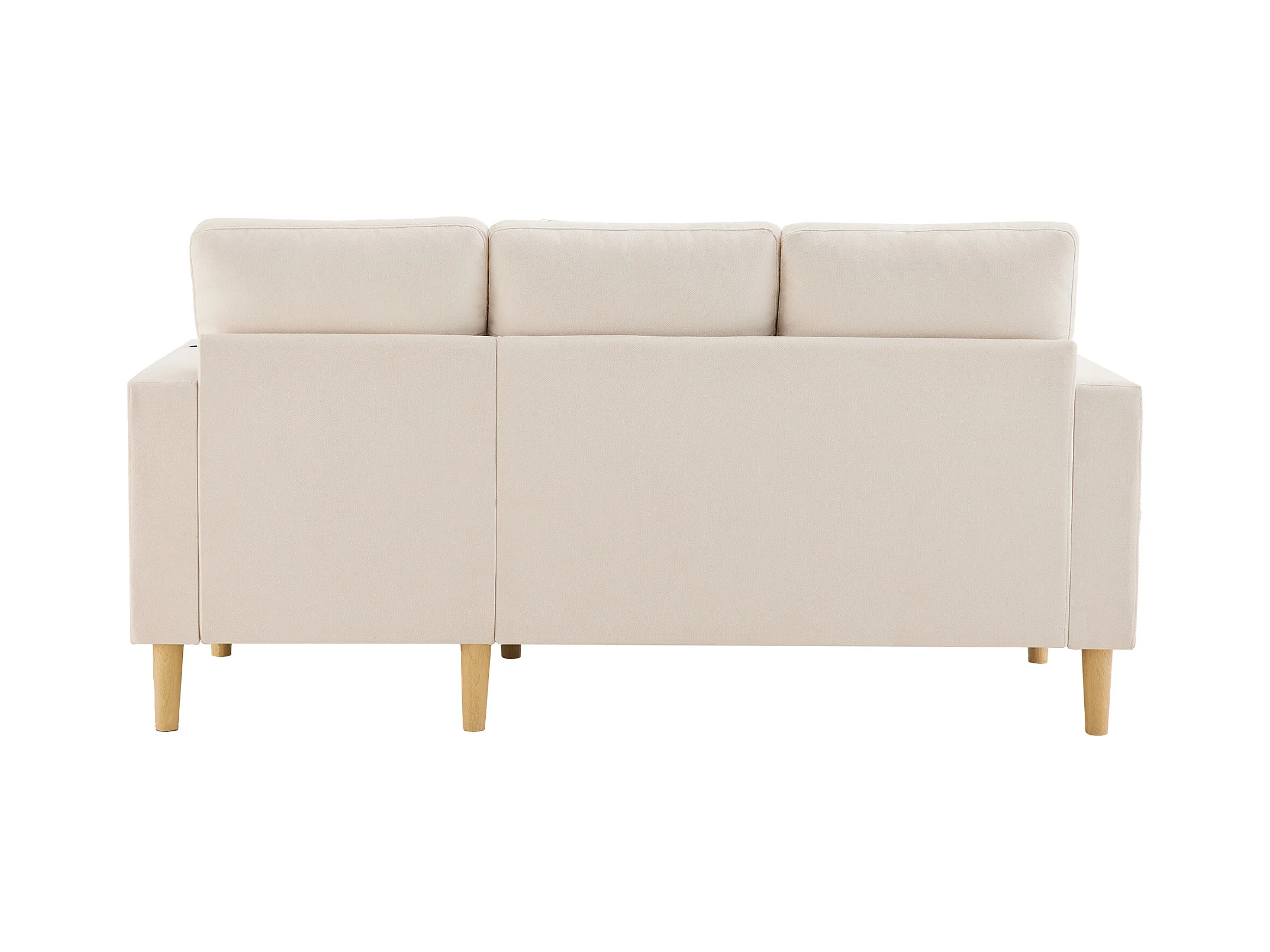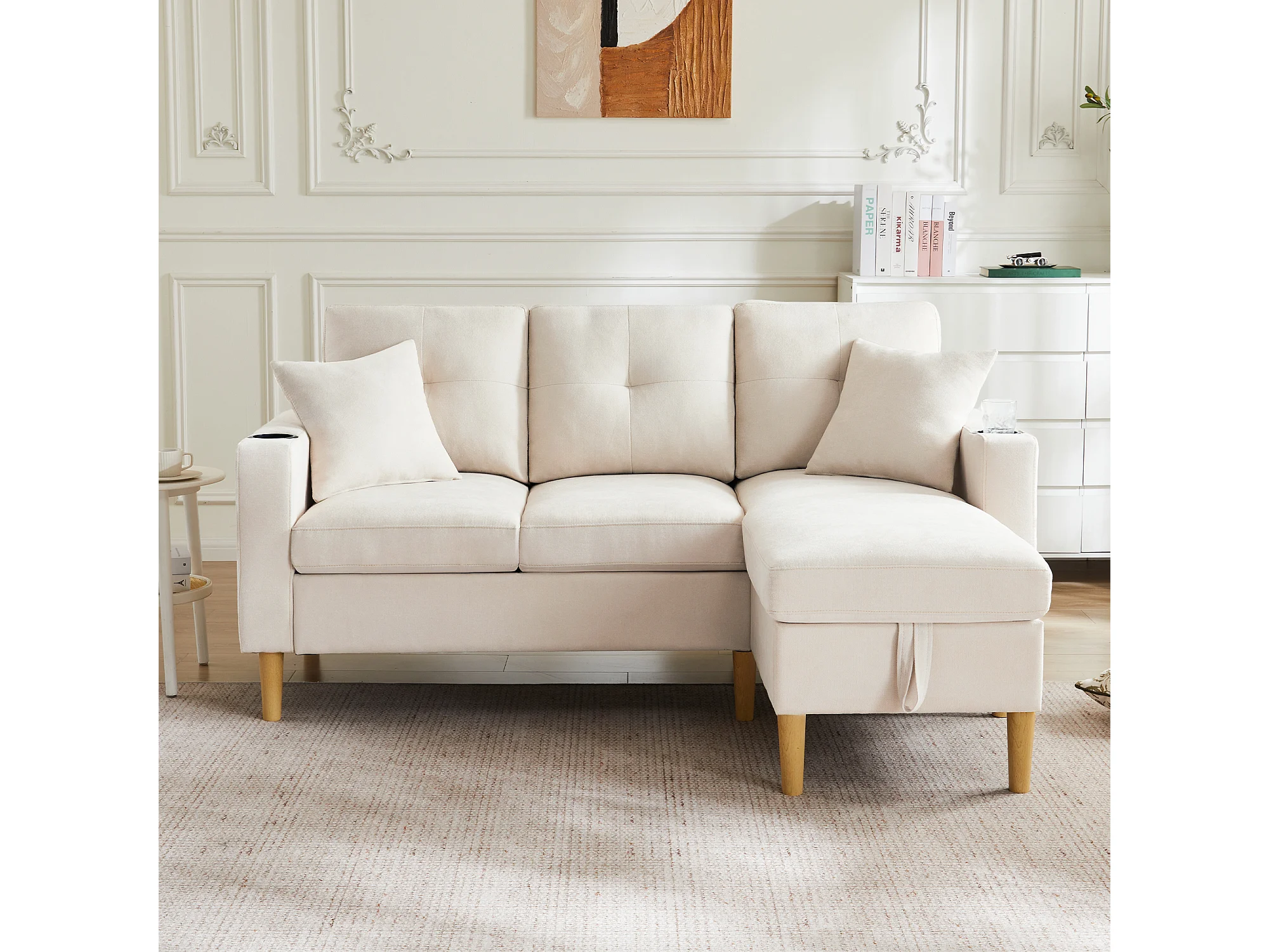 Sofá de canto em L de 3 lugares com 2 almofadas, suporte para copos e arrumação, tecido bege de algodão e linho