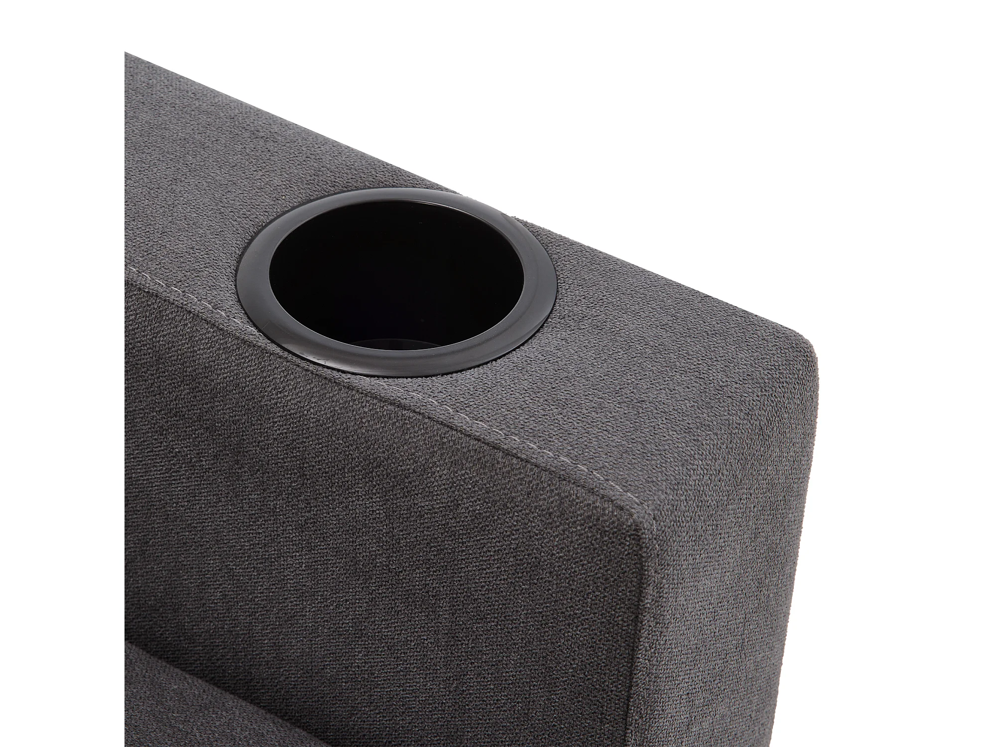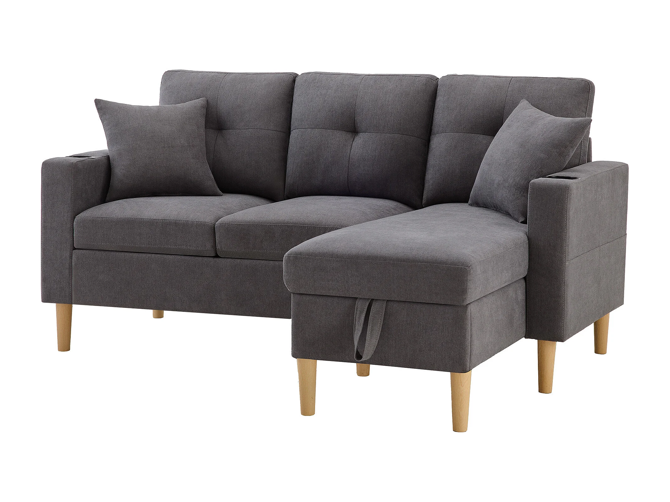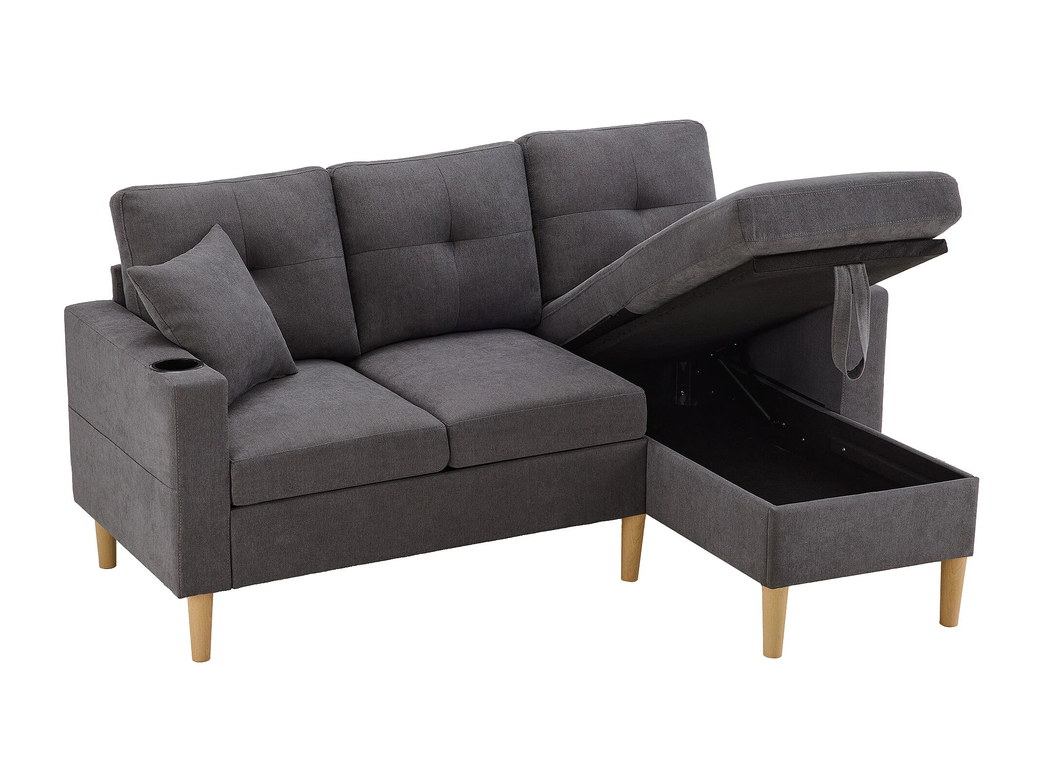 Sofá de canto em L de 3 lugares com 2 almofadas, suporte para copos e arrumação, tecido de algodão e linho cinza escuro
