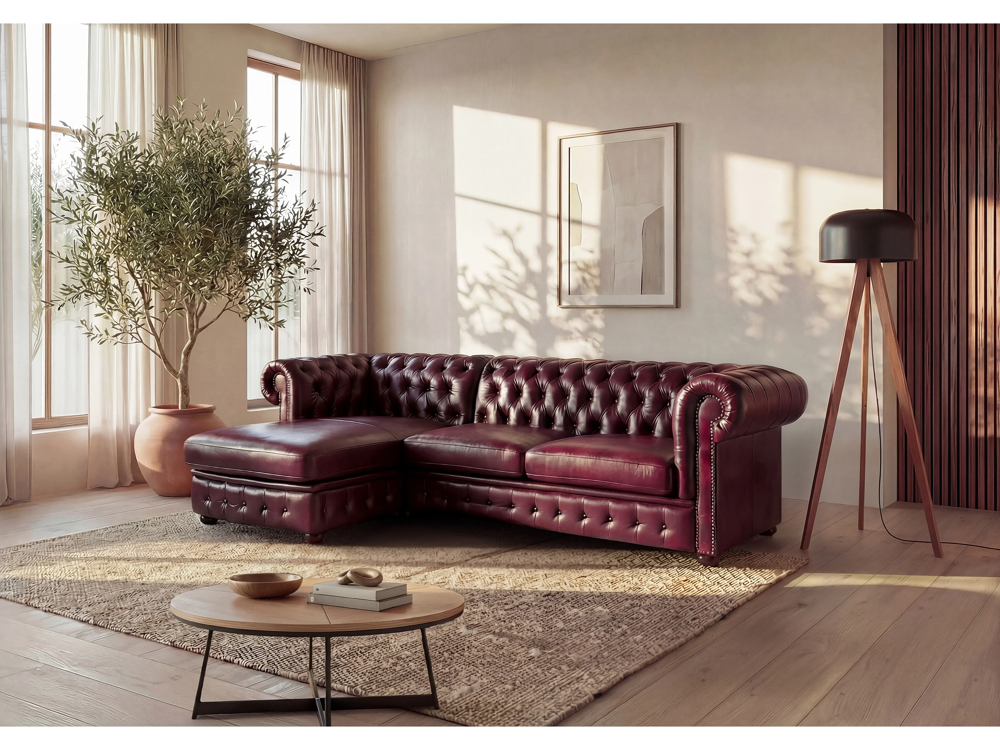 Sofá de canto esquerdo chesterfield 100% pele de búfalo disponível em cor Cereja - BRENTON