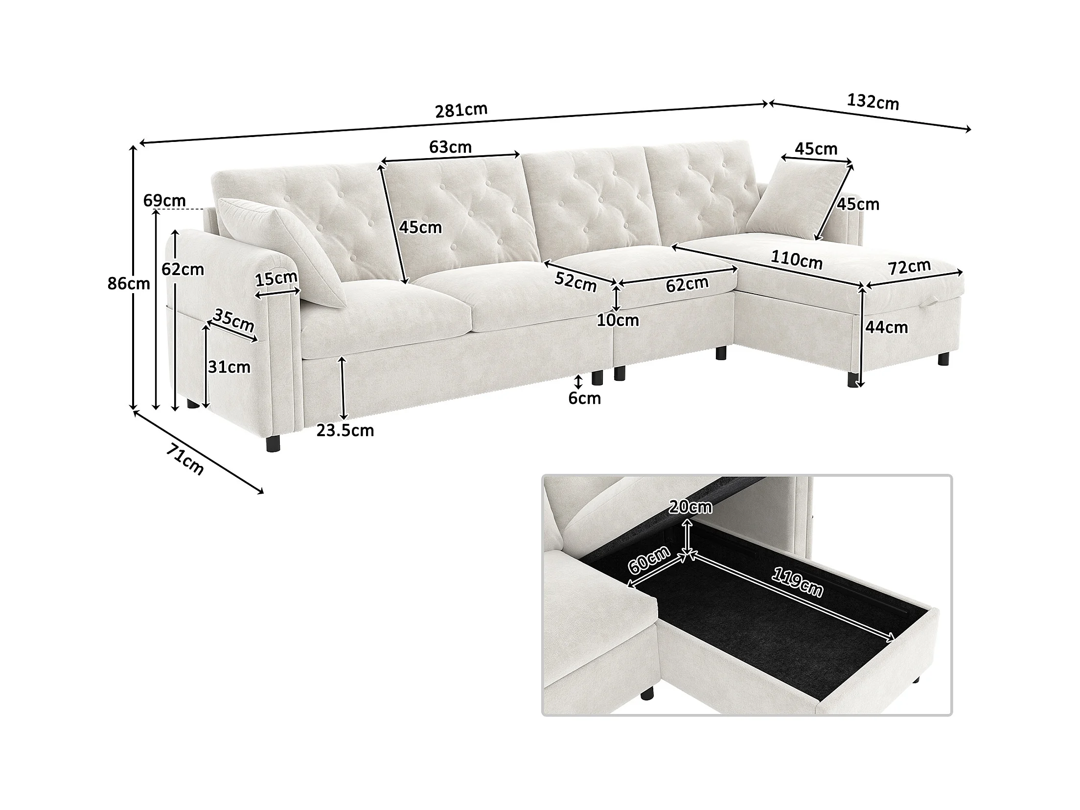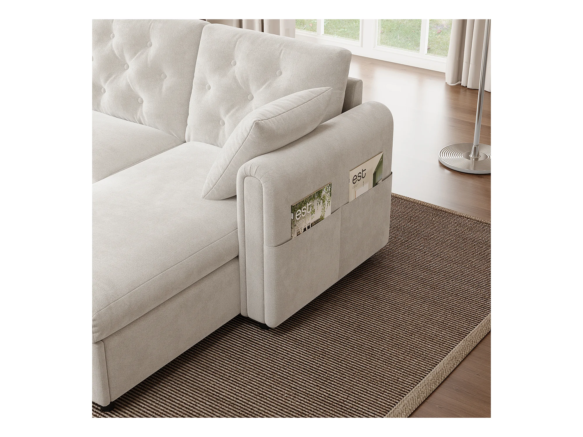 Sofá de canto moderno em L - Com espaço de armazenamento - Ajustável para esquerda e direita - Com bolsos laterais de armazenamento - Veludo - Bege