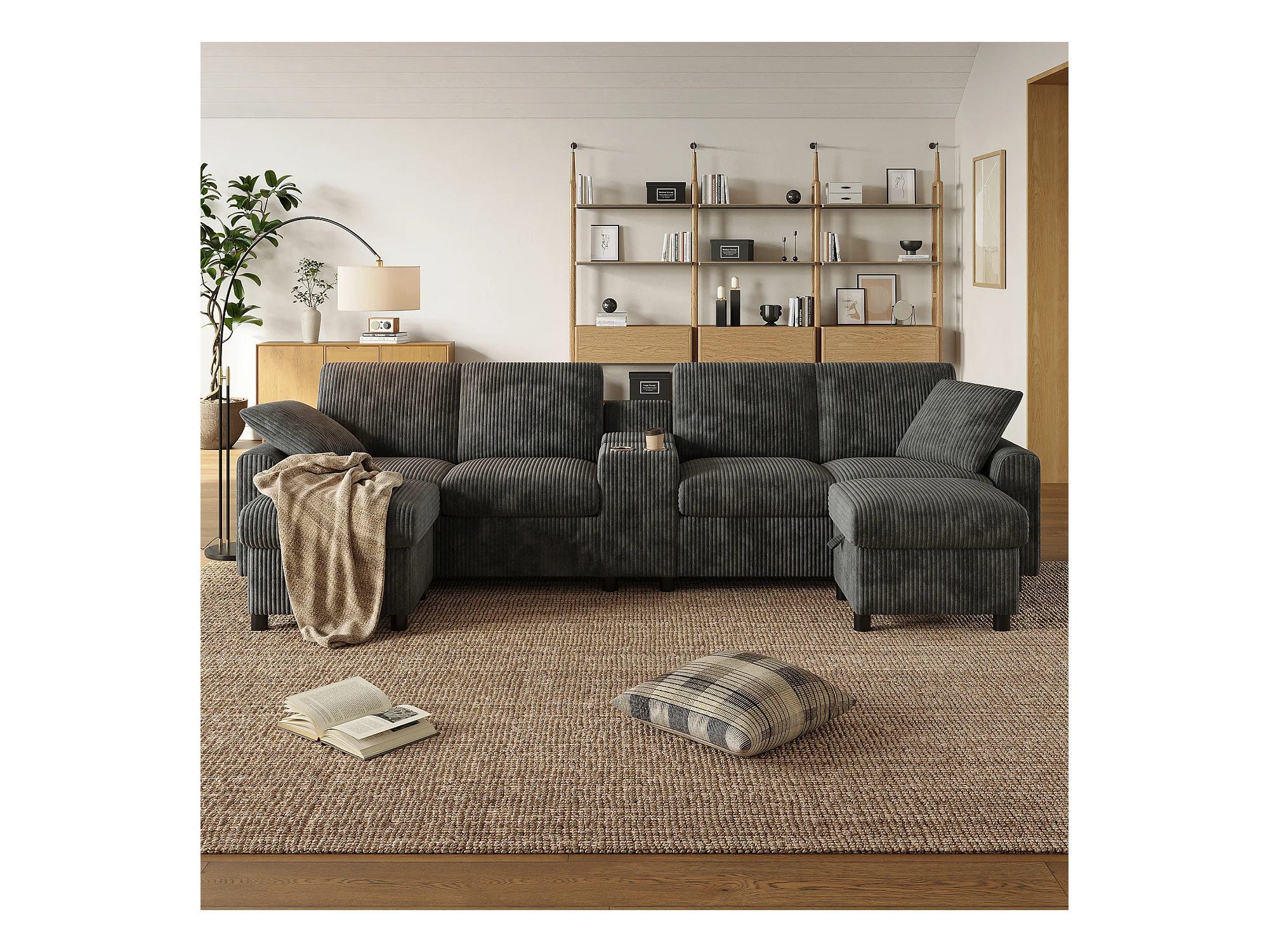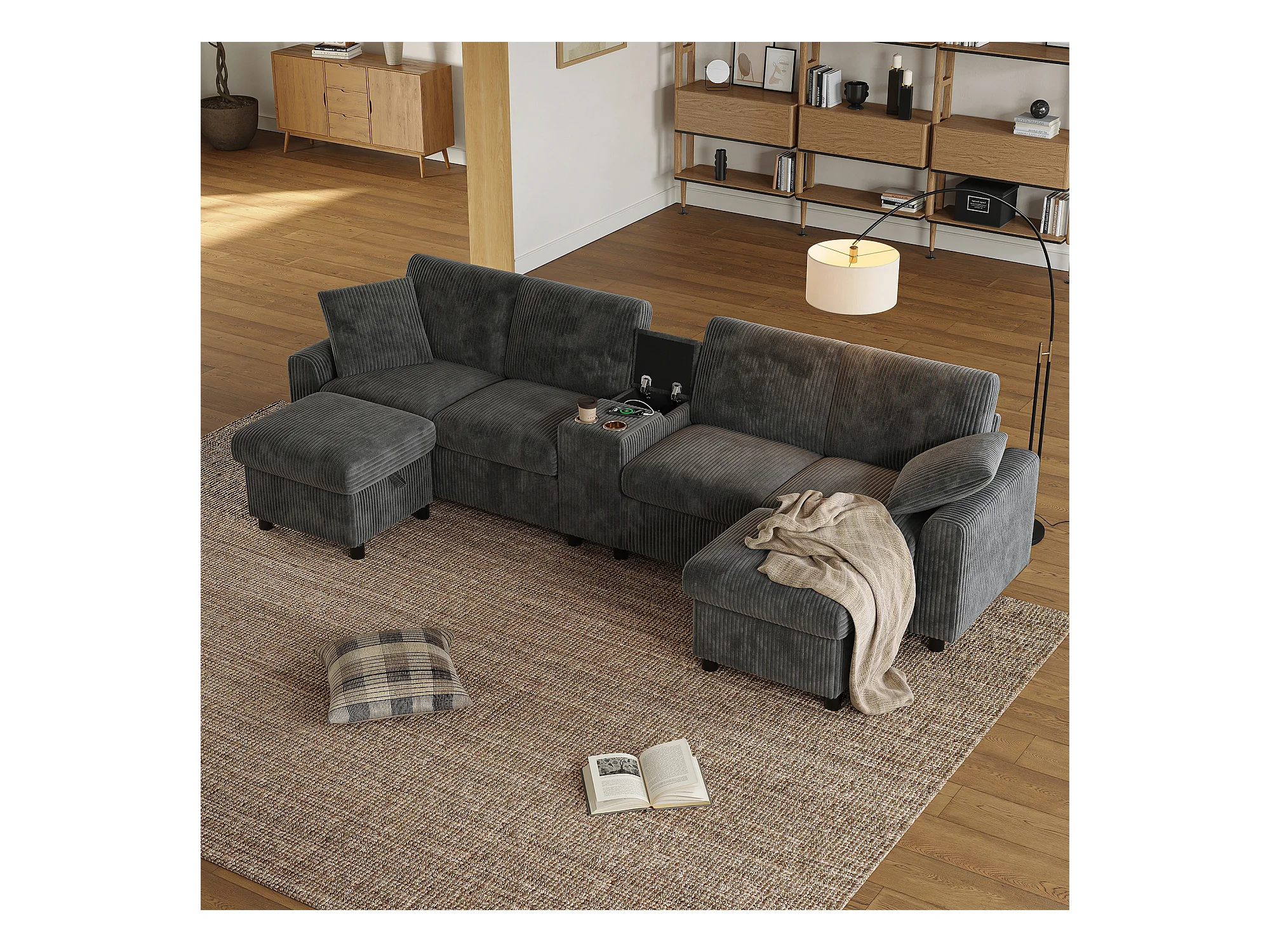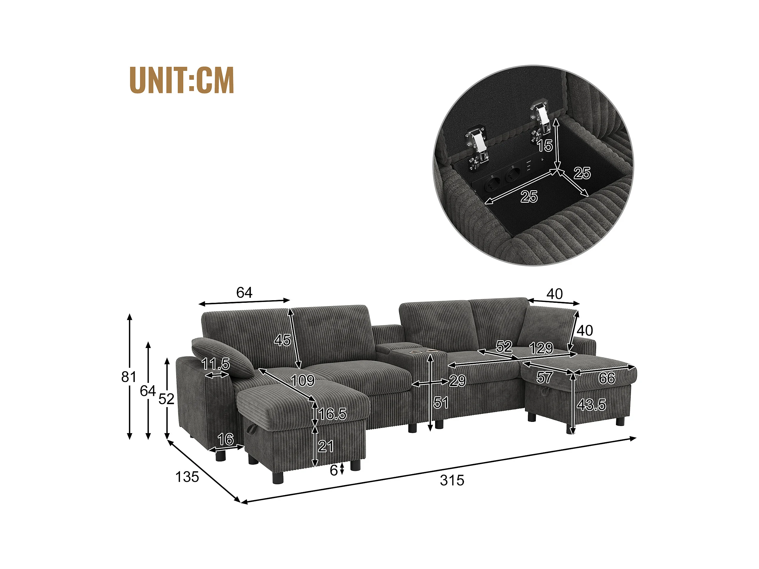 Sofá de canto moderno em U - com USB e Type-C - com 2 pés de apoio com armazenamento - com 2 porta-copos - veludo canelado - Cinza