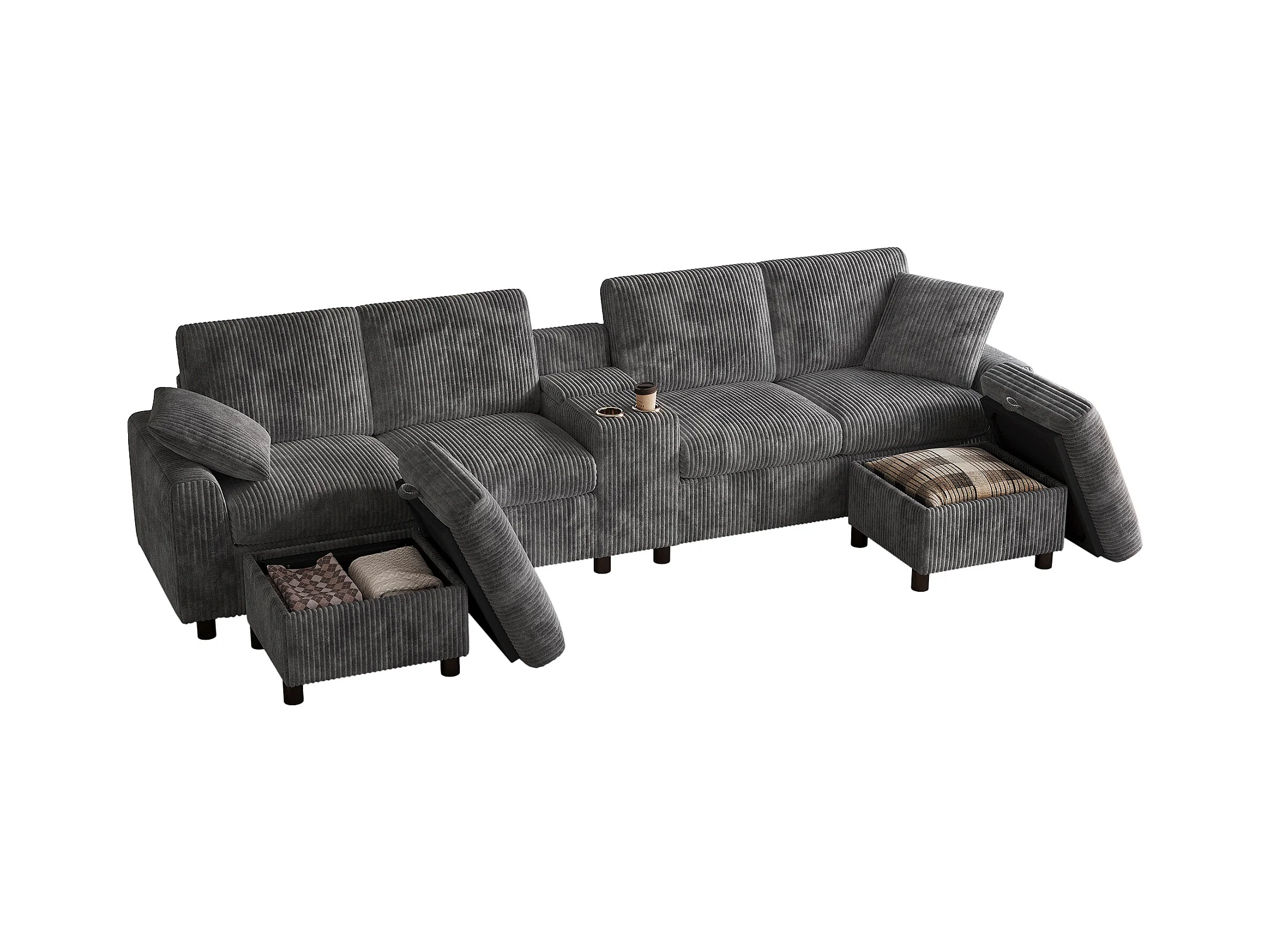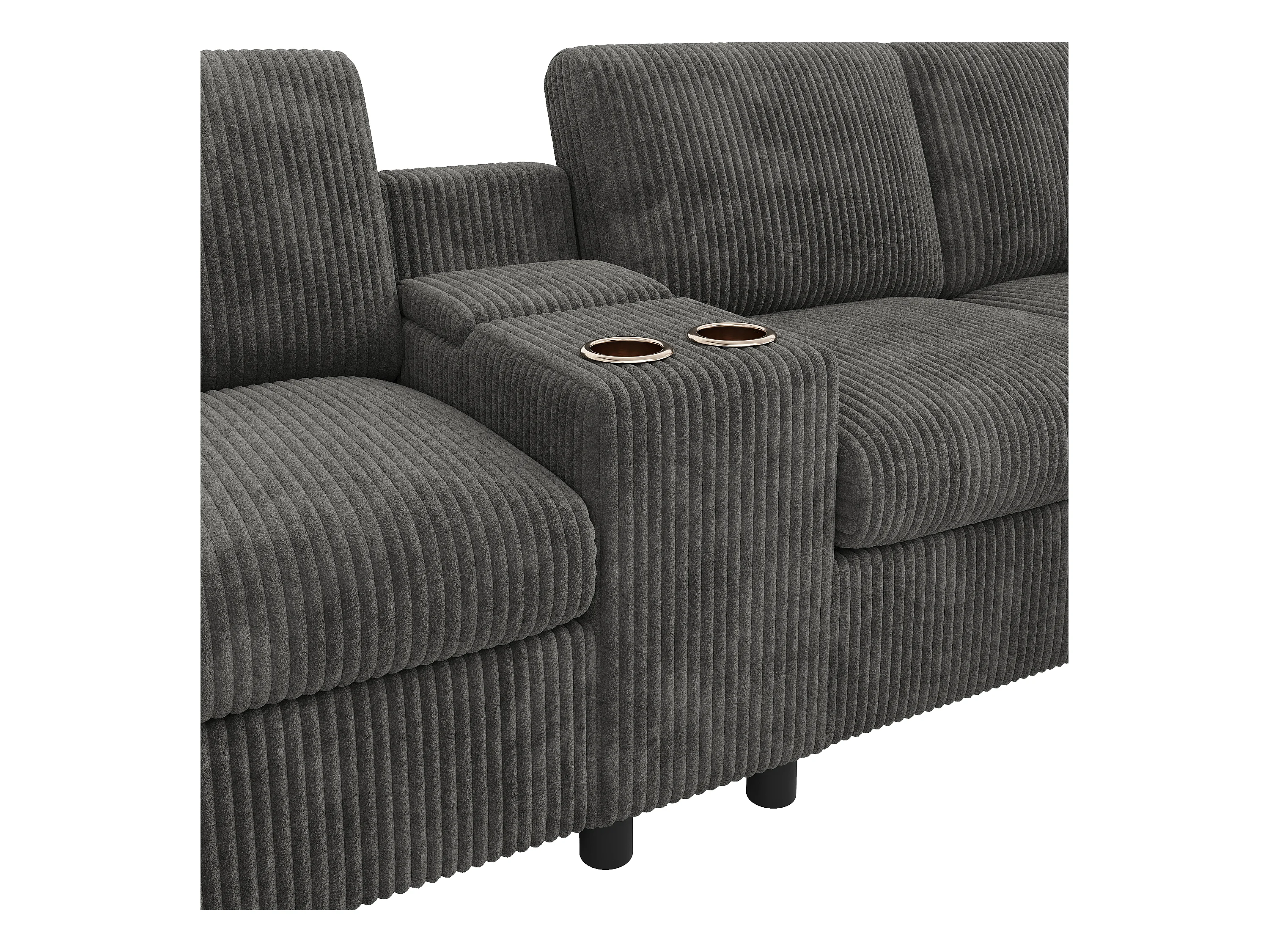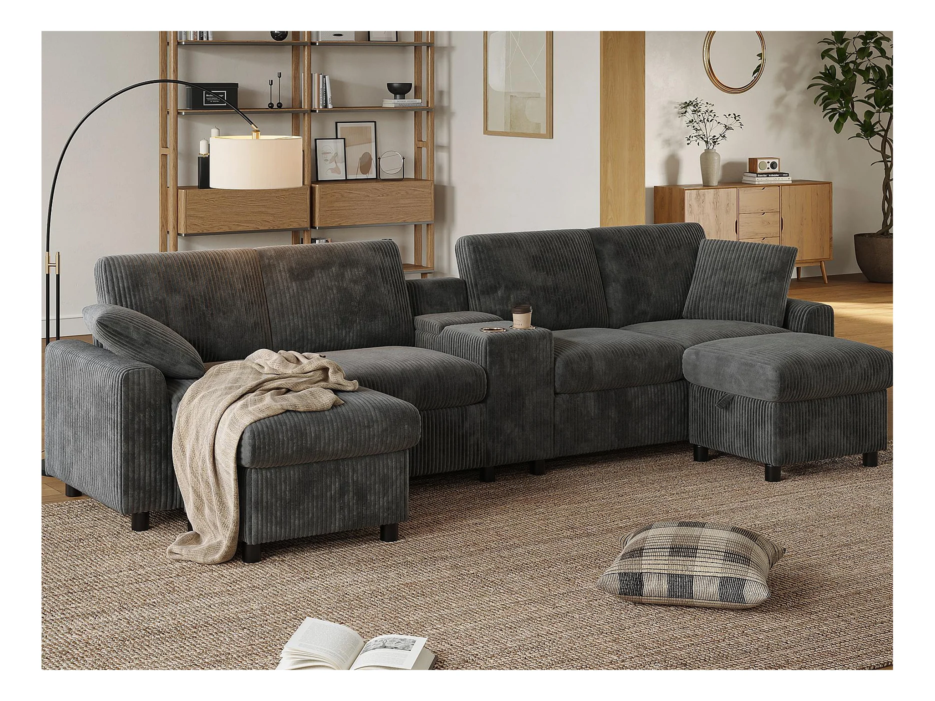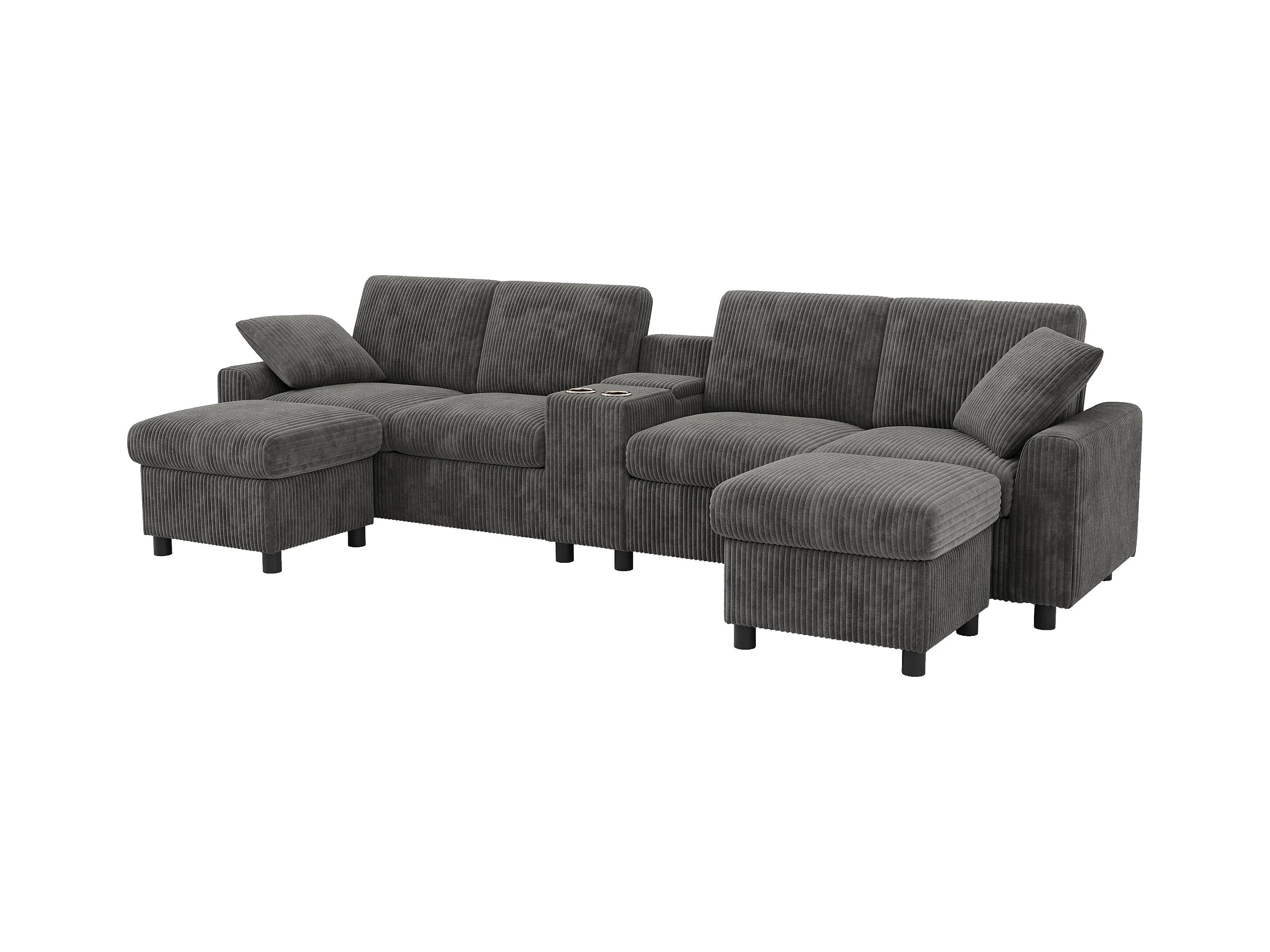 Sofá de canto moderno em U - com USB e Type-C - com 2 pés de apoio com armazenamento - com 2 porta-copos - veludo canelado - Cinza