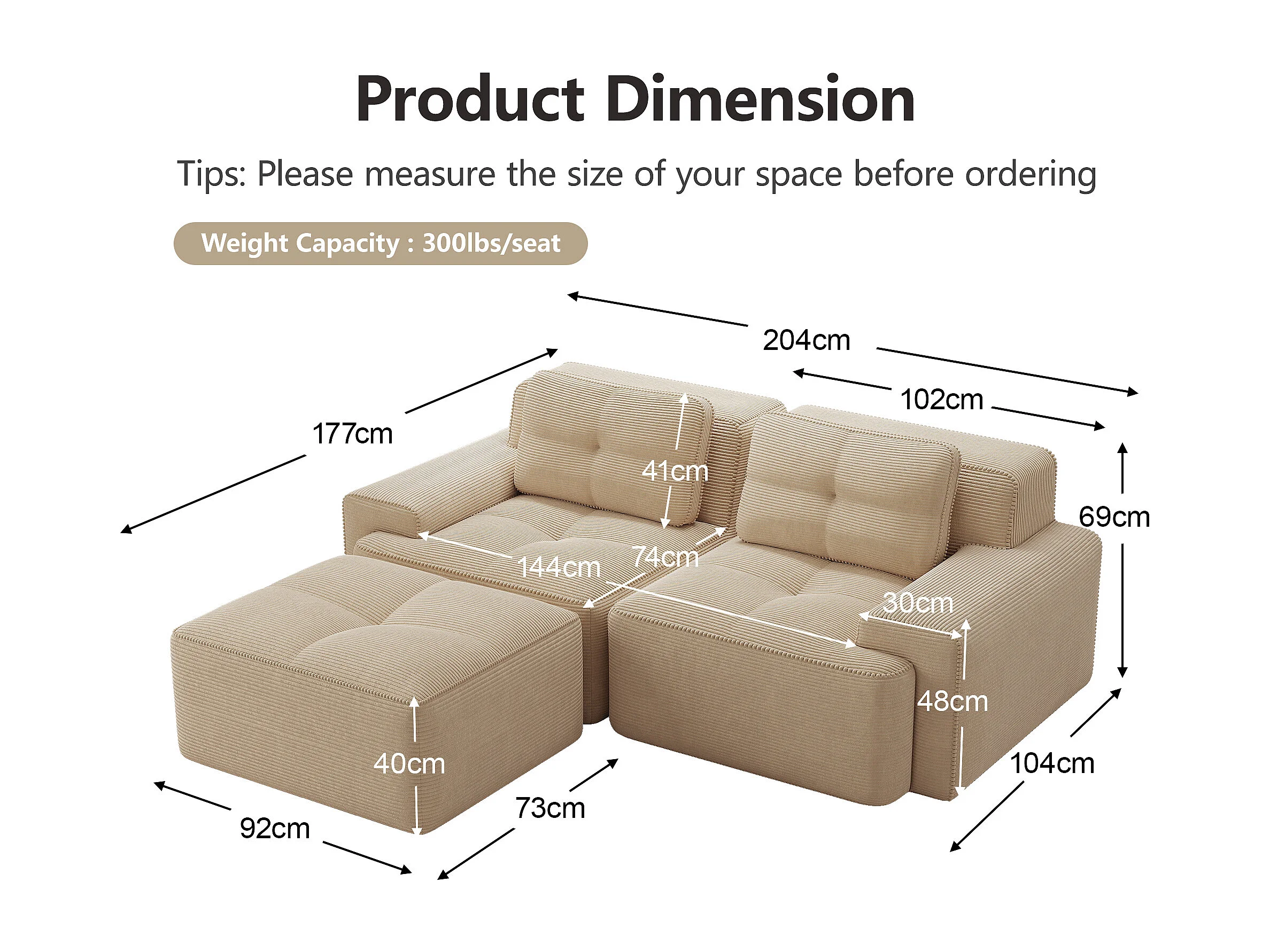 Sofá de canto modular sem estrutura em veludo cotelê bege - Design moderno e elegante