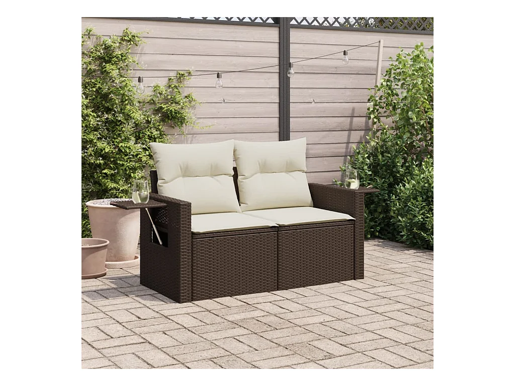 Sofá de jardim com almofadas de resina tecida marrom de 2 lugares