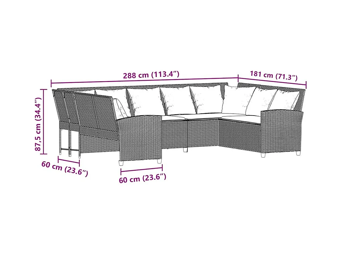 3pcs conjunto sofás de jardim com almofadões em L vime PE preto