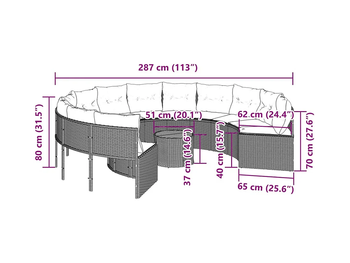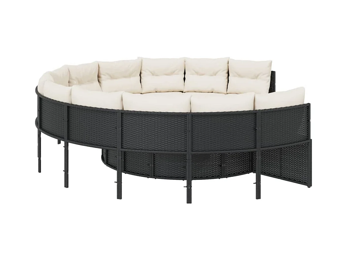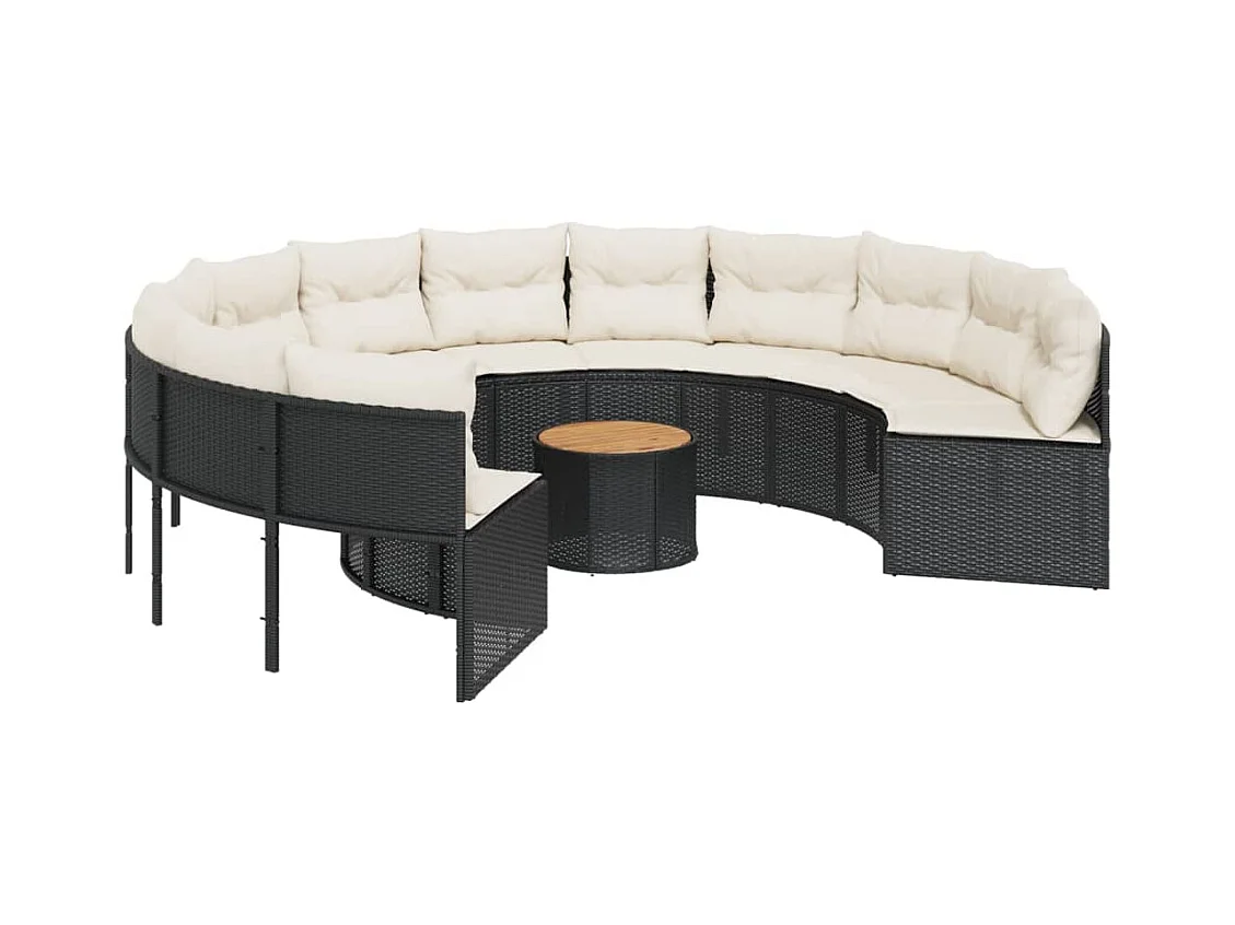 Sofá de jardim com mesa e almofadões redondo vime PE preto