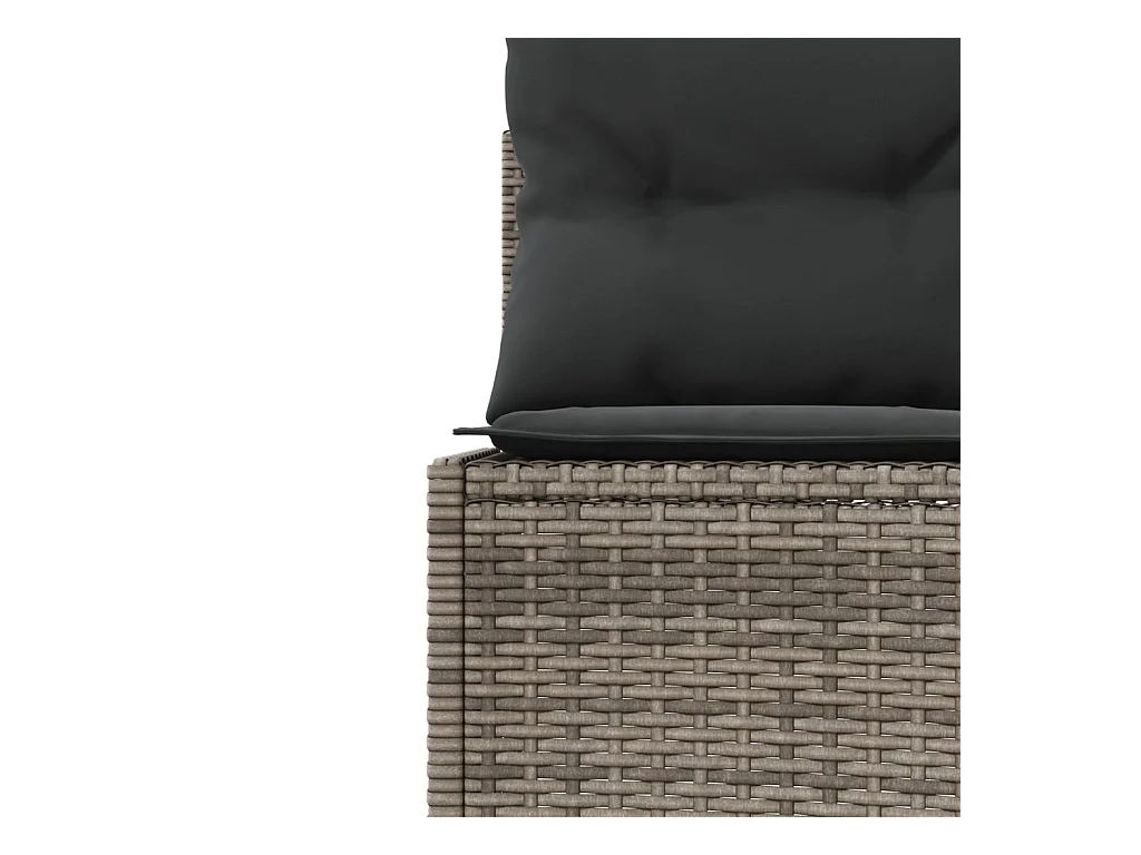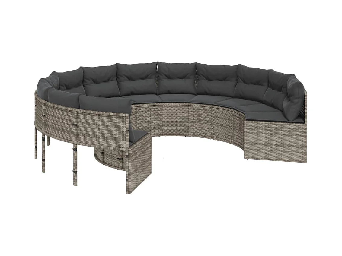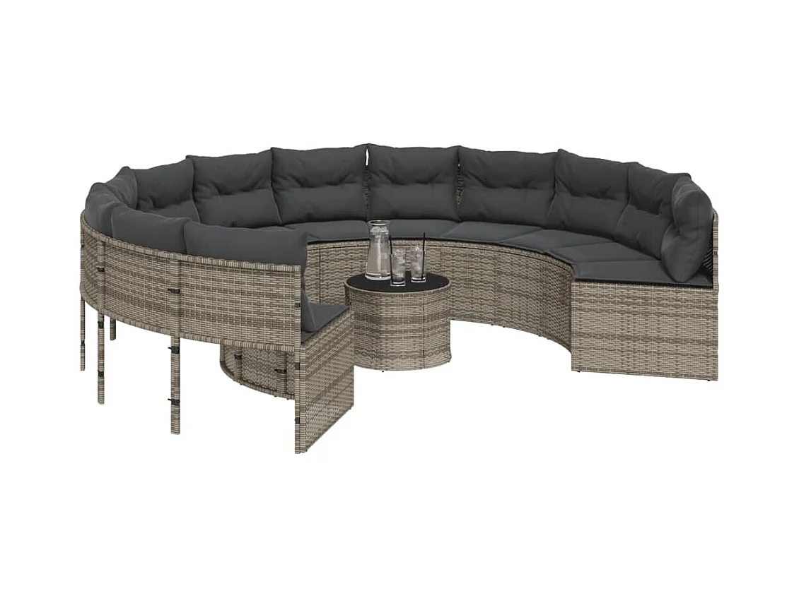 Sofá de jardim com mesa redonda de almofadas de resina tecida cinza