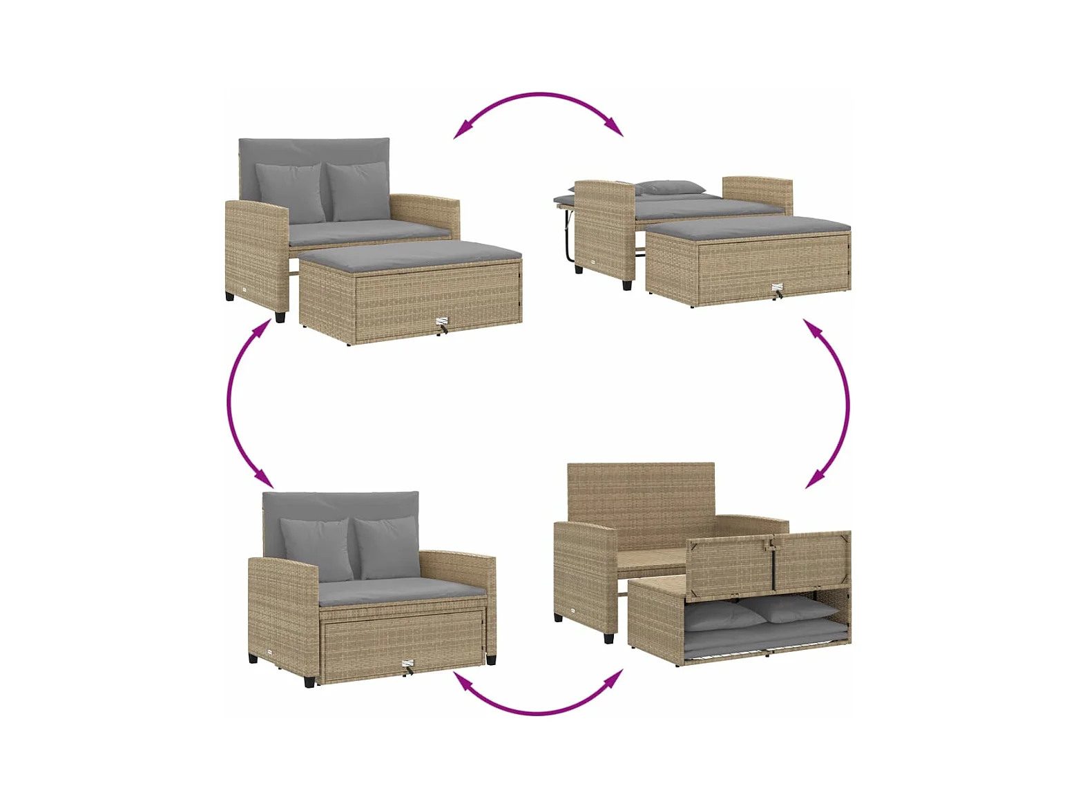 Sofá de jardim reclinável 2 lugares com mesa vime PE bege PT776724