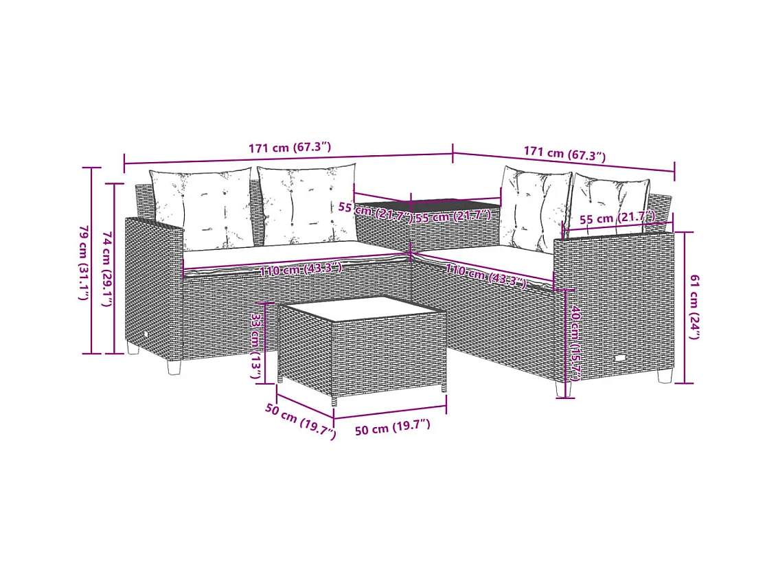Sofá de jardim forma de L c/ mesa e almofadões vime PE cinzento