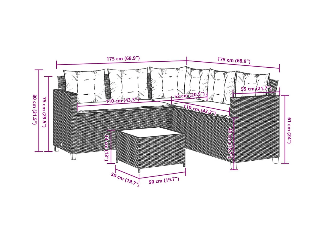 Sofá de jardim forma de L c/ mesa e almofadões vime PE cinzento