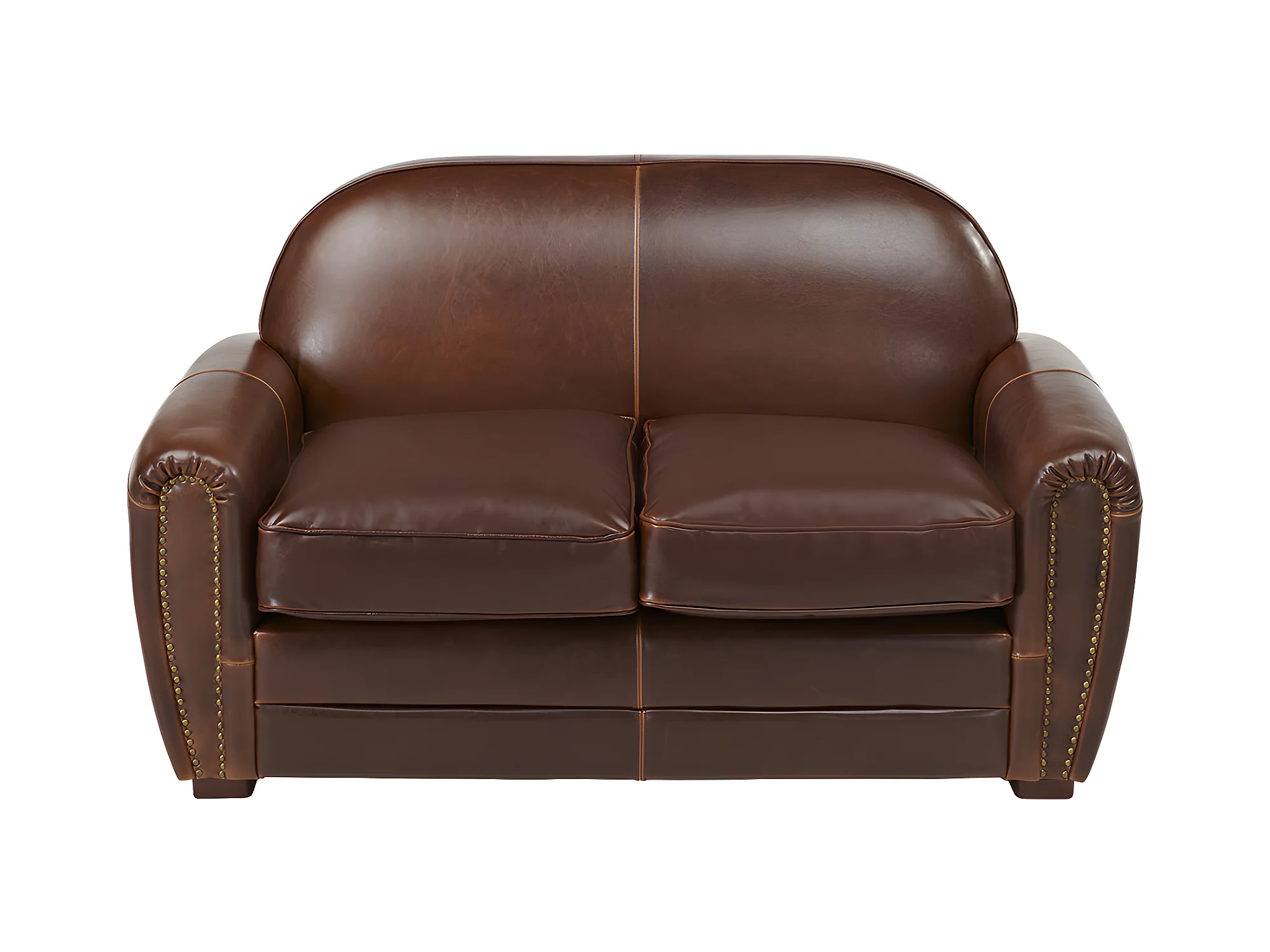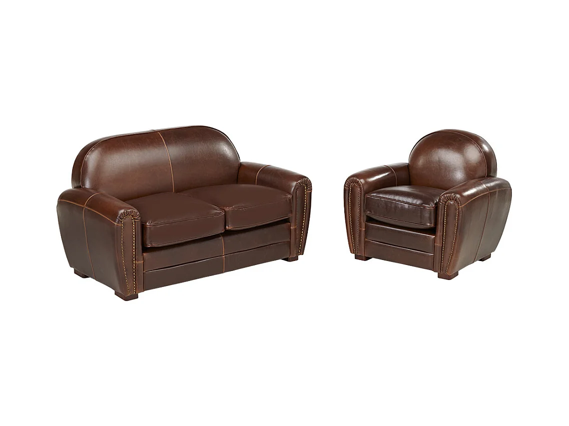 Sofá e poltrona club em pele envelhecida Castanho - BAUDOIN