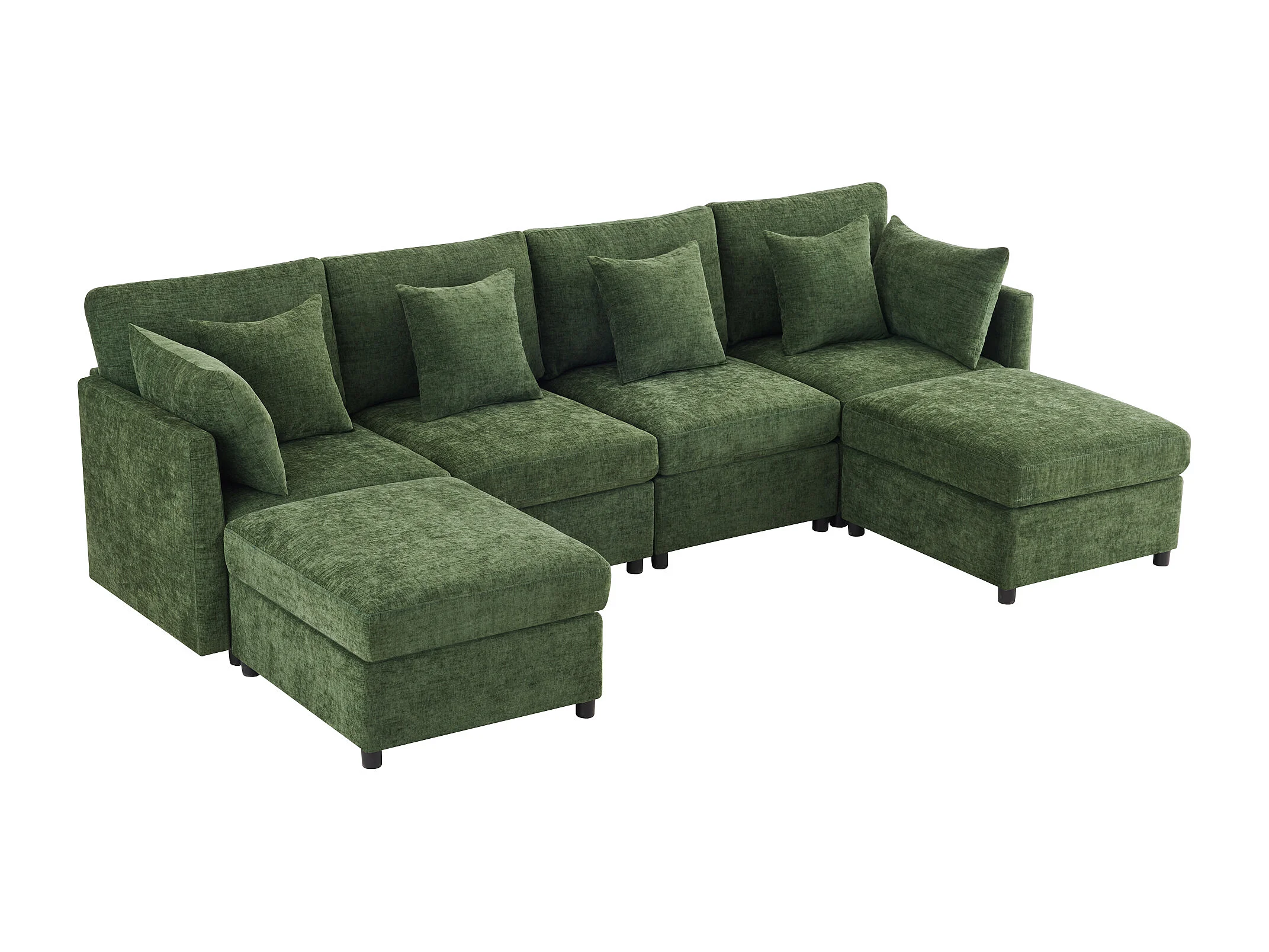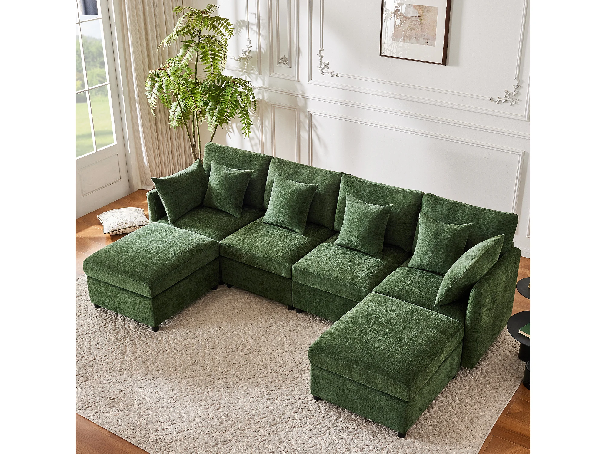 Sofá moderno - 4 lugares - conversível em U e L - con 2 descansos para pés + 6 almofadas - tecido de chenille - verde