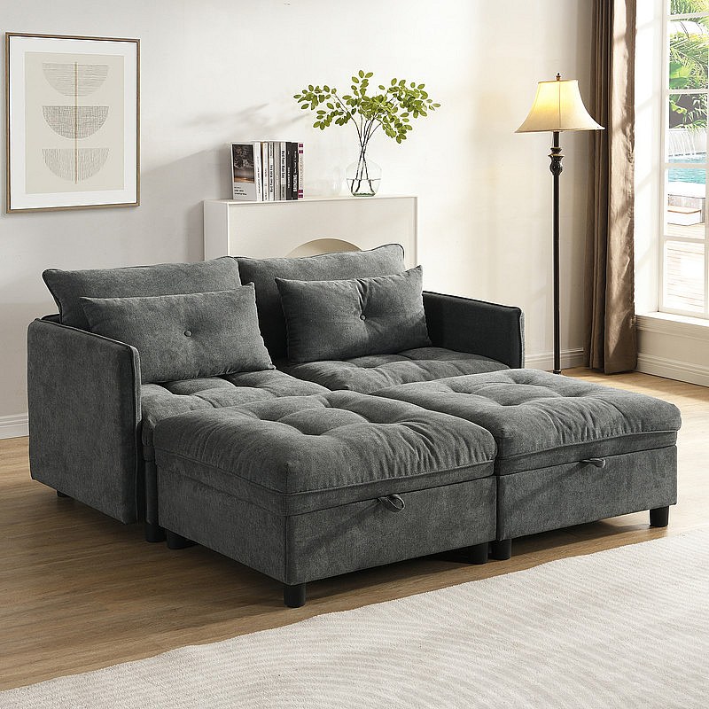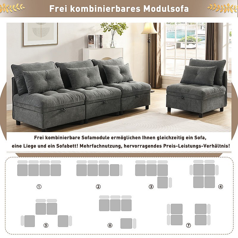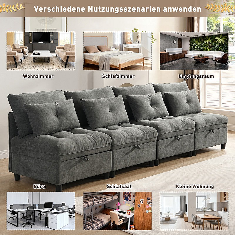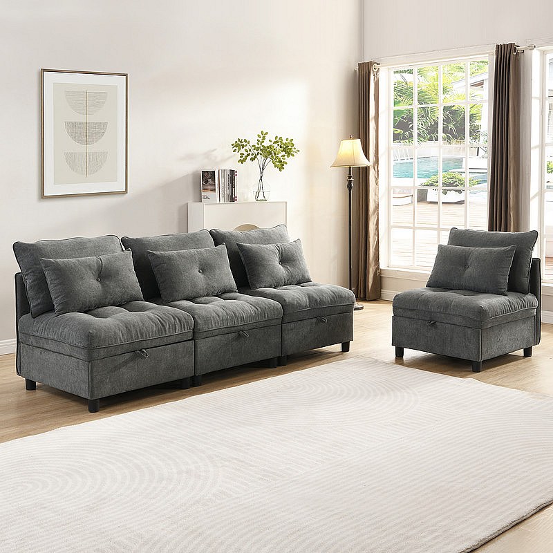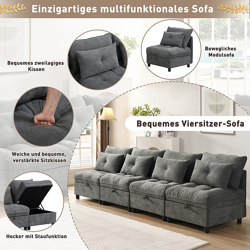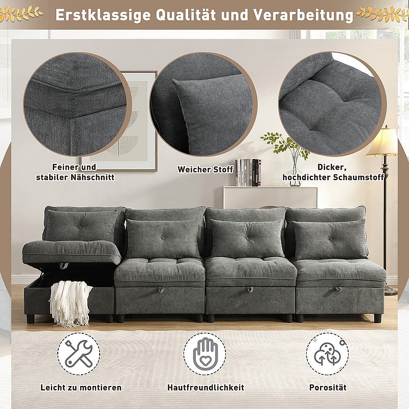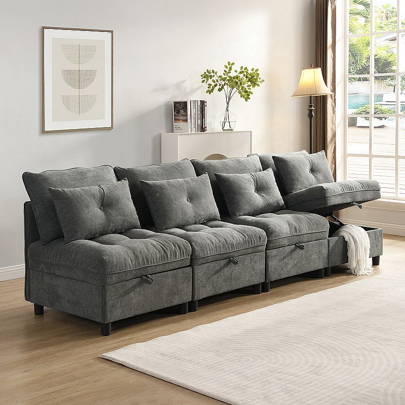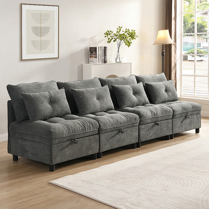 Sofá Modular 4 Lugares em Chenille - com 8 Almofadas e 4 Armazenamentos - Carga Máx. 500kg - 274x76x87cm - Cinza