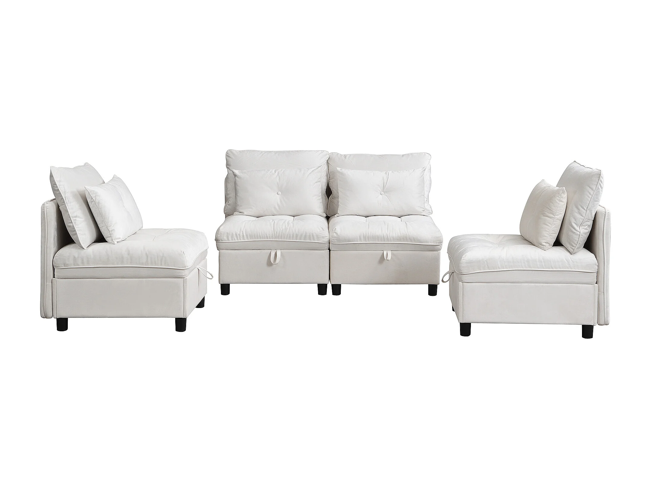 Sofá modular 4 lugares + espaço de armazenamento + revestimento em pelúcia - com combinação de sofá-cama - Bege