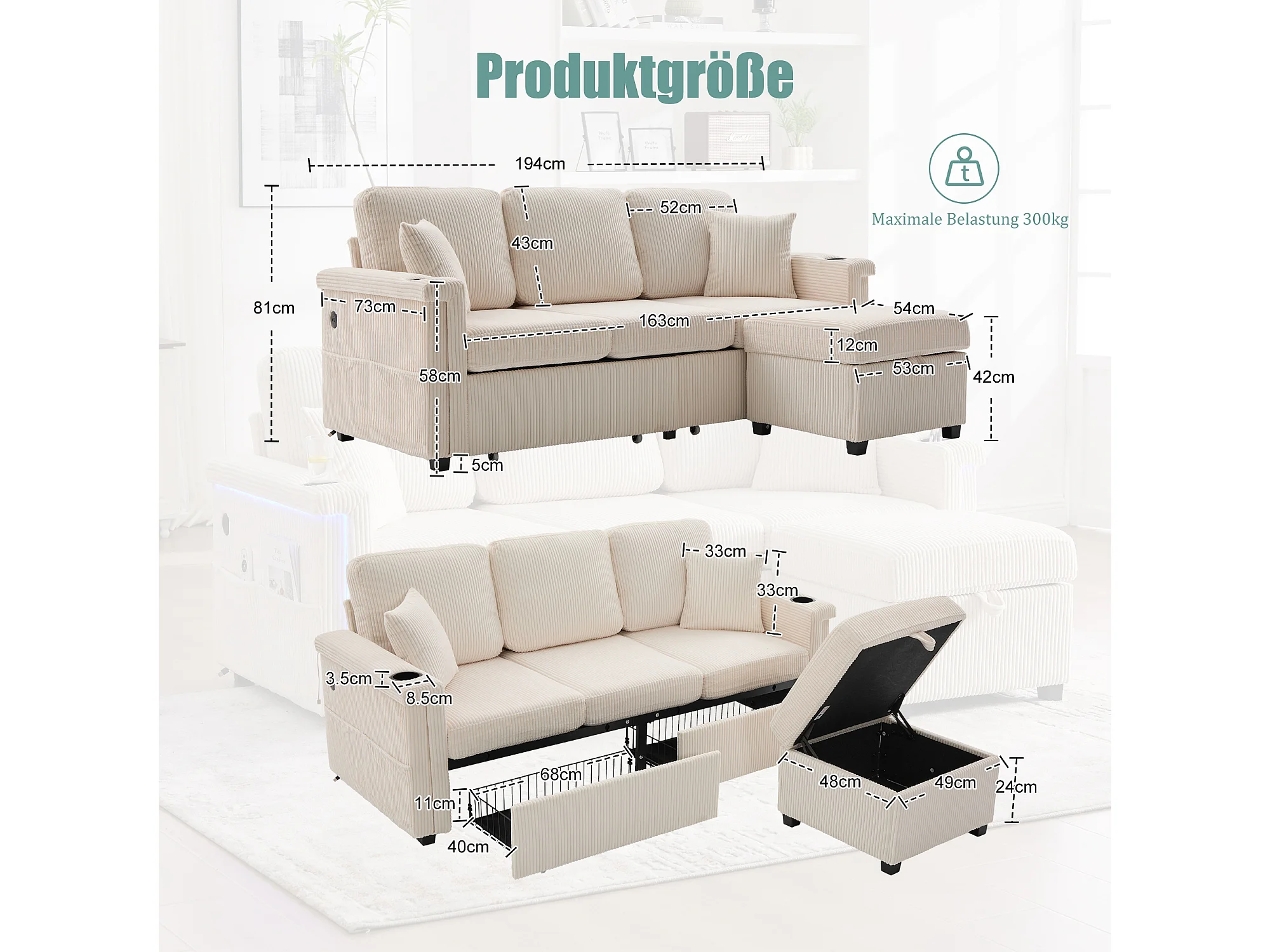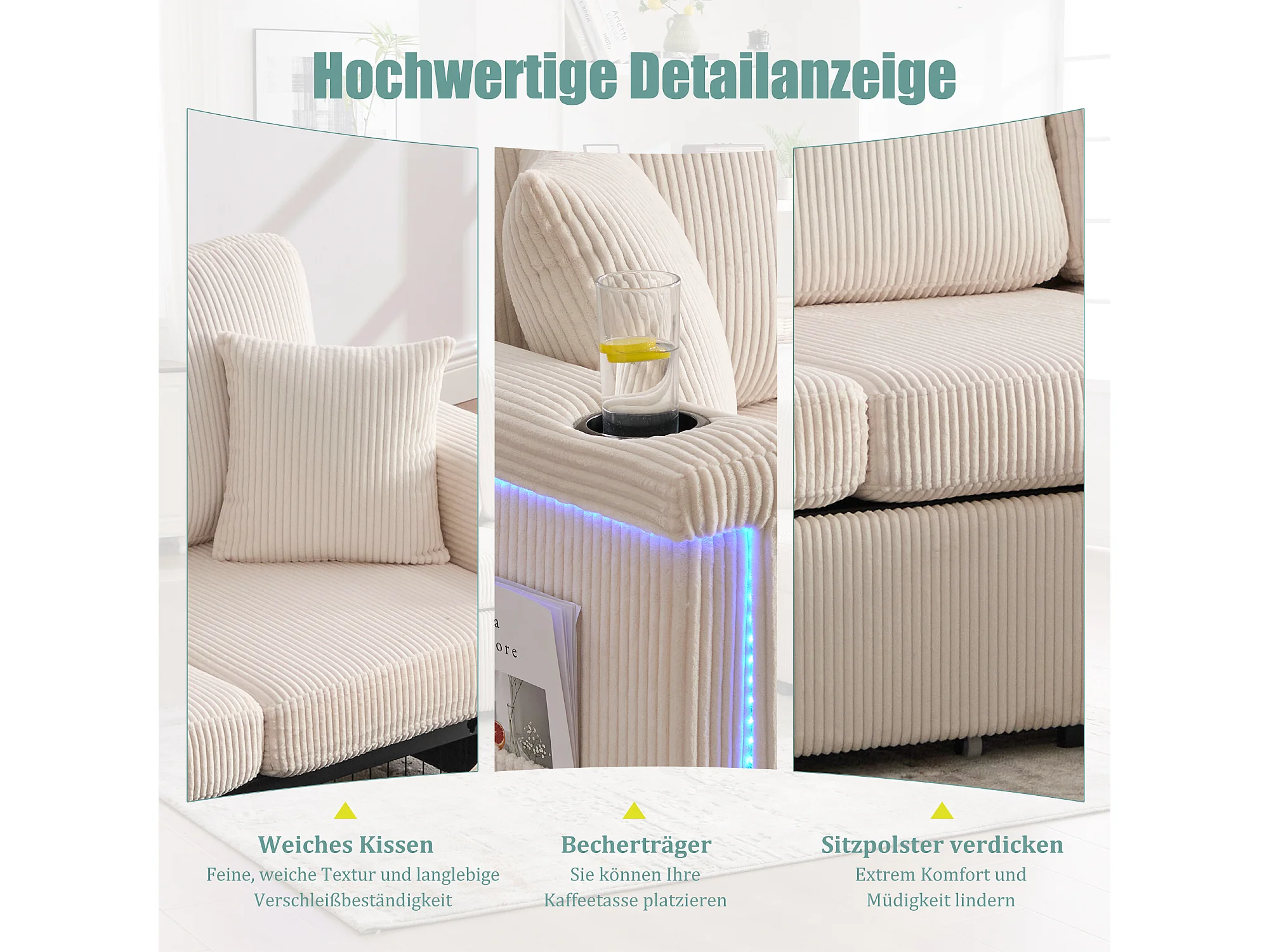 Sofá modular de veludo com LED e armazenamento USB tipo C para sala de estar e quarto bege