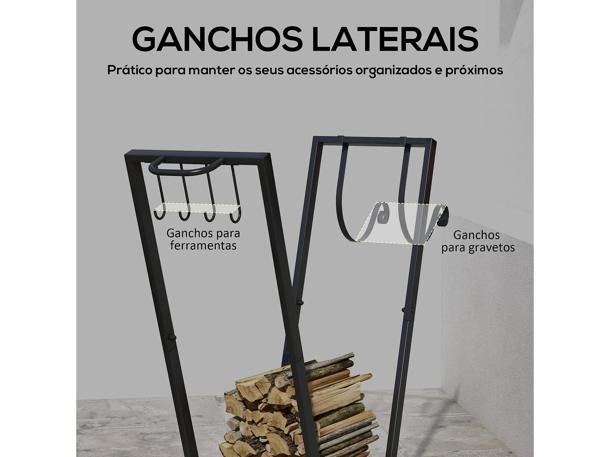 Suporte para Lenha em Metal – 34x34x111 cm | Com Ganchos e Ferramentas para Lareira