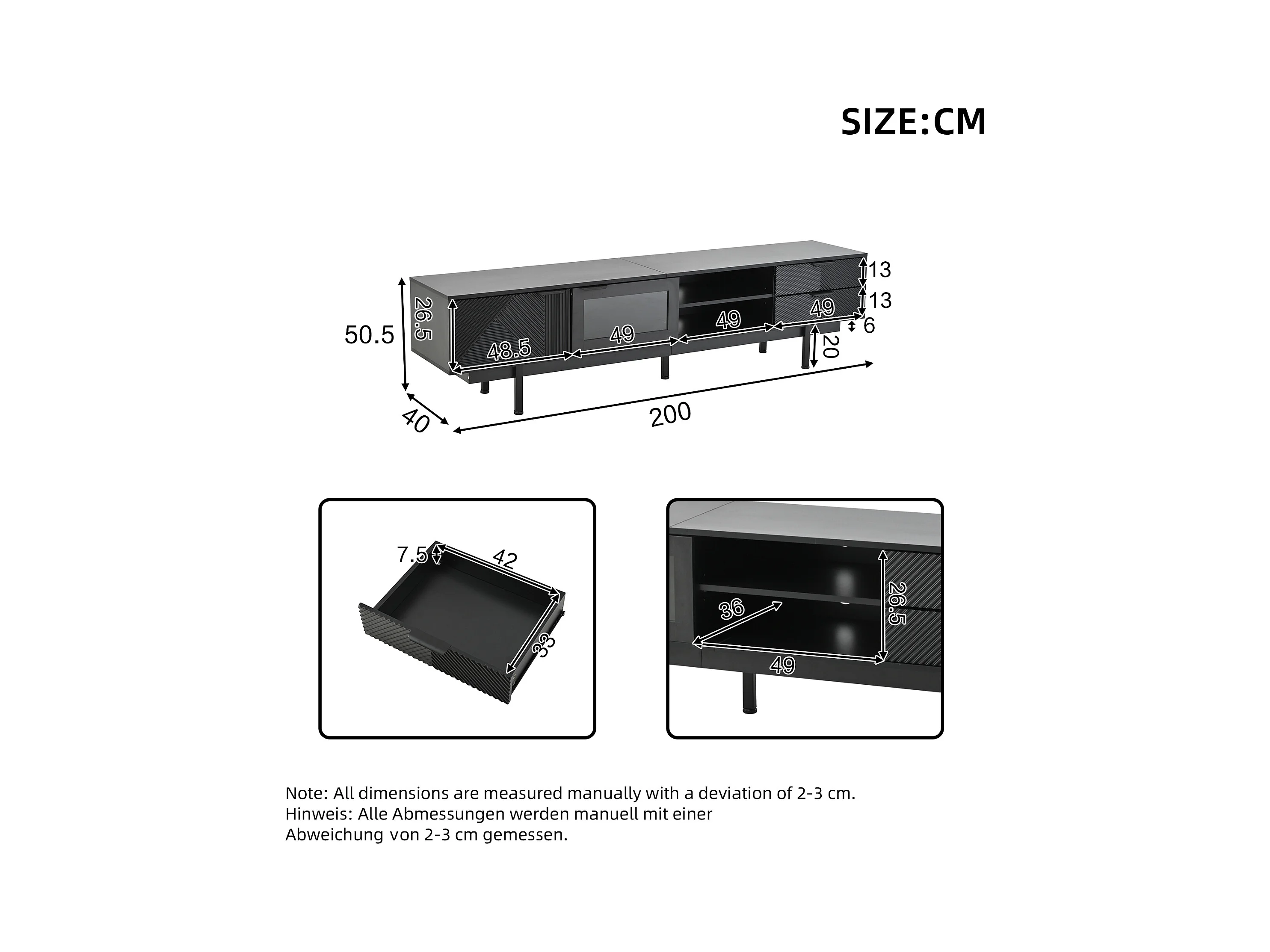 Suporte de TV boêmio com espaço de armazenamento, portas de armário minimalistas, 200 x 40 x 51 cm, preto