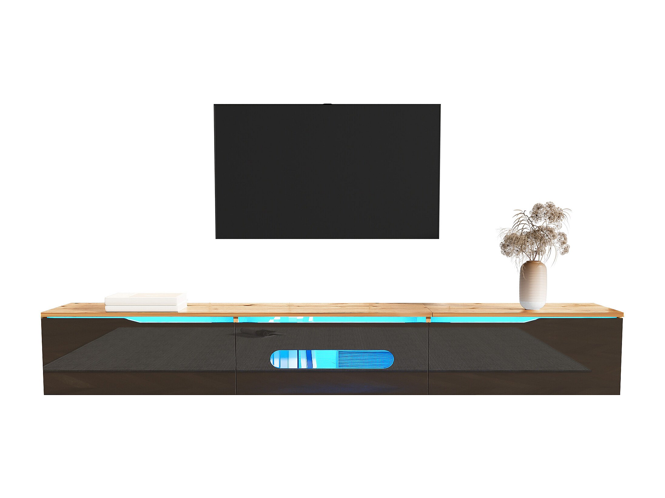 Suporte de TV de 180 cm preto e madeira LED RGB 16 cores montado na parede para sala de estar moderna