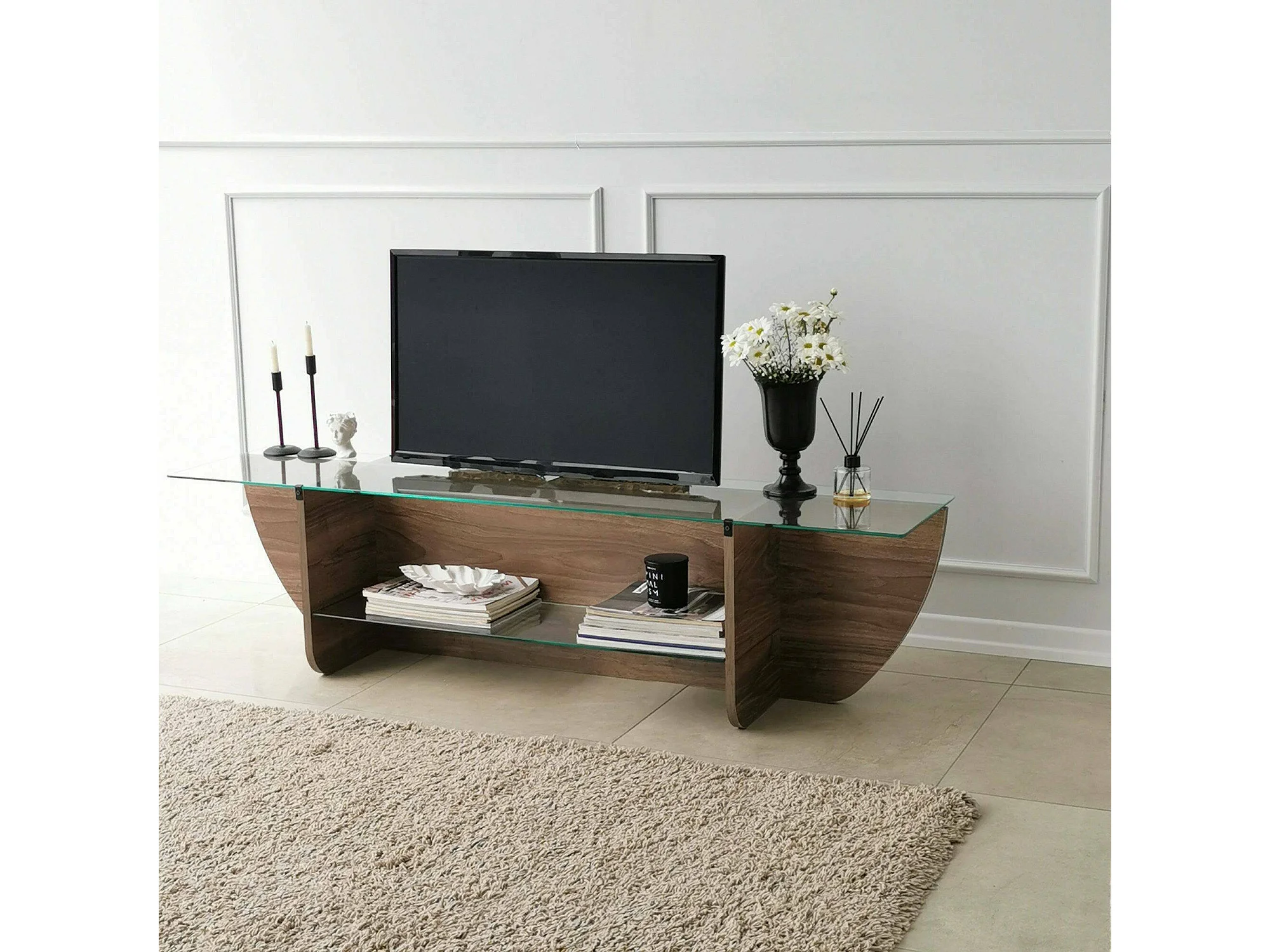 Suporte de TVDmarcoli, Aparador de sala, Armário de TV baixo, Base de parede equipada, 158x35h40 cm, Nogueira
