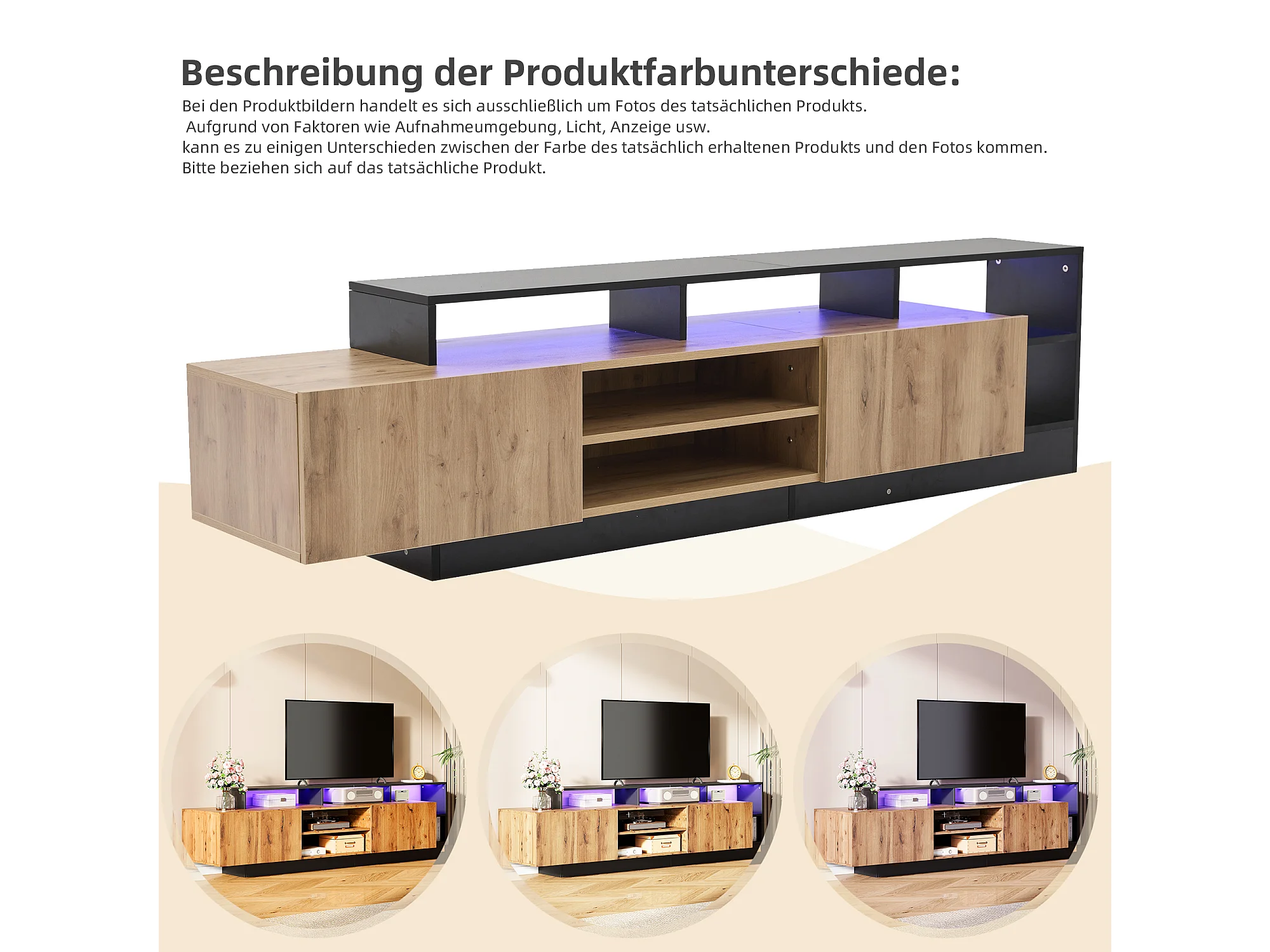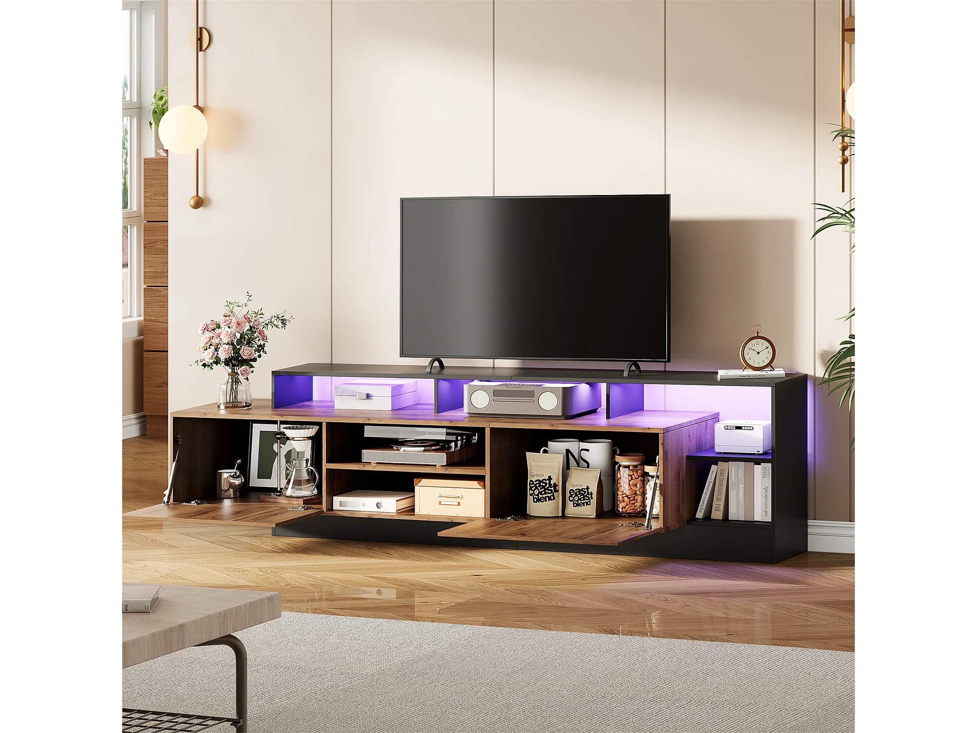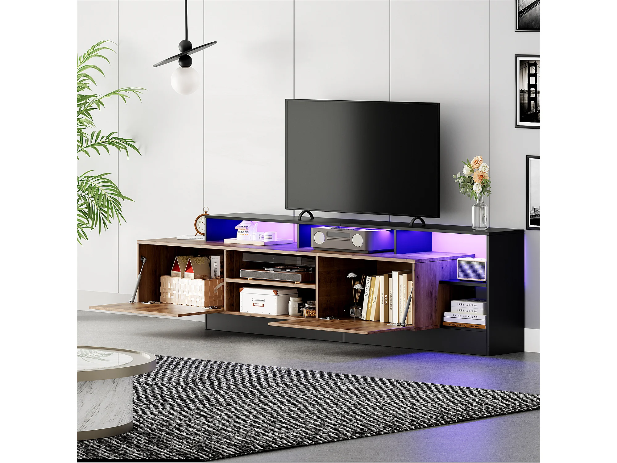 Suporte para TV de 190 cm, moderno, com luzes LED, 2 portas e compartimento de armazenamento aberto, preto.