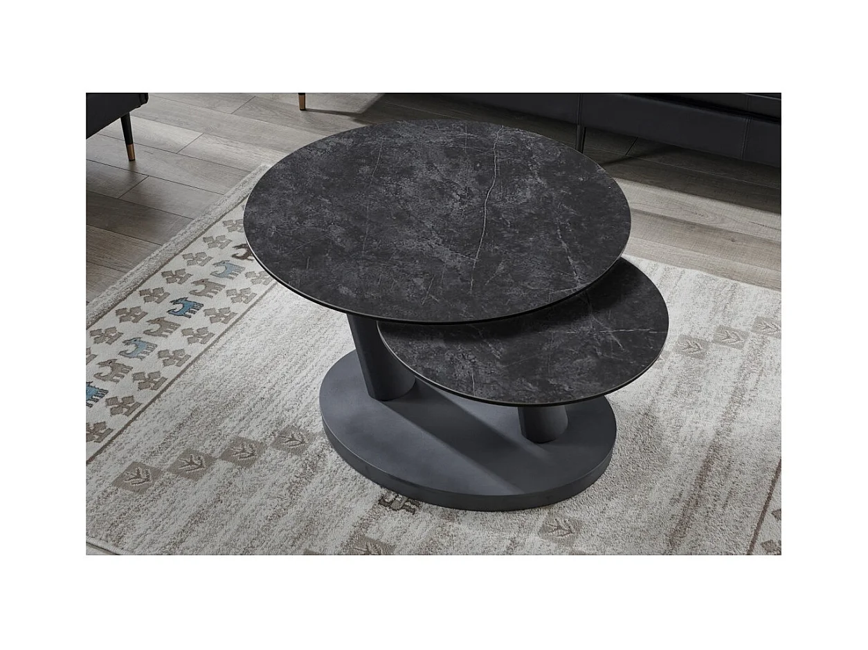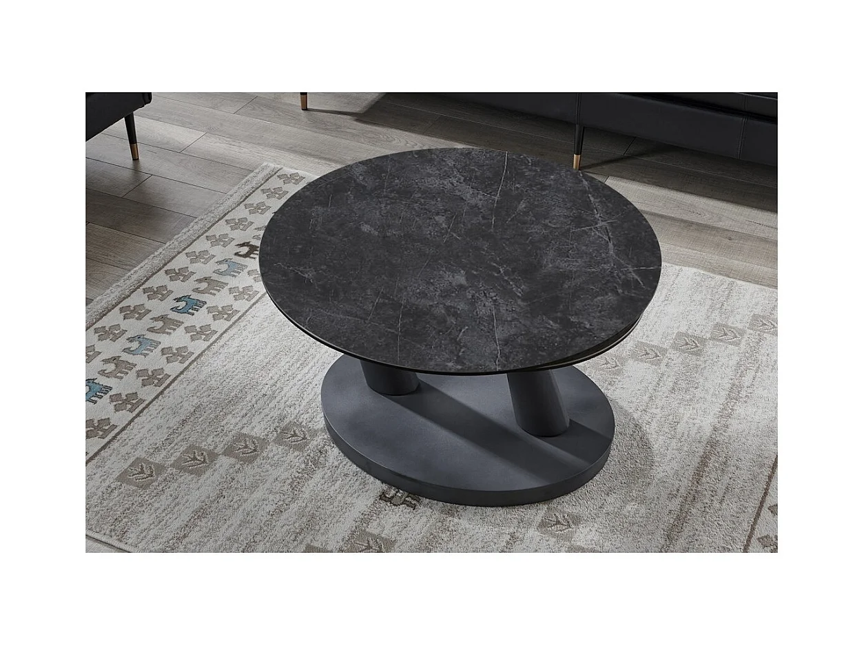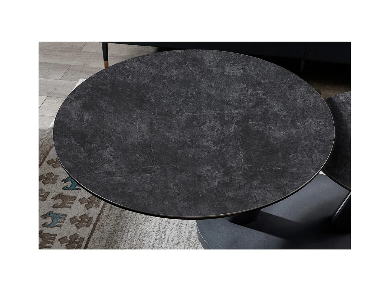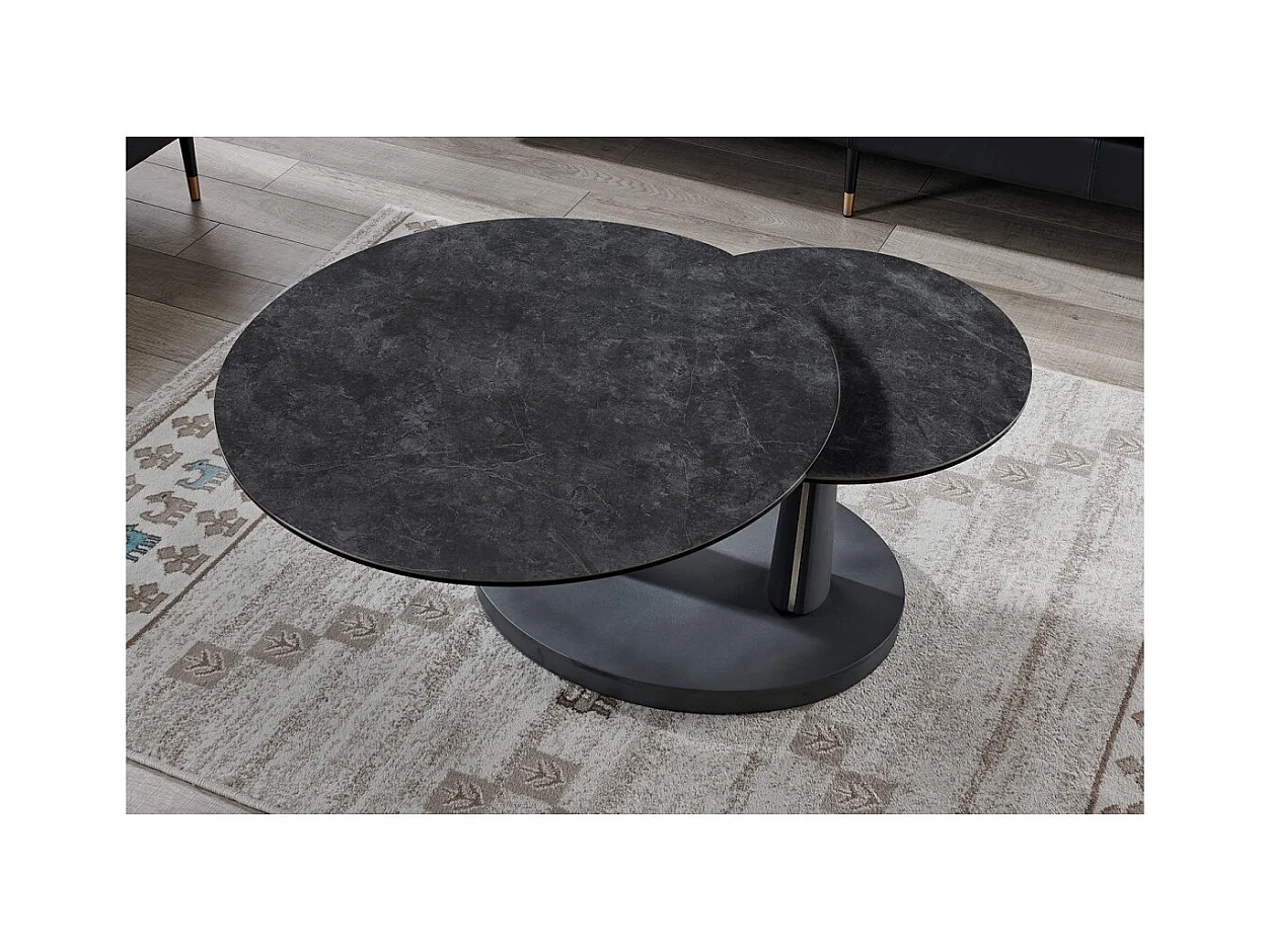 Table baixa VIRELLO – Mesa de centro redonda Ø80 cm – Pedra natural cinza escura & metal – Design contemporâneo e robusto