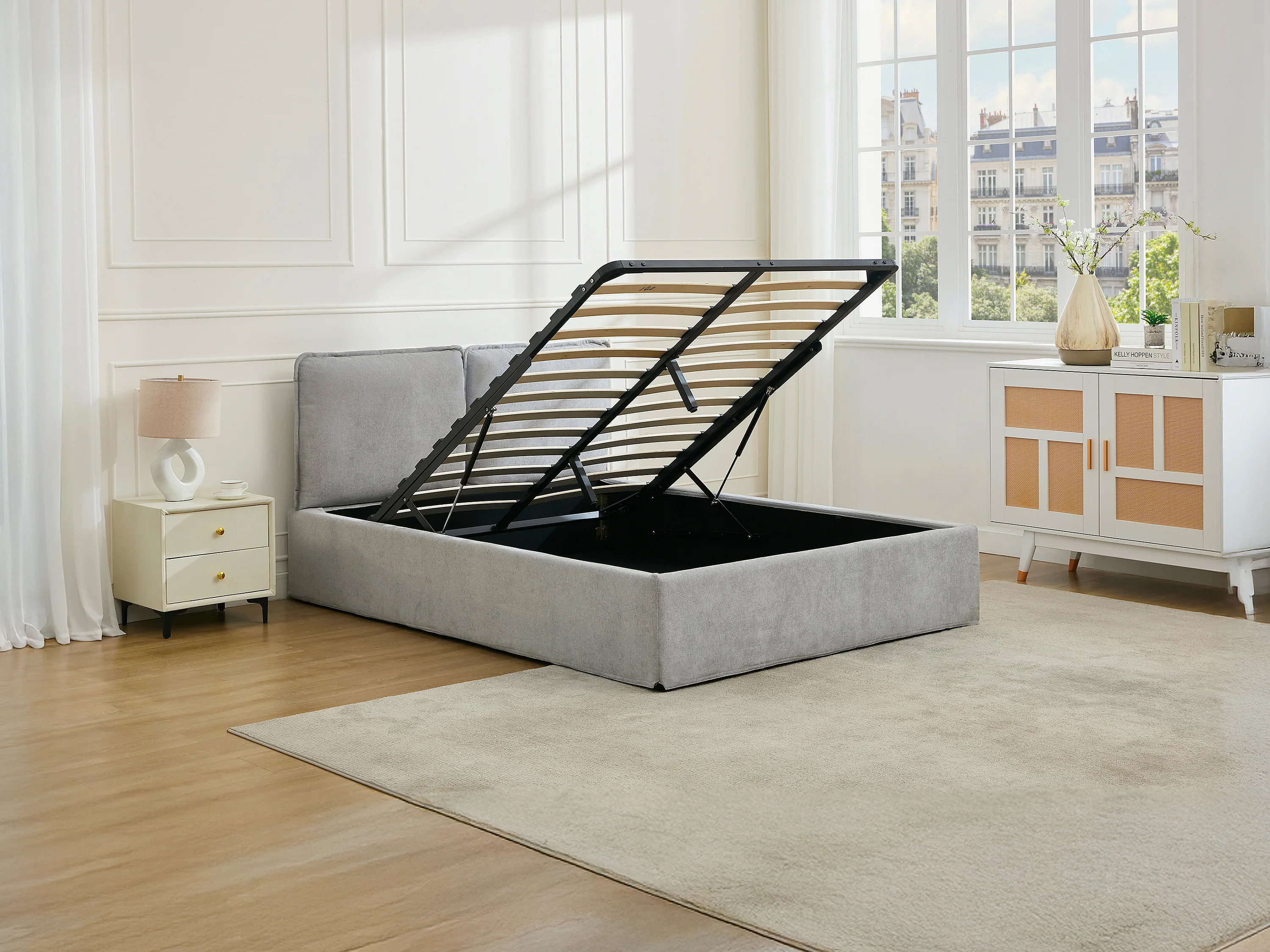 Cama com espaço de arrumação com capa removível 160 x 200 cm - Tecido - Cinzento claro - TENESE