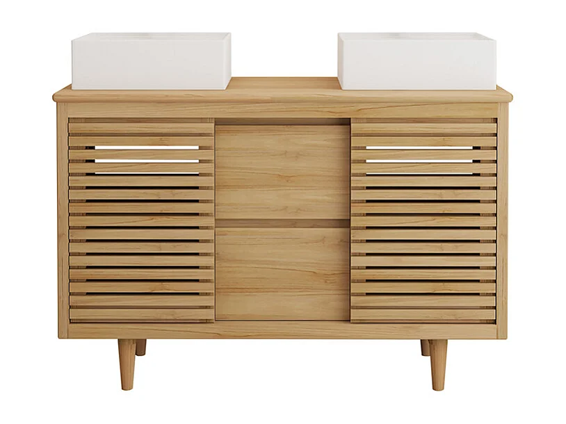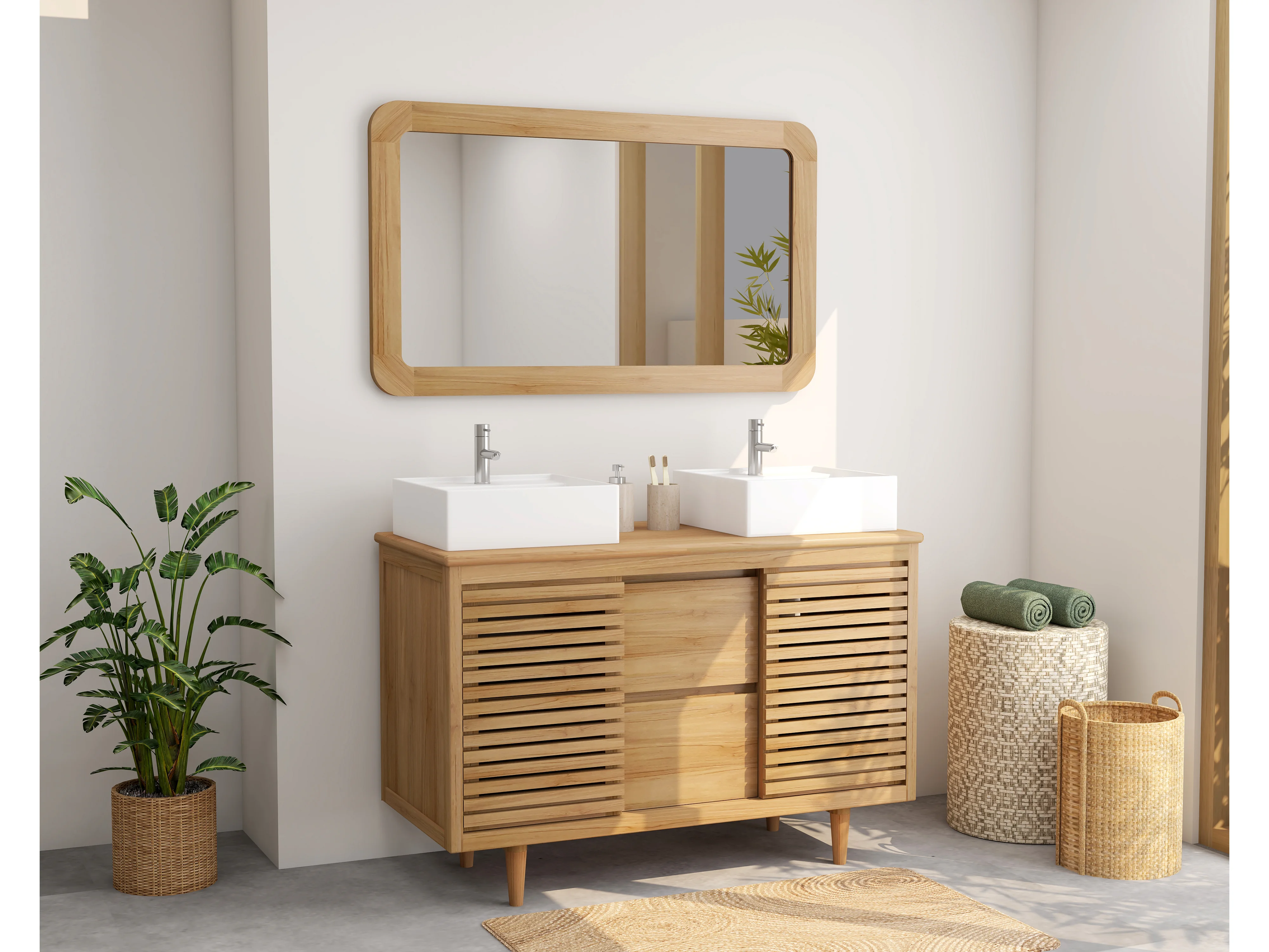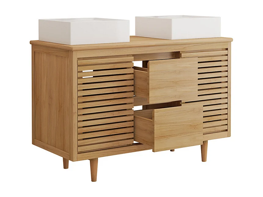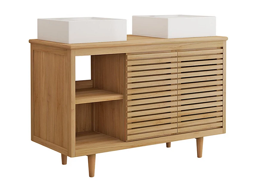 Móvel de casa de banho com pés em teca com lavatório duplo de encastrar quadrado em cerâmica - L120 cm - TORAJA