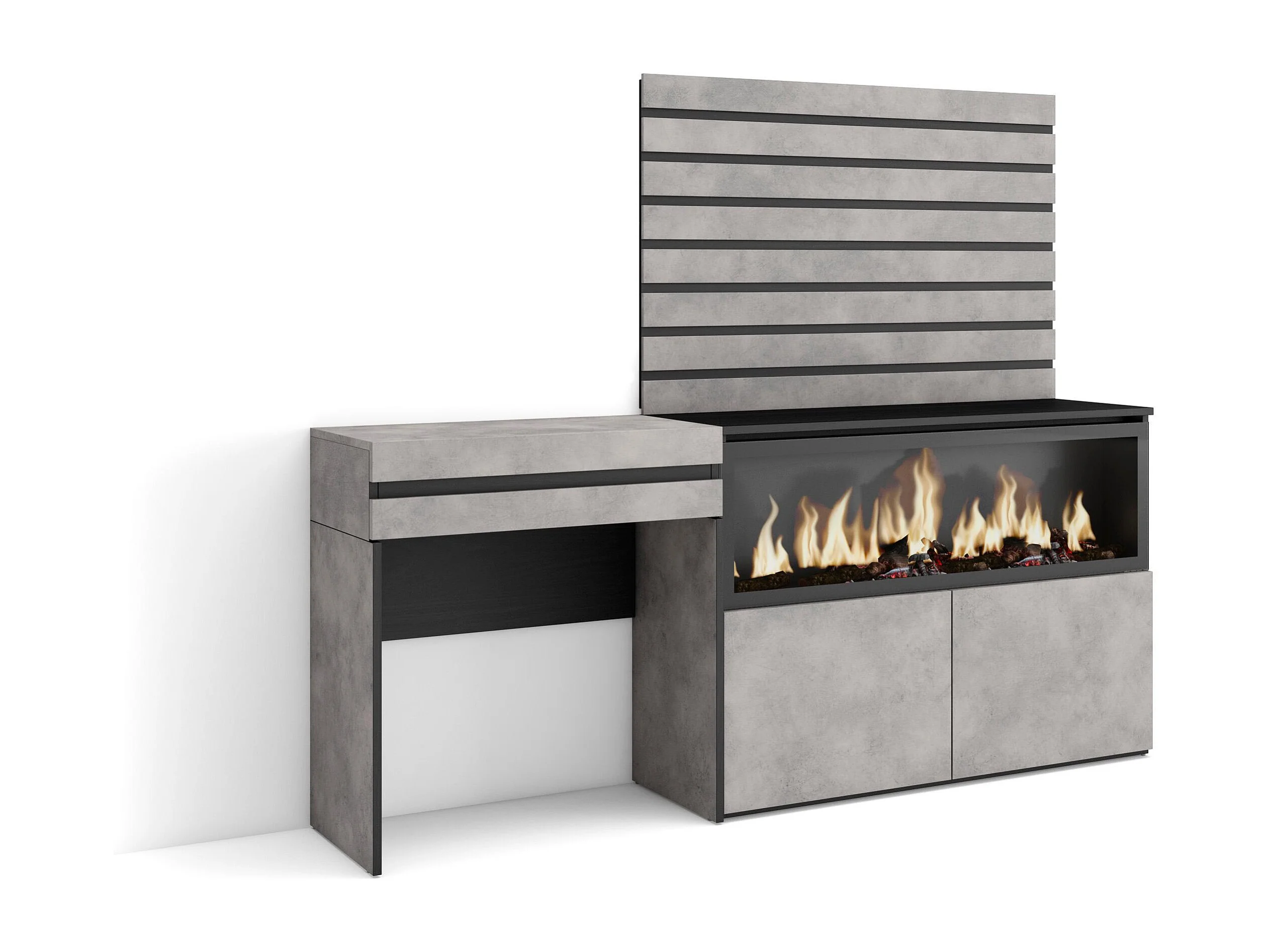 Toucador, 177x35x145cm, Com gaveta, Lareira eléctrica XXL, Tiras Deco. Madeira, Cimento