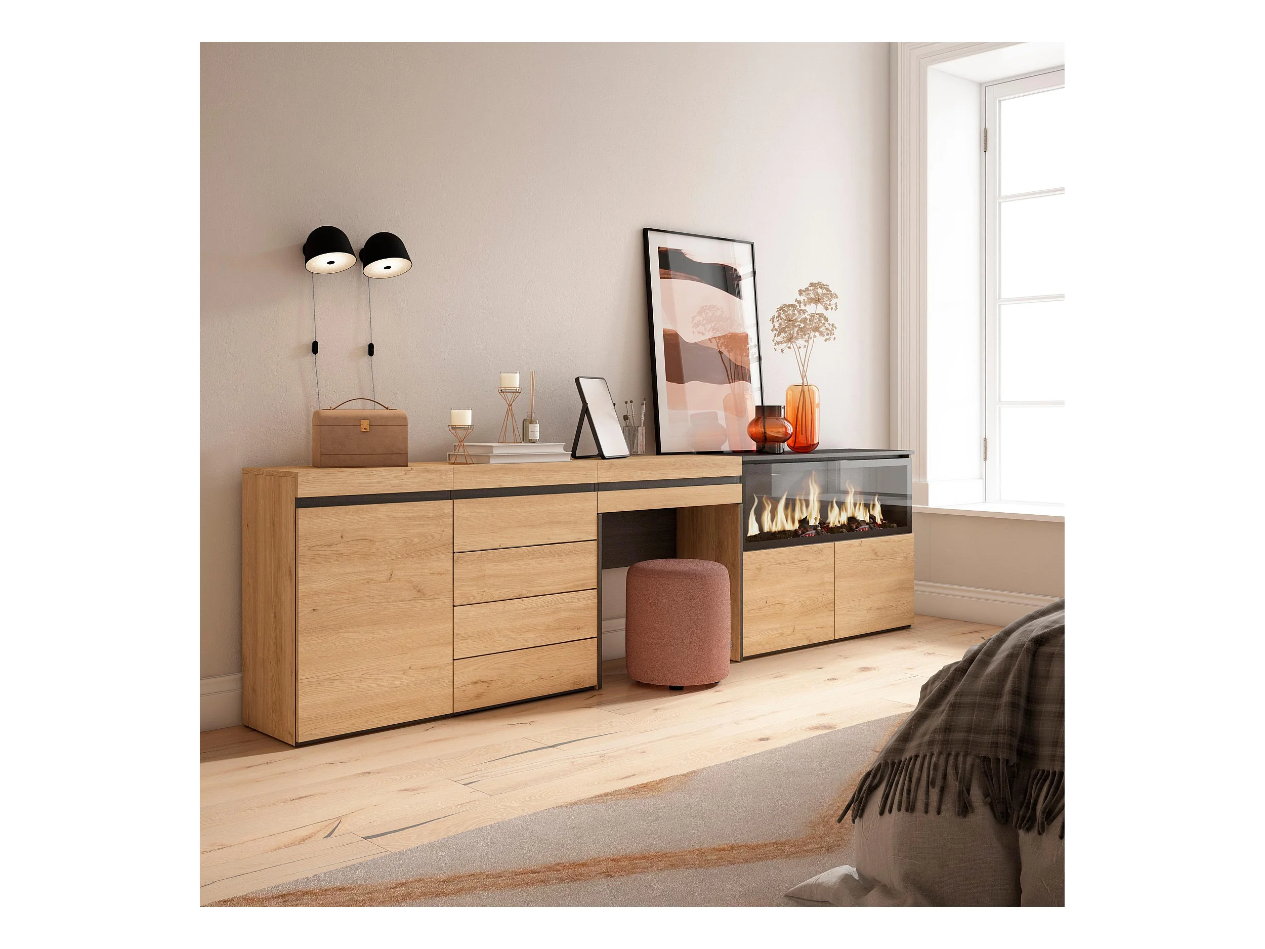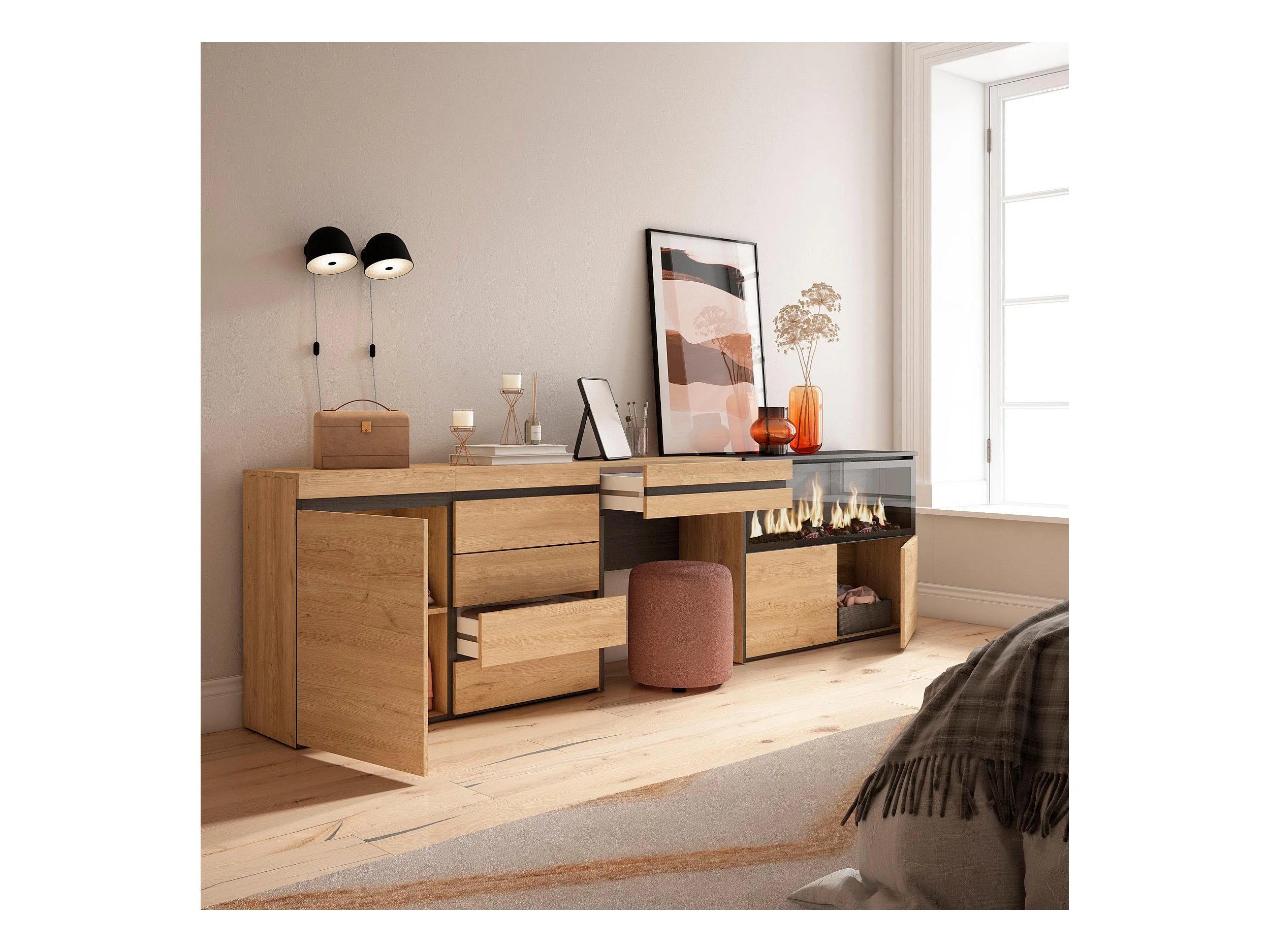 Aparador, Buffet, 334x35x145cm, Para quarto, dormitório, Lareira eléctrica XXL, Cómoda, Sapateira, Roupeiro aberto, Carvalho