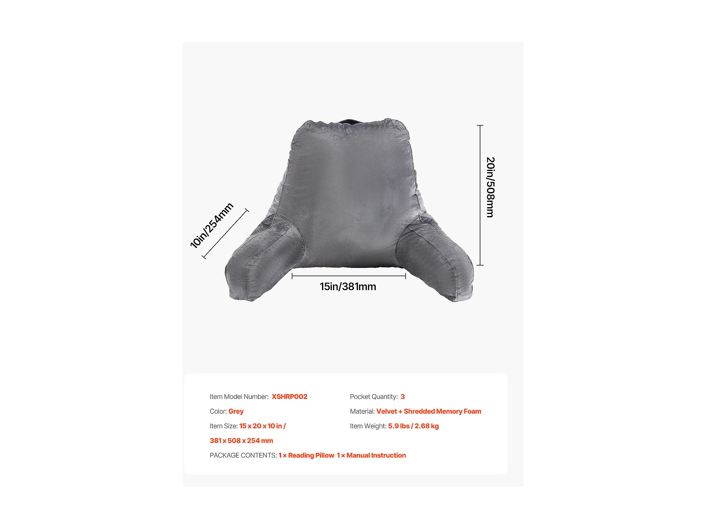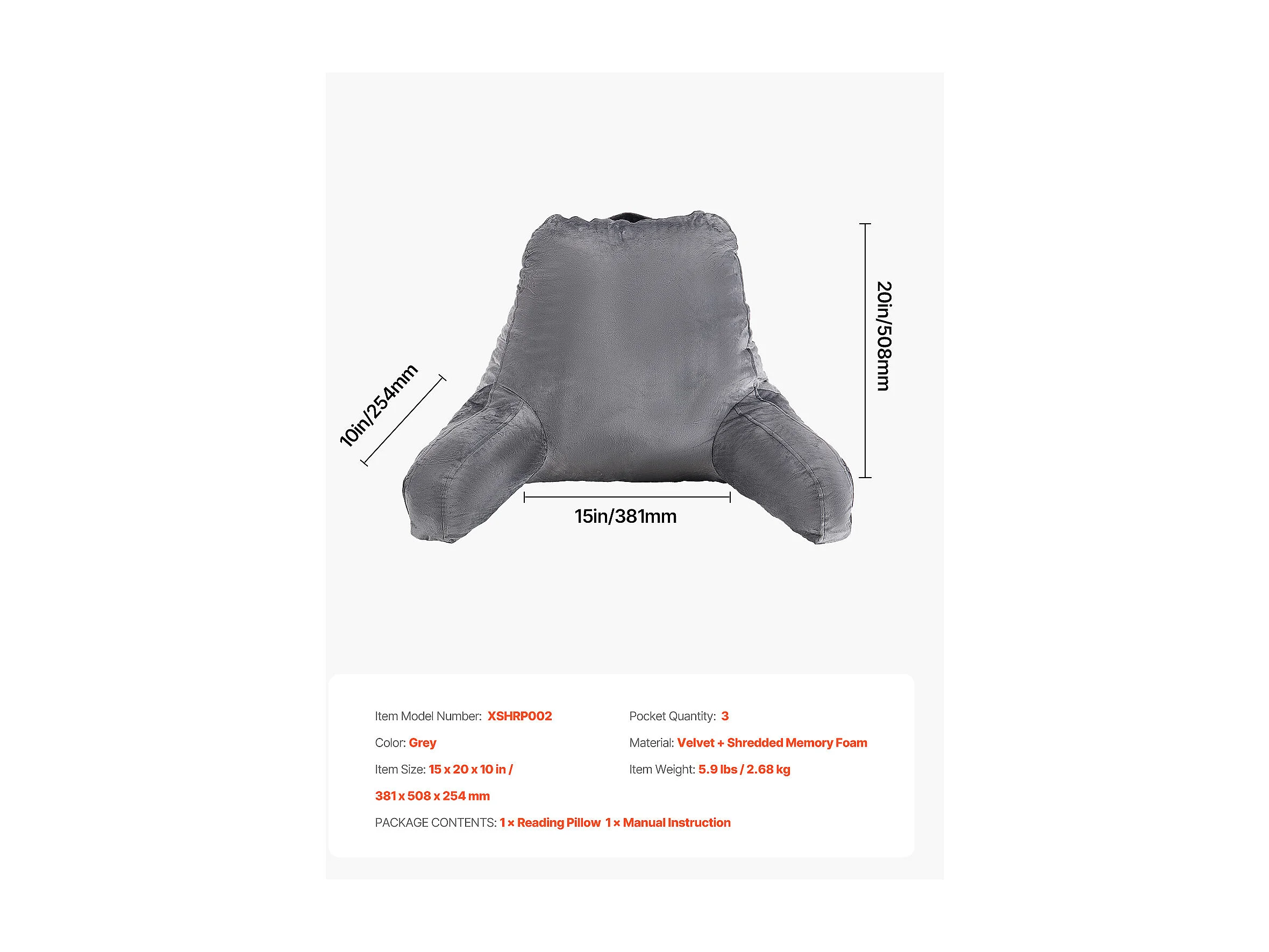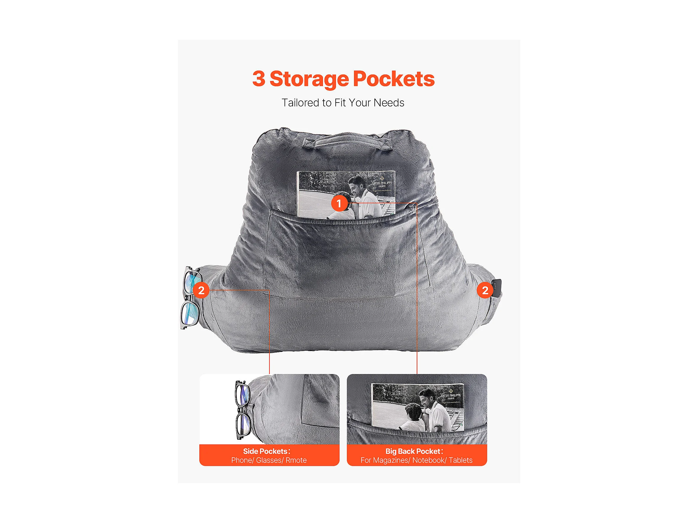 Travesseiro de Leitura SucceBuy em Espuma de Memória, Travesseiro de Apoio ,38.1 x 50.8 x 25.4 cm, com 3 Bolsos e Capa de Veludo Removível