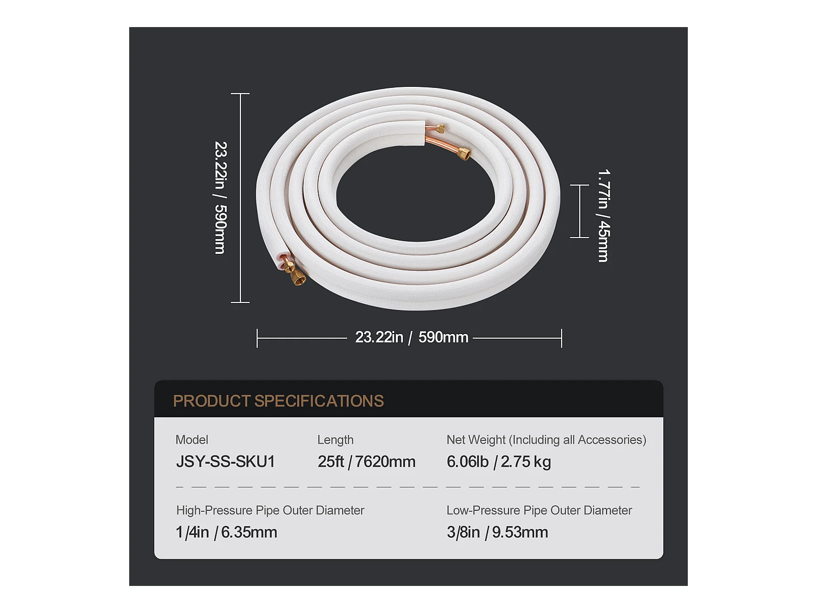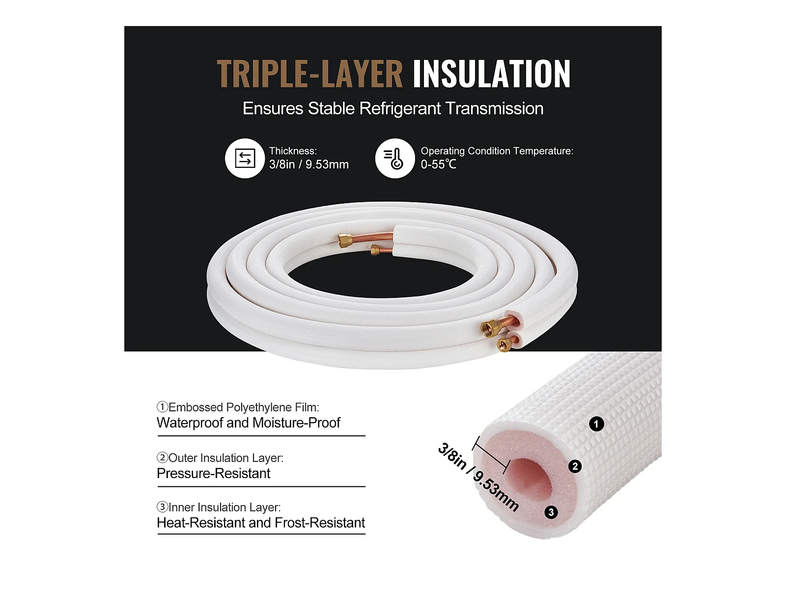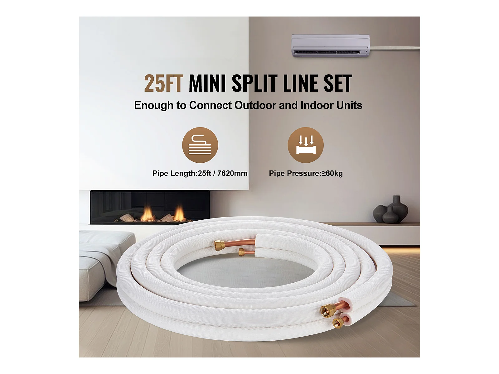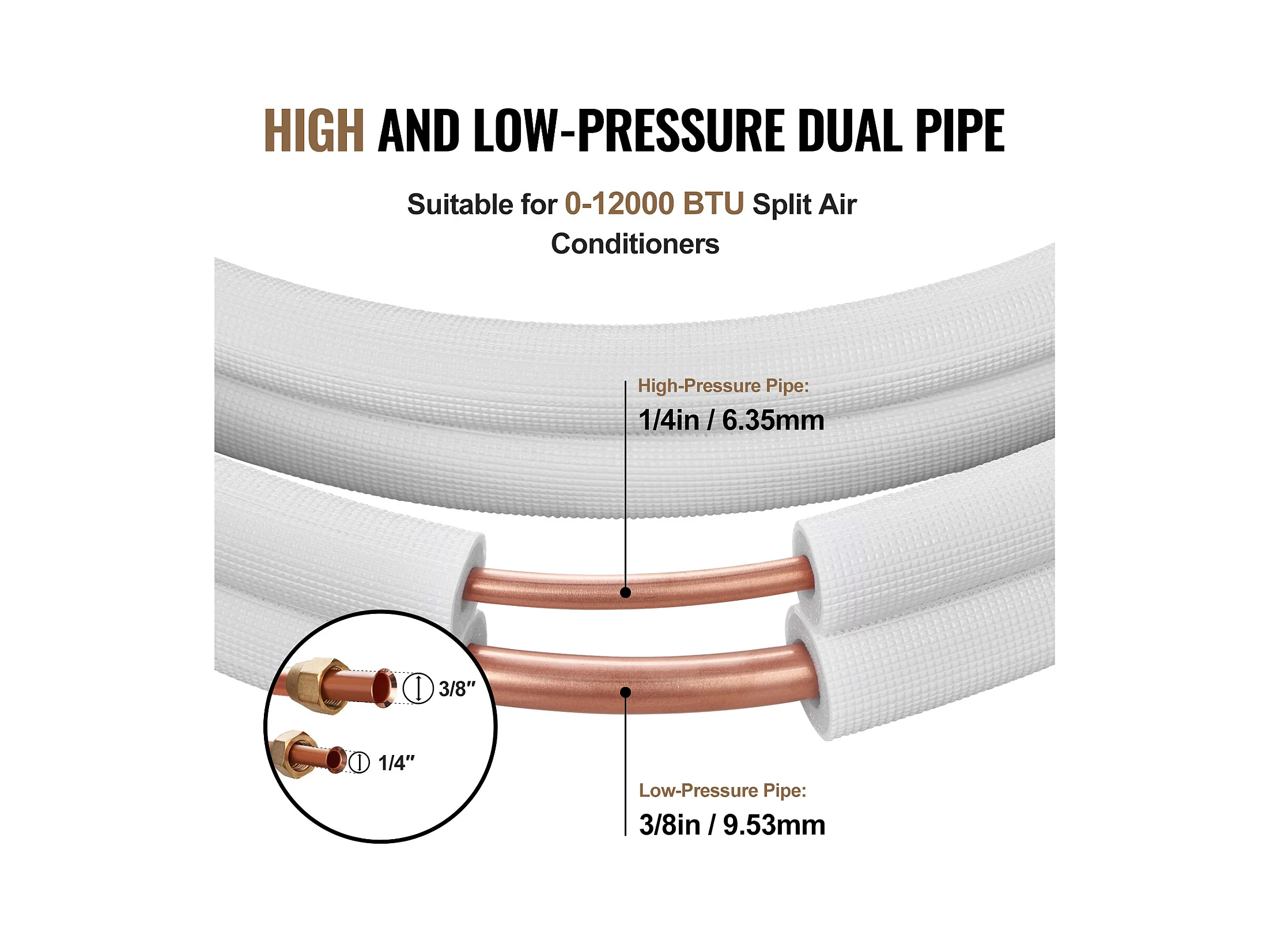 Tubo SucceBuy Conjunto de Mini-Linhas Divididas 6,4 x 9,5 x 7620 mm, Tubos de Cobre Isolados para Ar Condicionado sem Duto