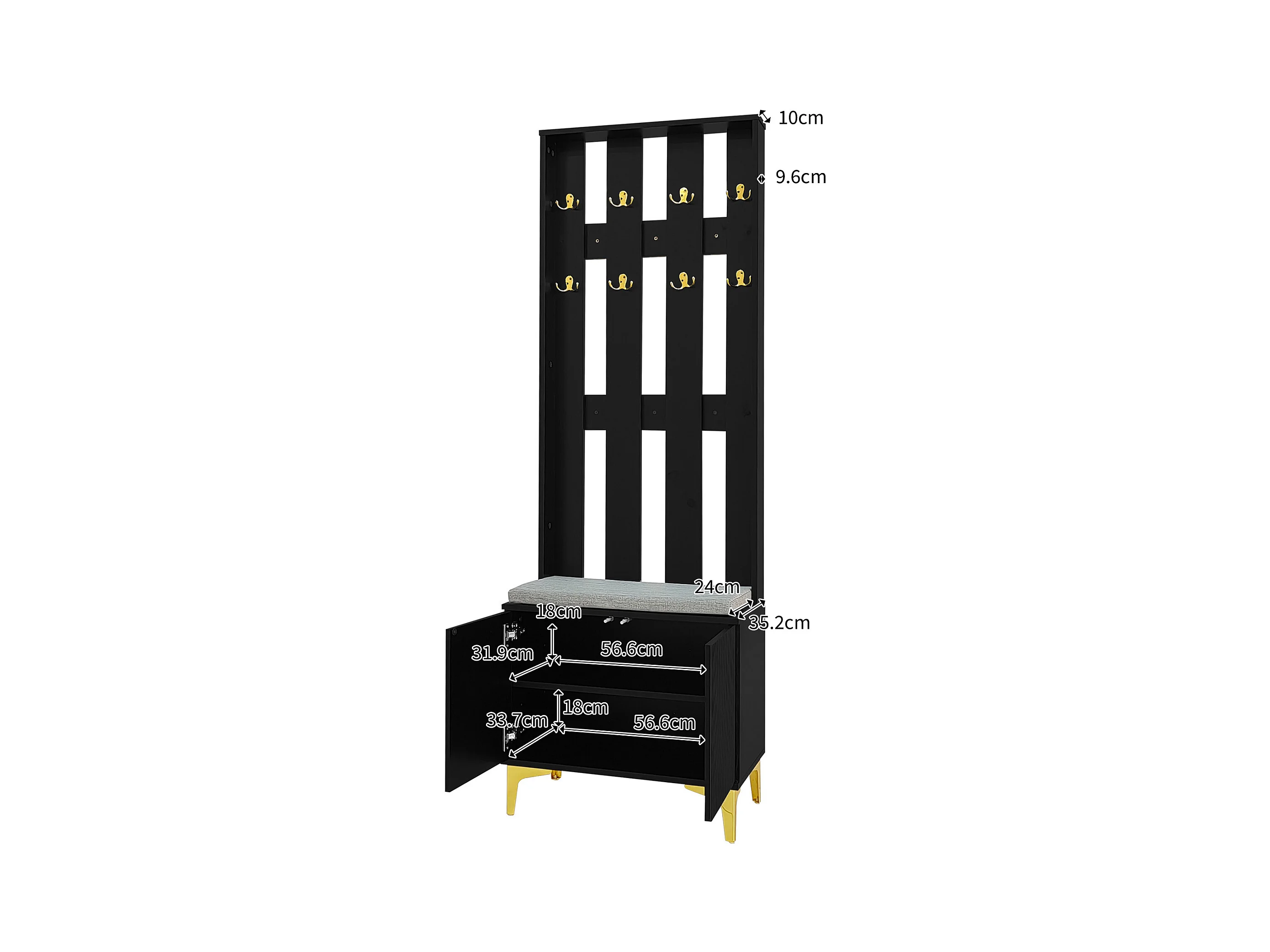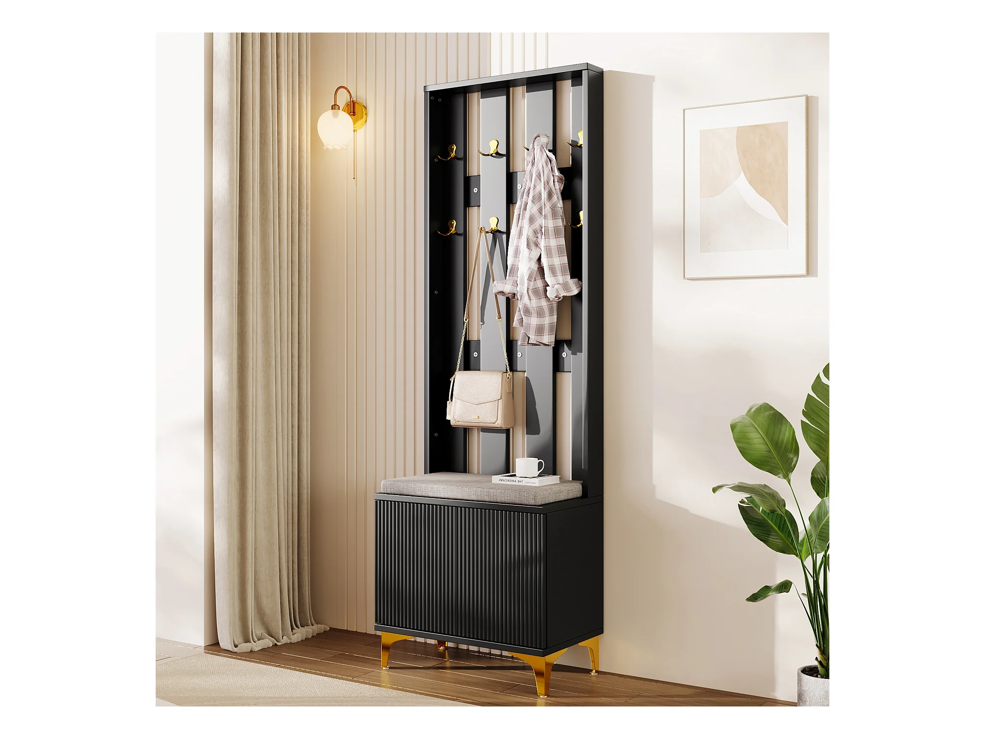 Vestiário de entrada com bengaleiro e banco para guardar sapatos - 120x40x190 cm - Preto
