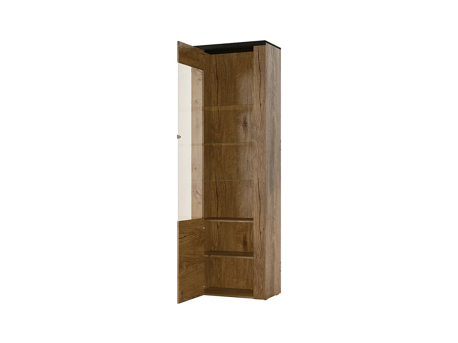 Vitrina alta de design com uma porta e iluminação LED da coleção SANTIAGO. Cor carvalho e preto com efeito de madeira.