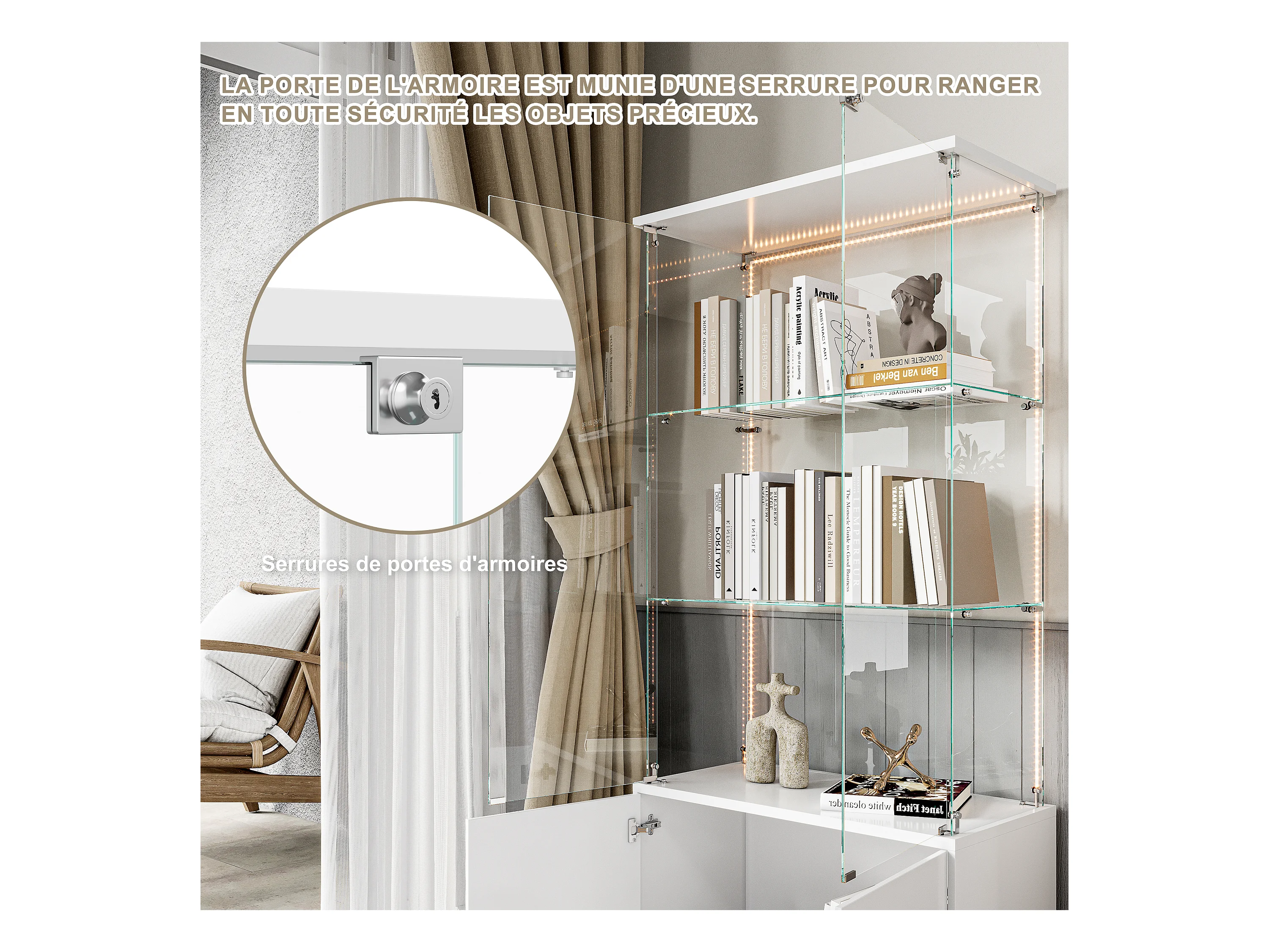 Vitrine de vidro com 3 prateleiras, armários e iluminação LED - Design moderno, Branco