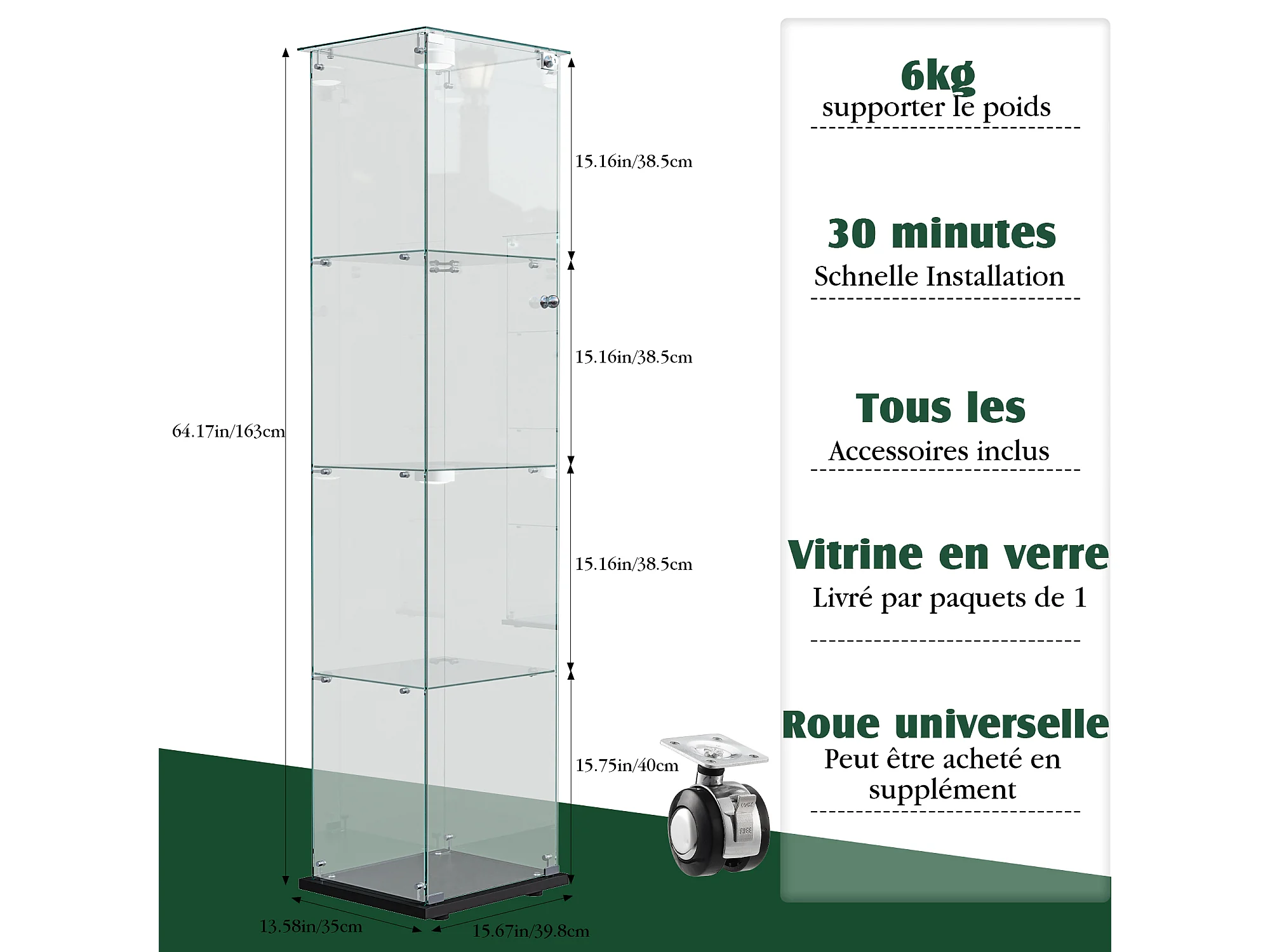 Vitrine de vidro com iluminação LED acionável por toque, portas e prateleiras com fechadura, 163x40x35 cm, preta