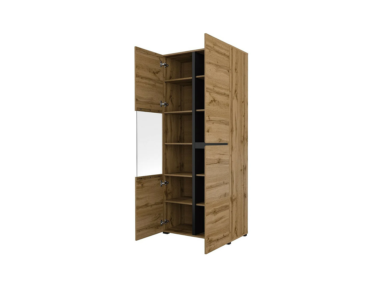 Vitrina alta design com 1 porta coleção SANTIAGO. Cores em carvalho e preto com efeito madeira.